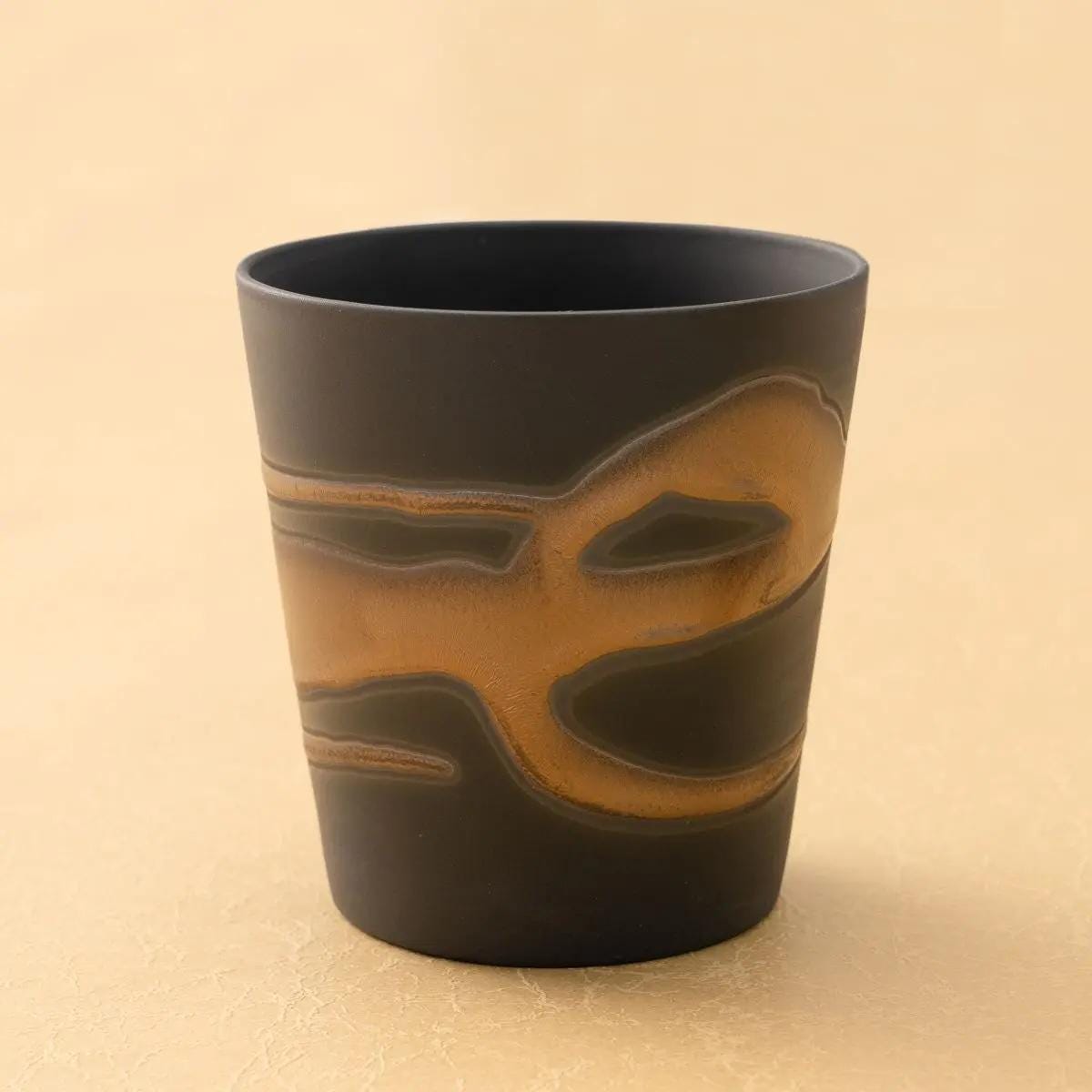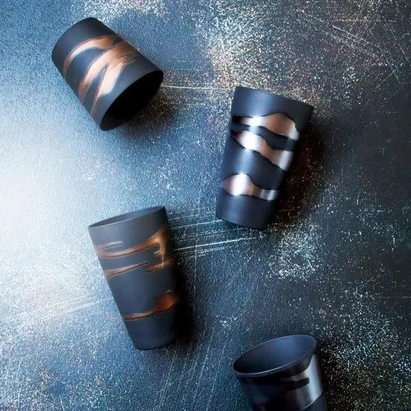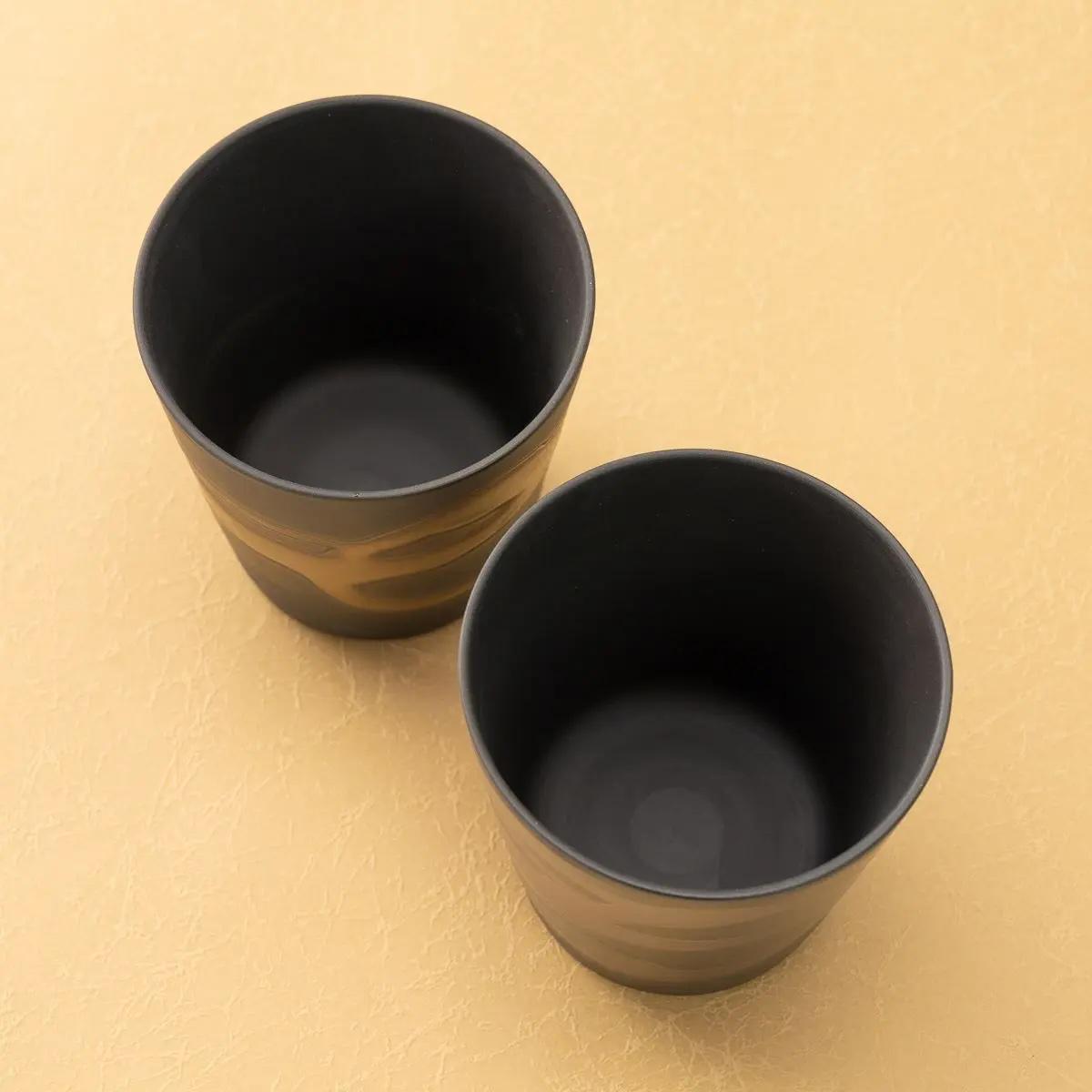This beautiful pair of handmade ceramic rock cups is a testament to Japanese artistry, crafted by the renowned potter Shigeharu Tabata. The unique "Kin-Gin Nagashi" (Gold & Silver Flow) glaze creates a stunning, flowing pattern that gives each cup a one-of-a-kind texture and sophisticated elegance.