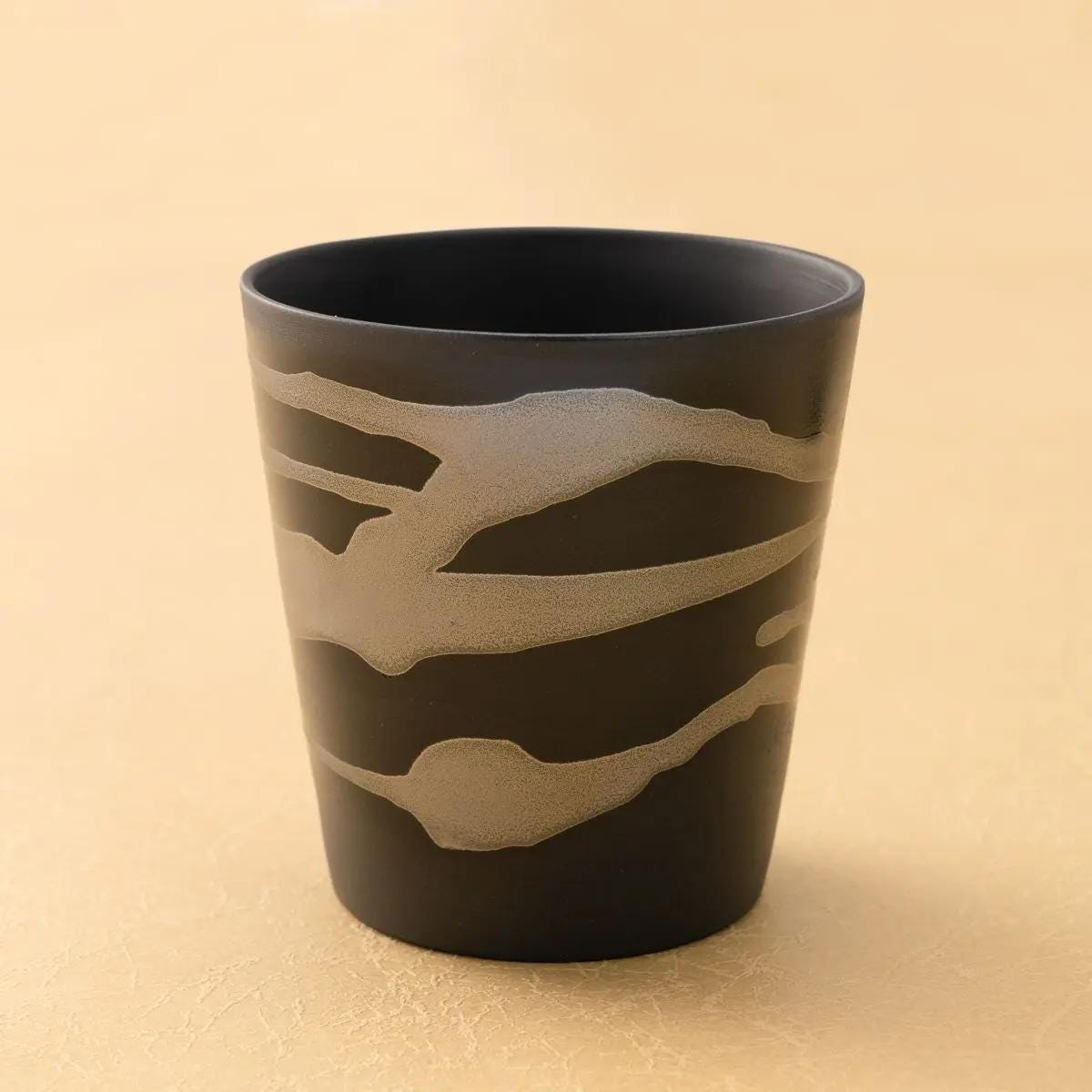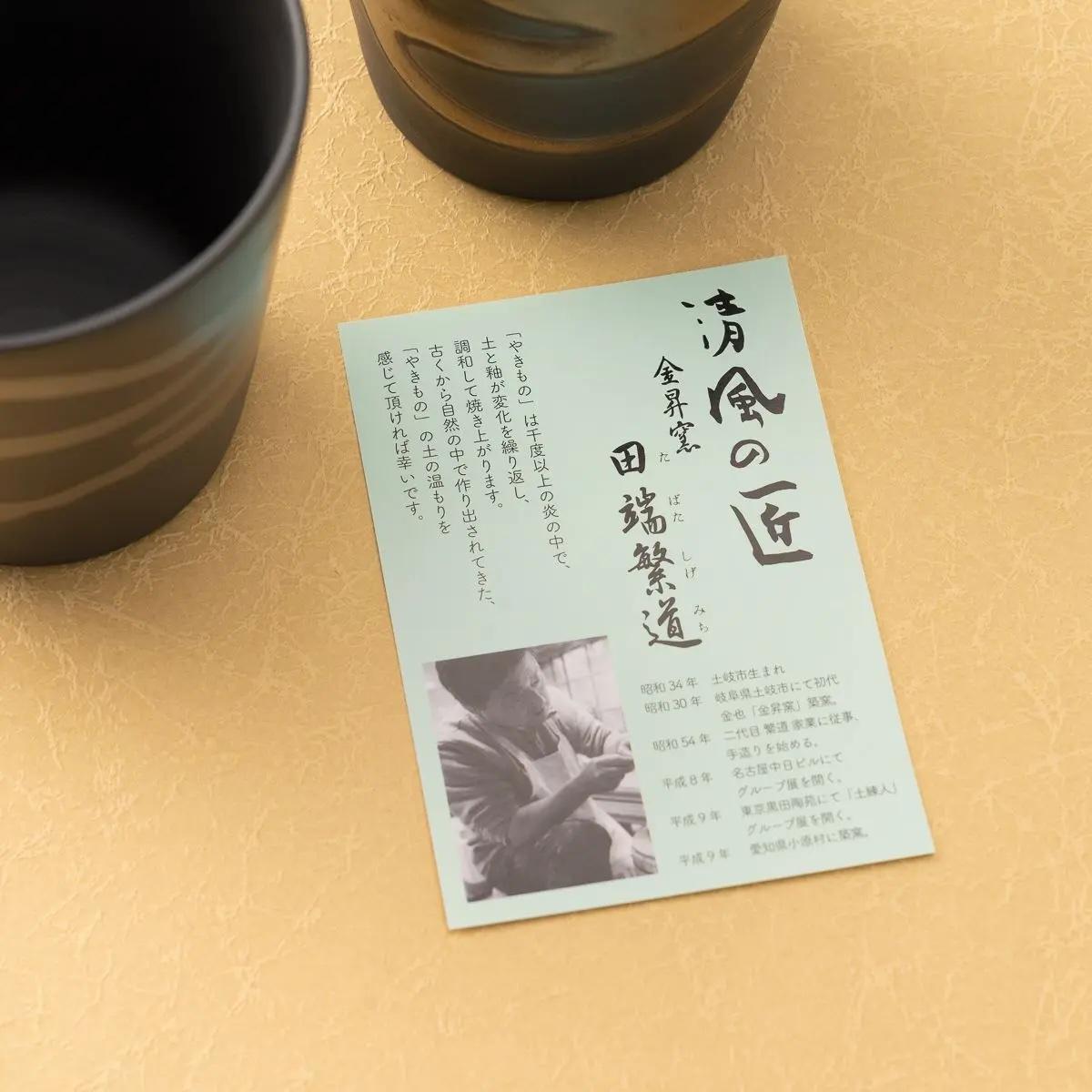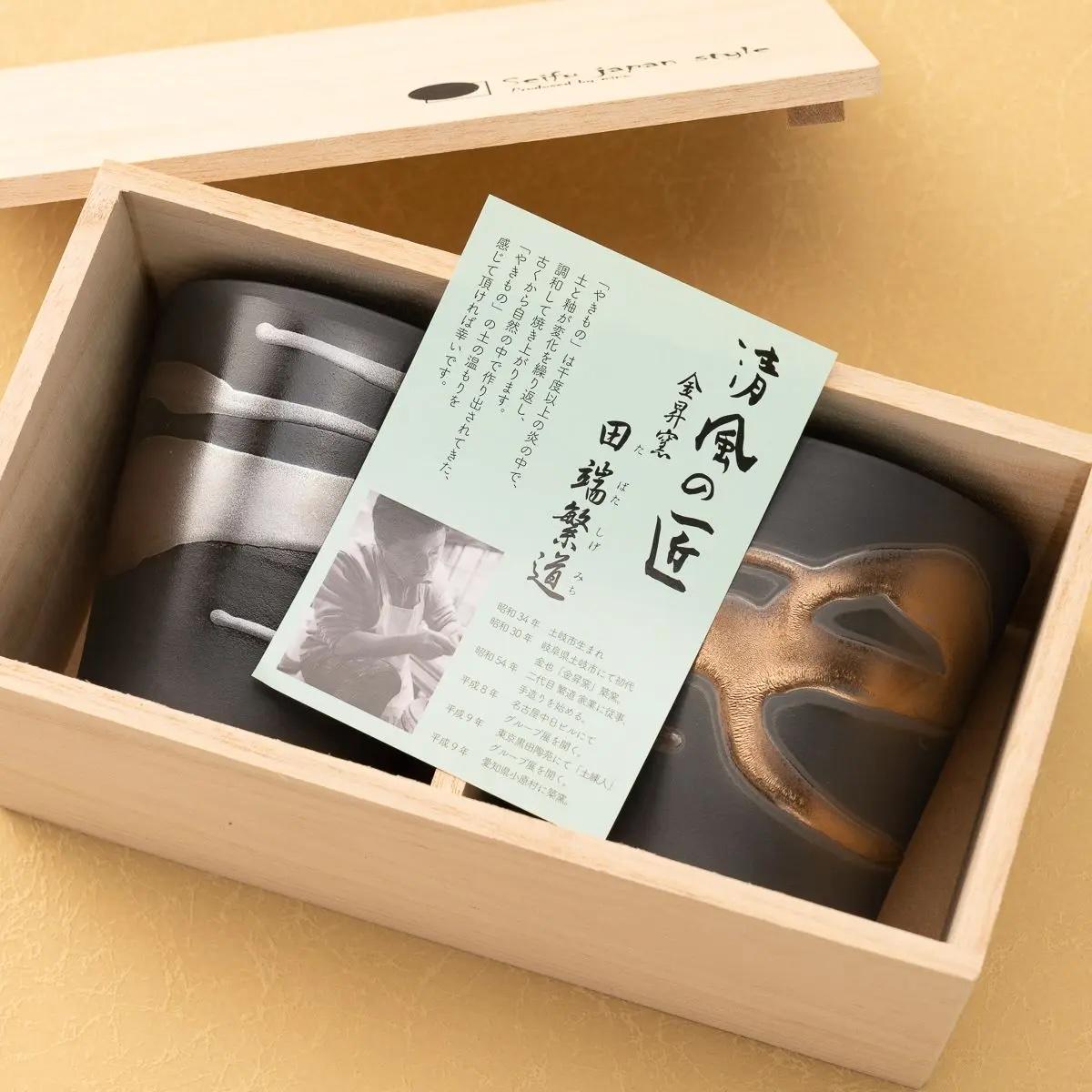 This beautiful pair of handmade ceramic rock cups is a testament to Japanese artistry, crafted by the renowned potter Shigeharu Tabata. The unique "Kin-Gin Nagashi" (Gold & Silver Flow) glaze creates a stunning, flowing pattern that gives each cup a one-of-a-kind texture and sophisticated elegance.