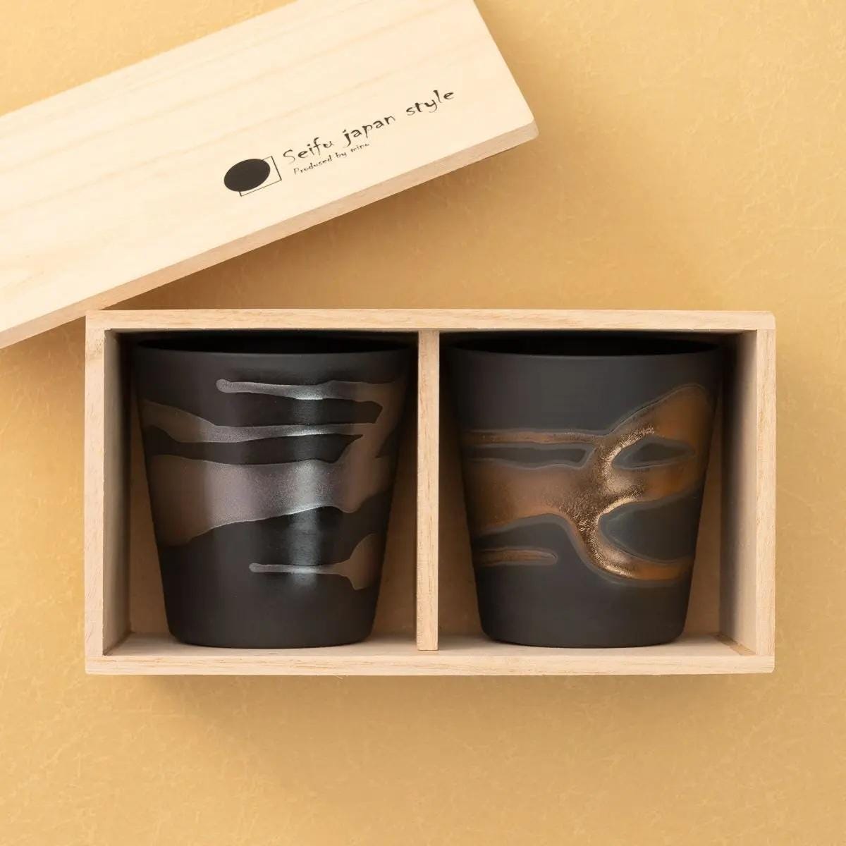 Handmade Japanese Ceramic Rock Cup Pair - Kin-Gin Nagashi Glaze, Textured Artisan Drinkware with Wooden Box, Made in Japan| Forgot Souvenir