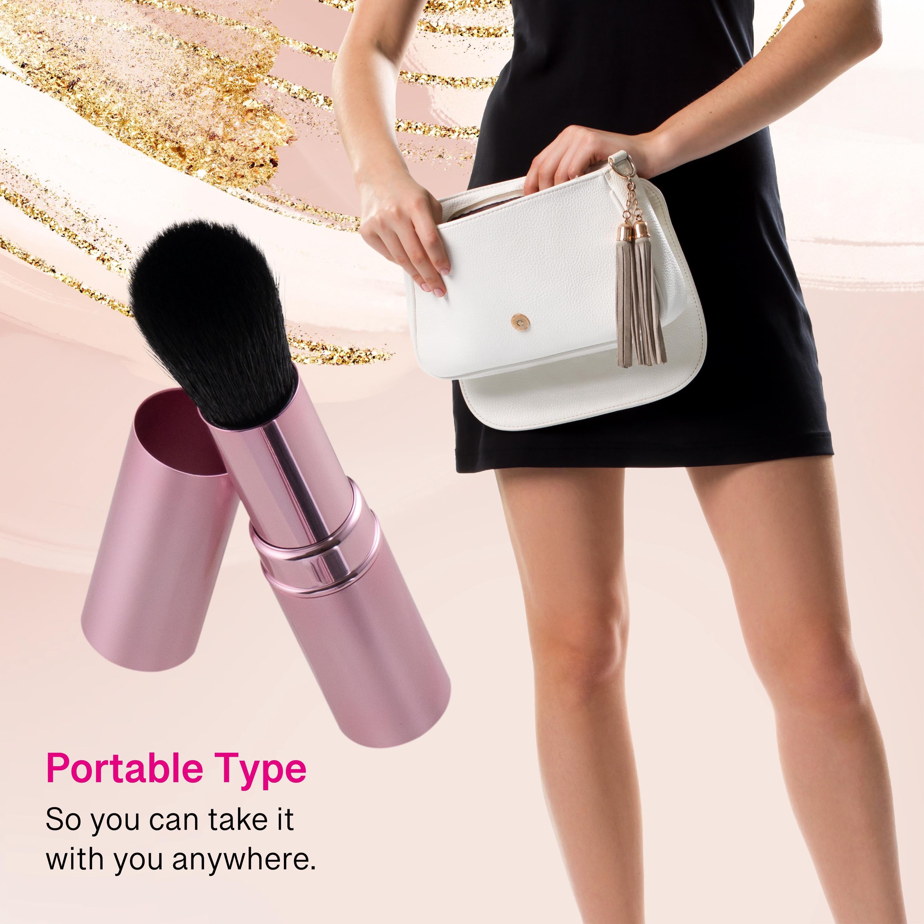 This retractable makeup brush features a sleek metallic handle and ultra-soft, dense goat hair bristles for a seamless, streak-free application. Its compact, travel-friendly design makes it perfect for touch-ups wherever you go. The brush is ideal for applying blush, contour, or setting powder with ease and elegance.