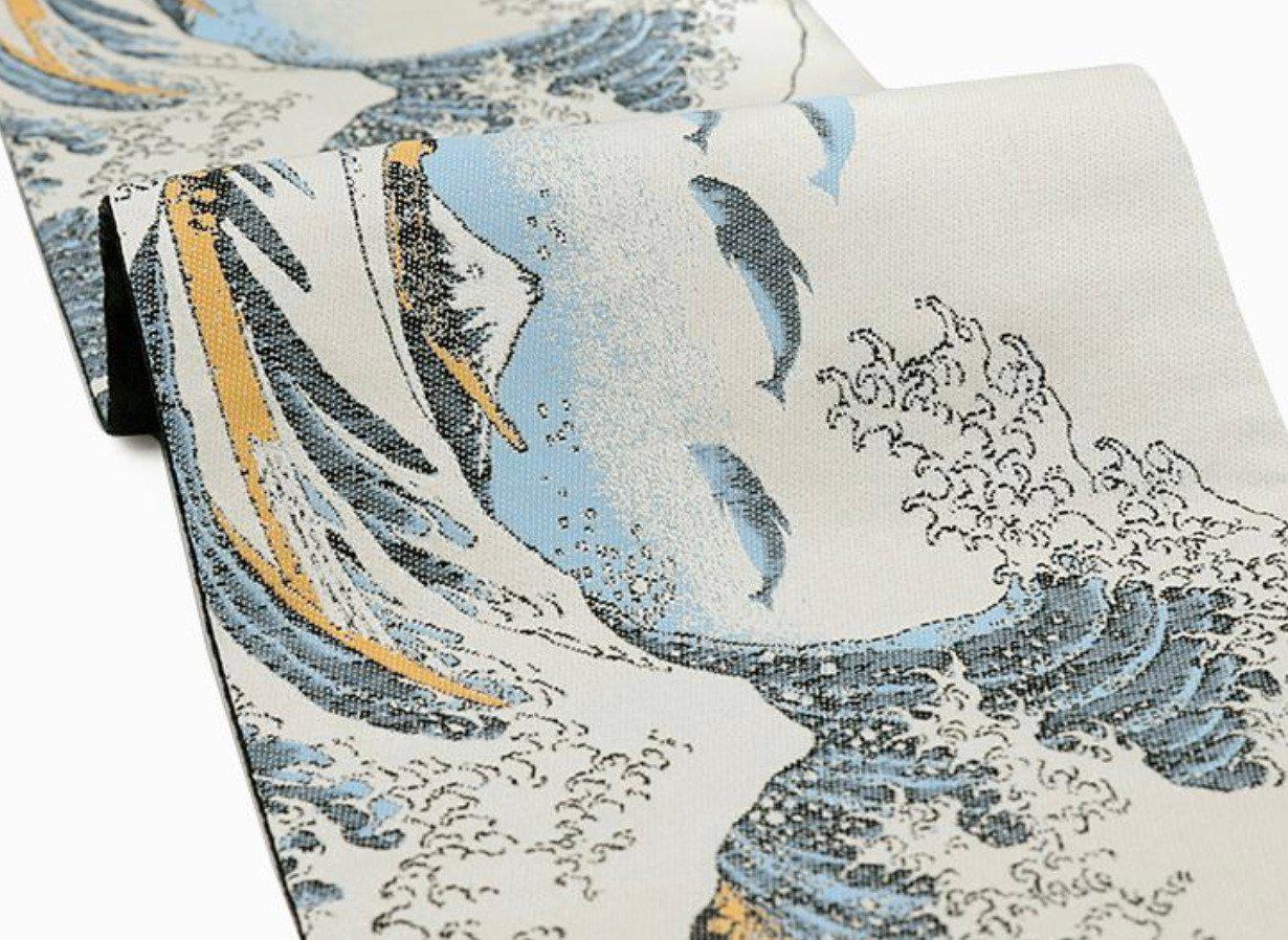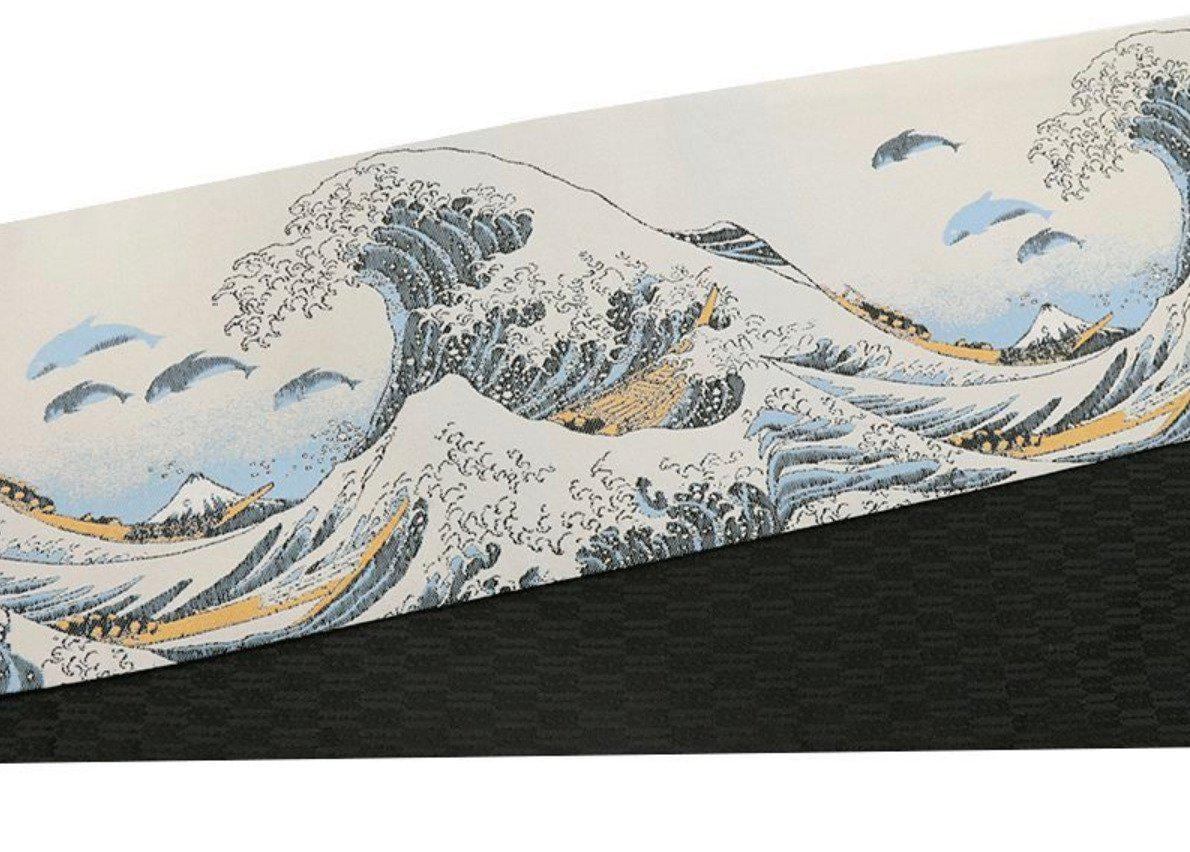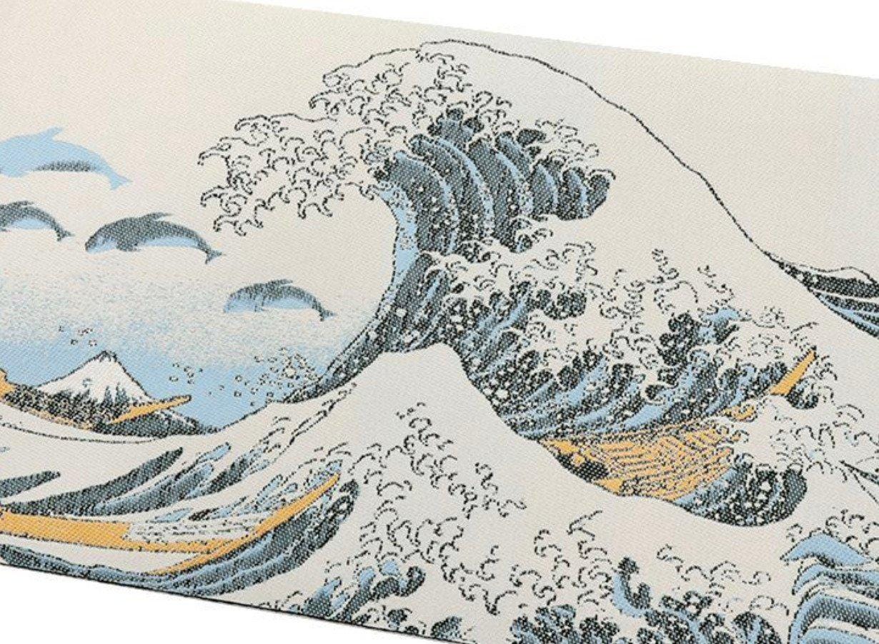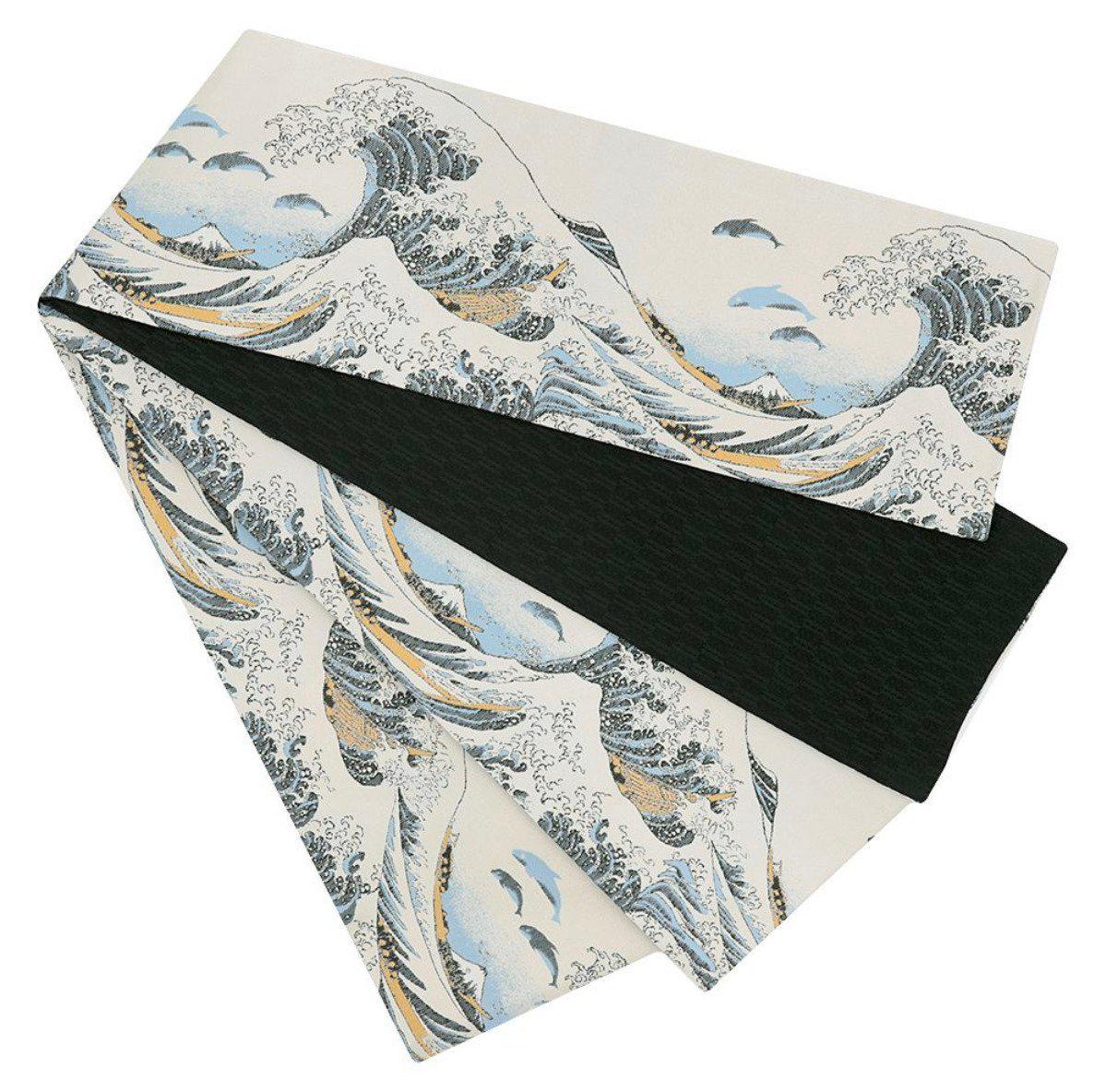 New!! Japanese Hanhaba Obi by Seishin - Hokusai Great Wave & Orca Design - Reversible Belt with Black Arrow Pattern - 153.5in (390cm)