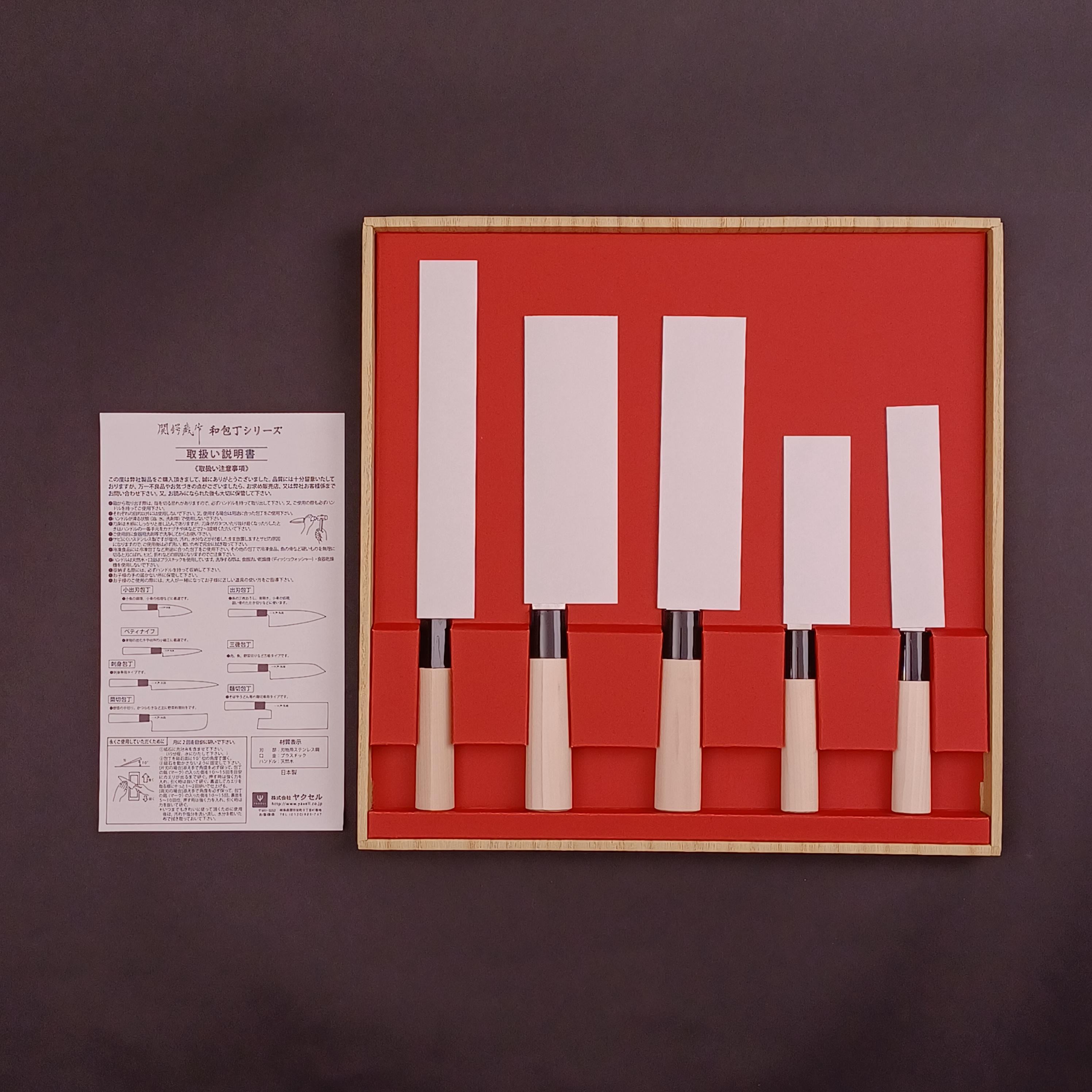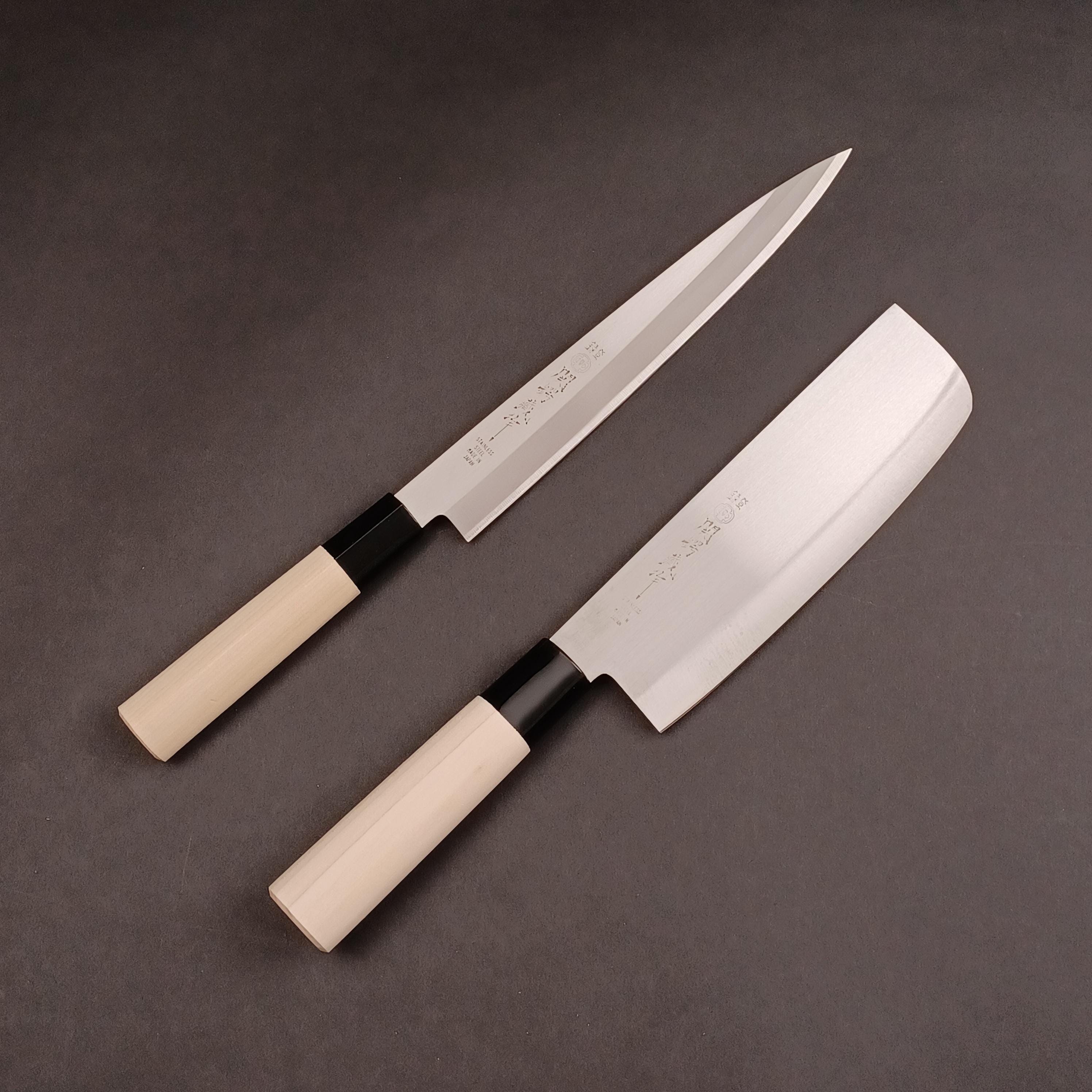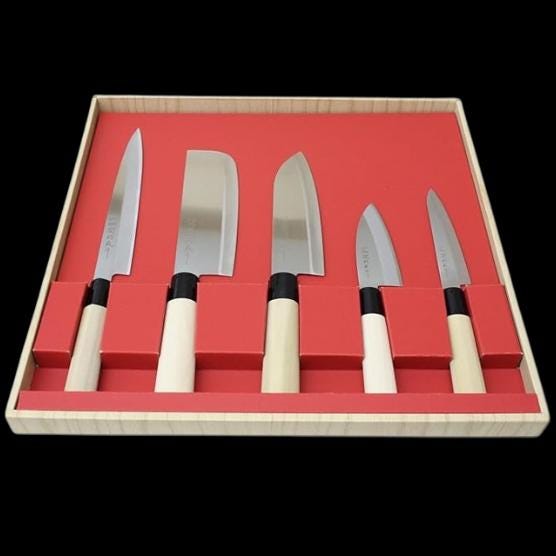 Quantity: 5 knives (Sashimi, Santoku, Nakiri, Deba, Petty)