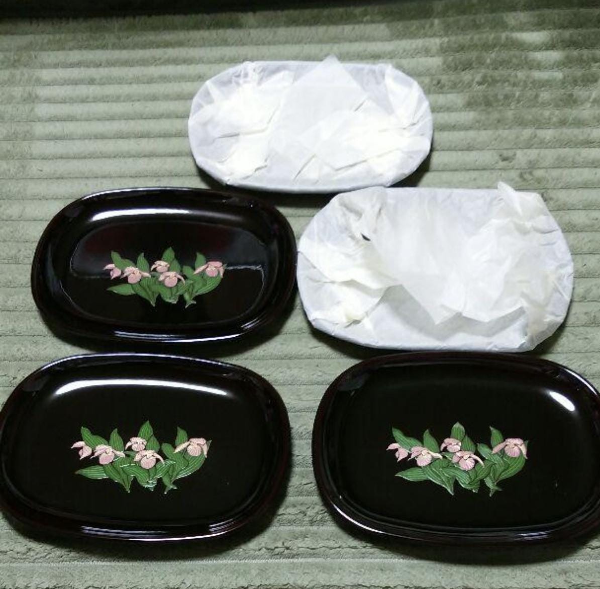 Unused Japanese Lacquerware Sweet Plates – Set of 5 Red & Black Dessert Dishes with Pink Flower Design | Traditional Aizu-nuri Look