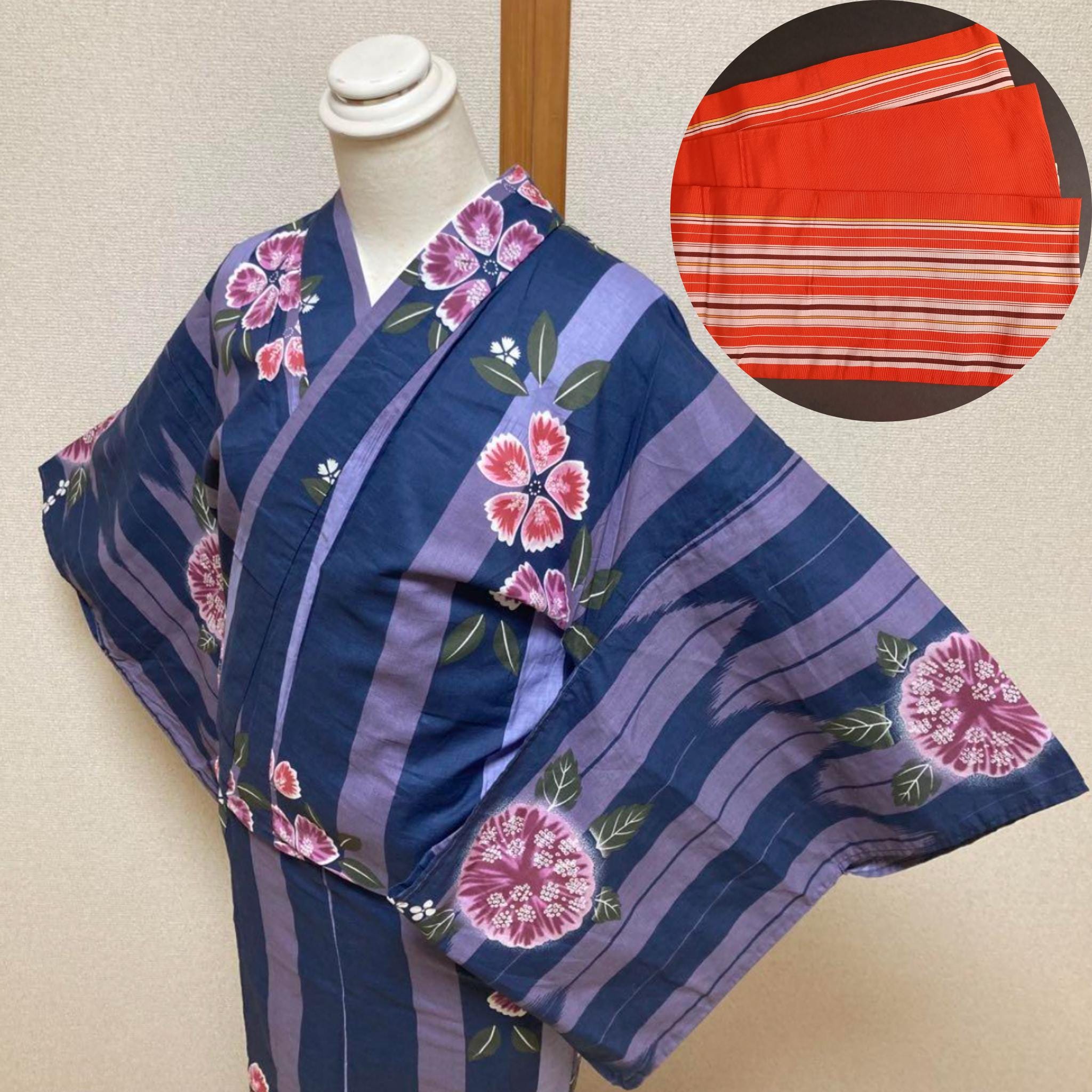 This is a complete yukata dressing set that includes a used blue yukata, a used half-width obi, and new optional accessories to help beginners dress easily and beautifully.