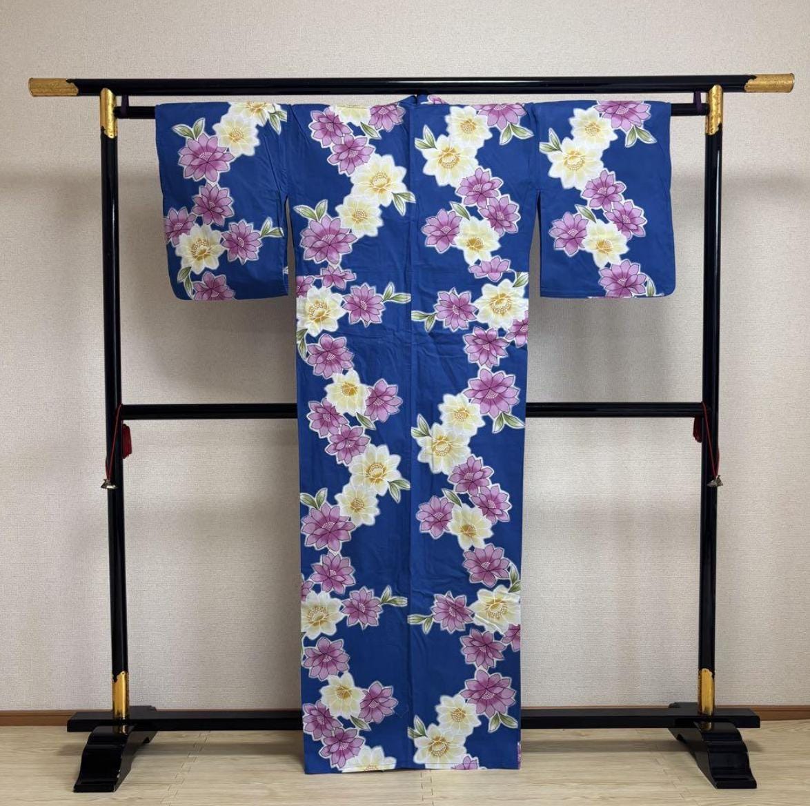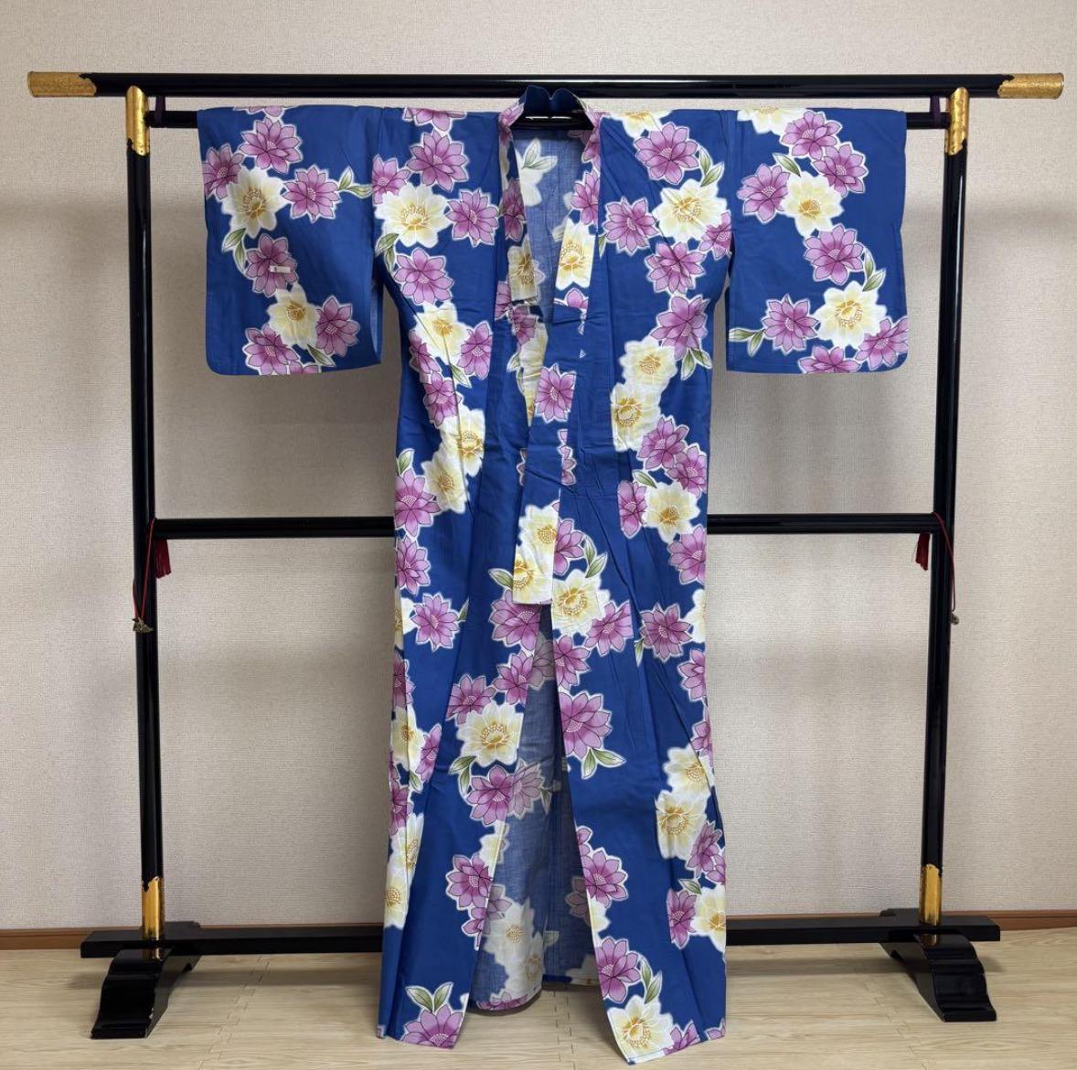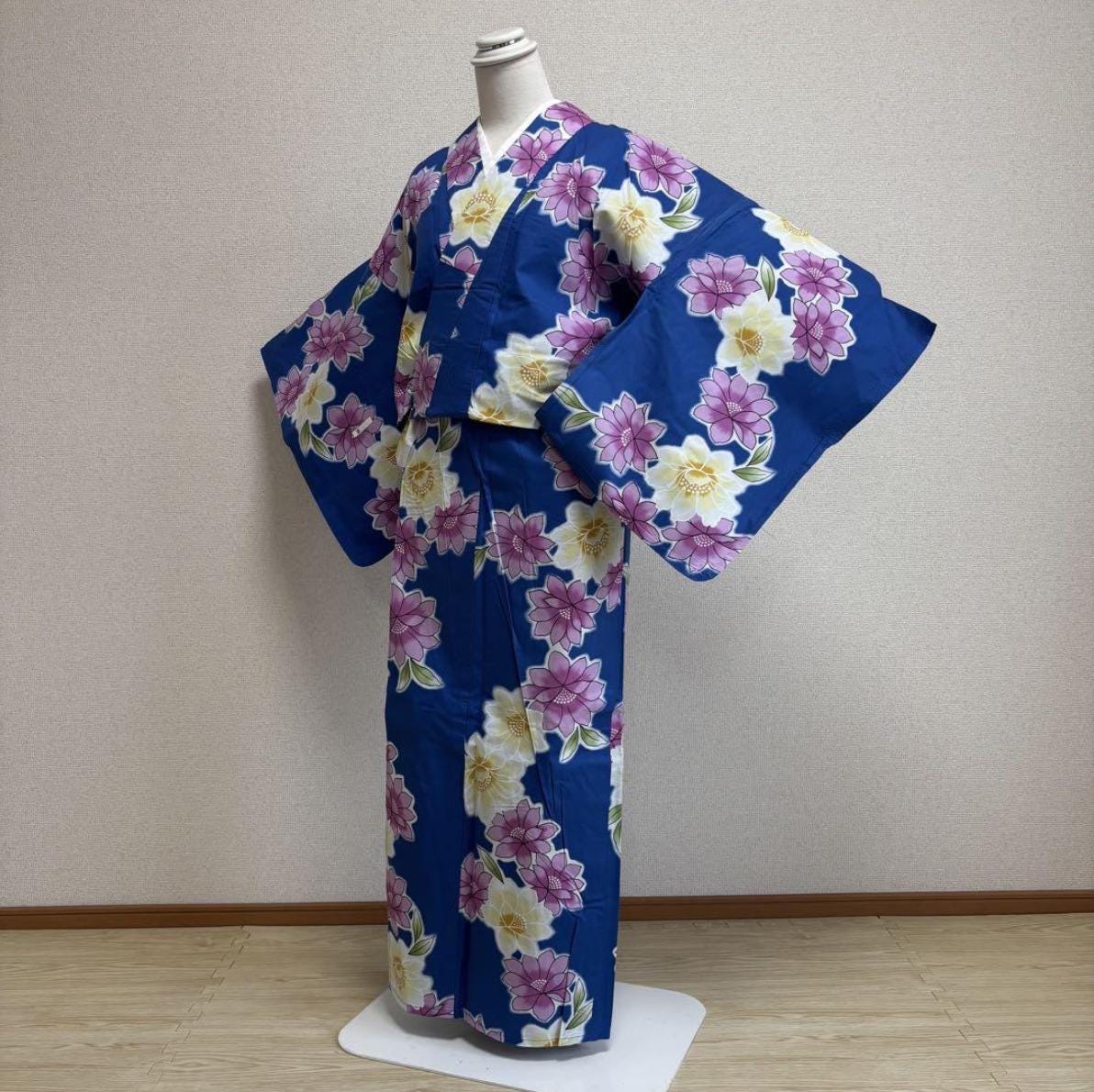 This is a complete yukata dressing set that includes a used blue yukata, a used half-width obi, and new optional accessories to help beginners dress easily and beautifully.