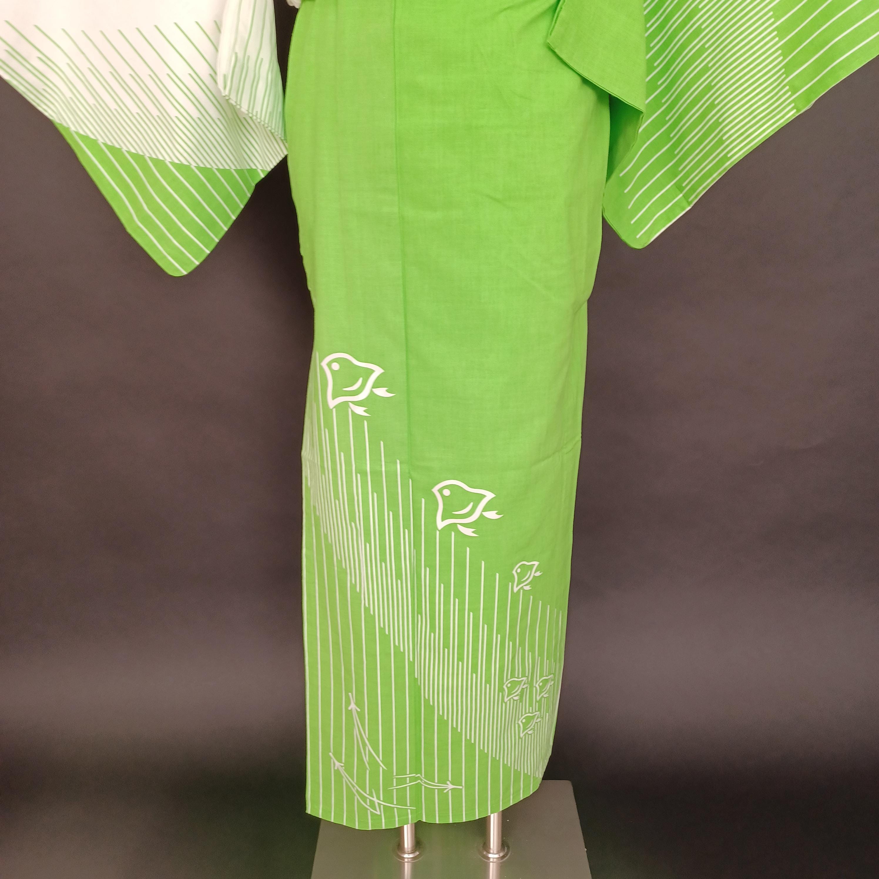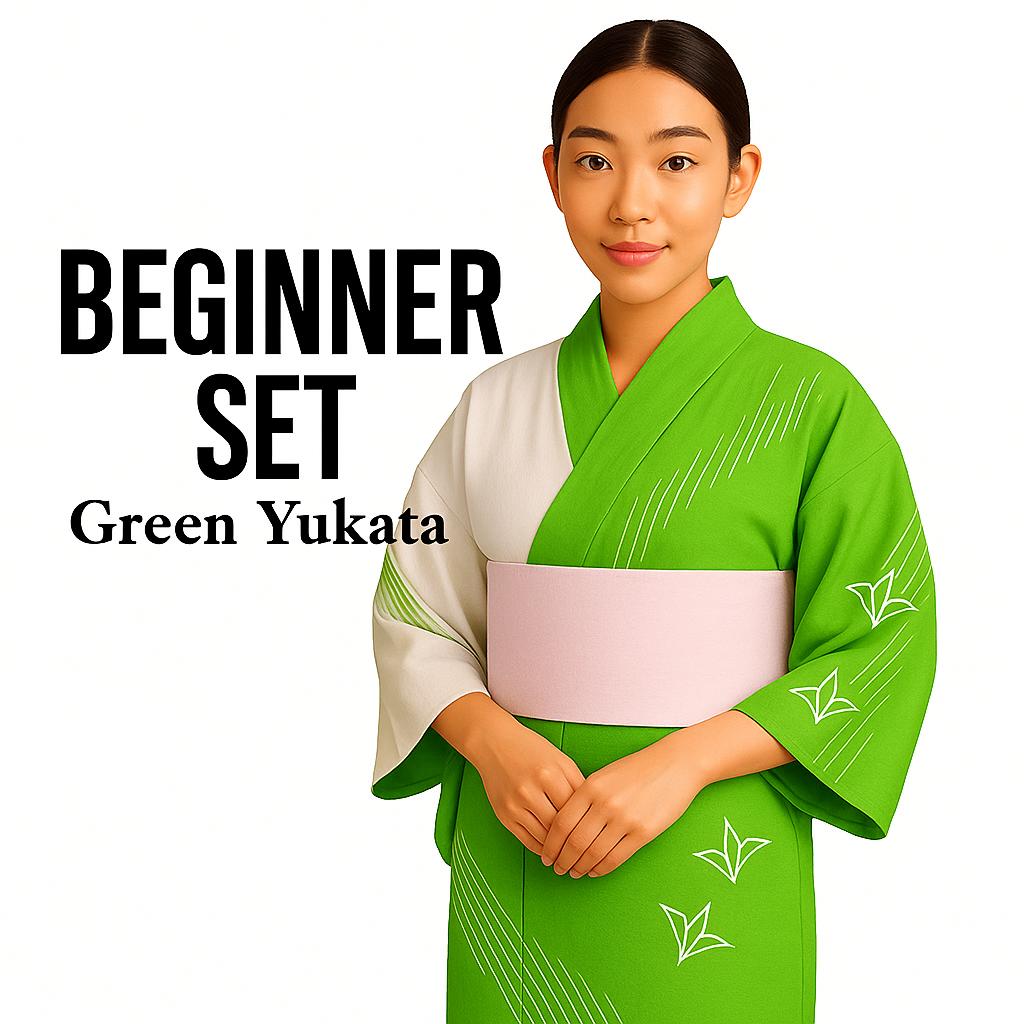 Used Green Yukata Dressing Set with Pre-tied Hanhaba Obi, Kimono Board, Magic Belt & Waist Ties – Easy Summer Kimono Kit