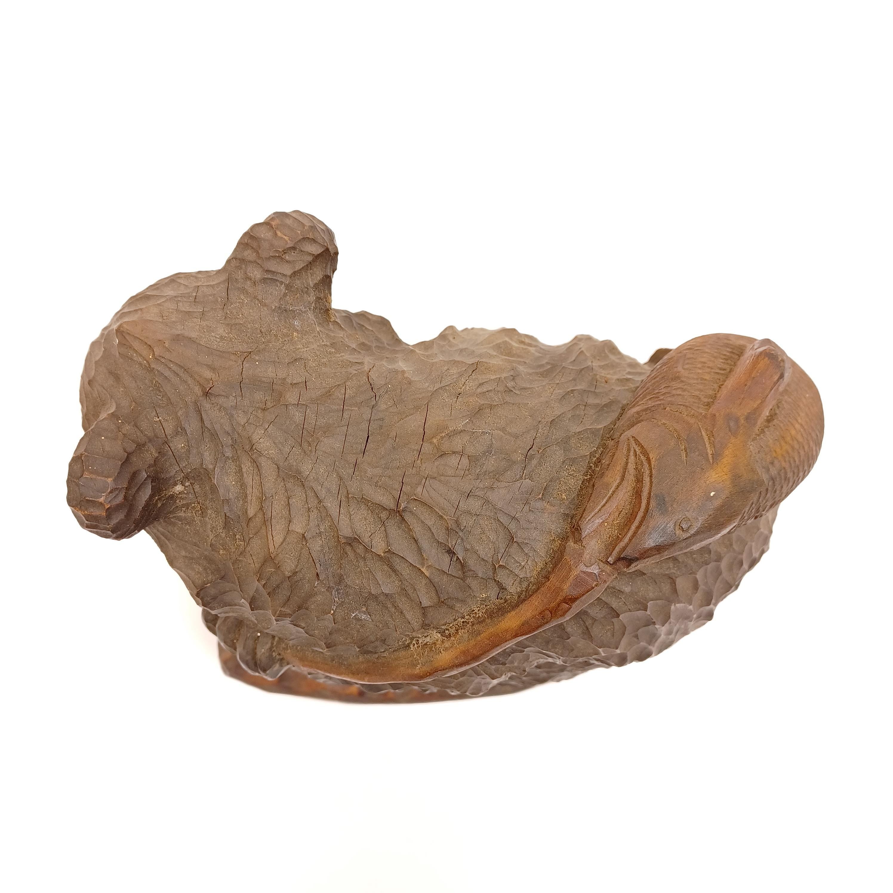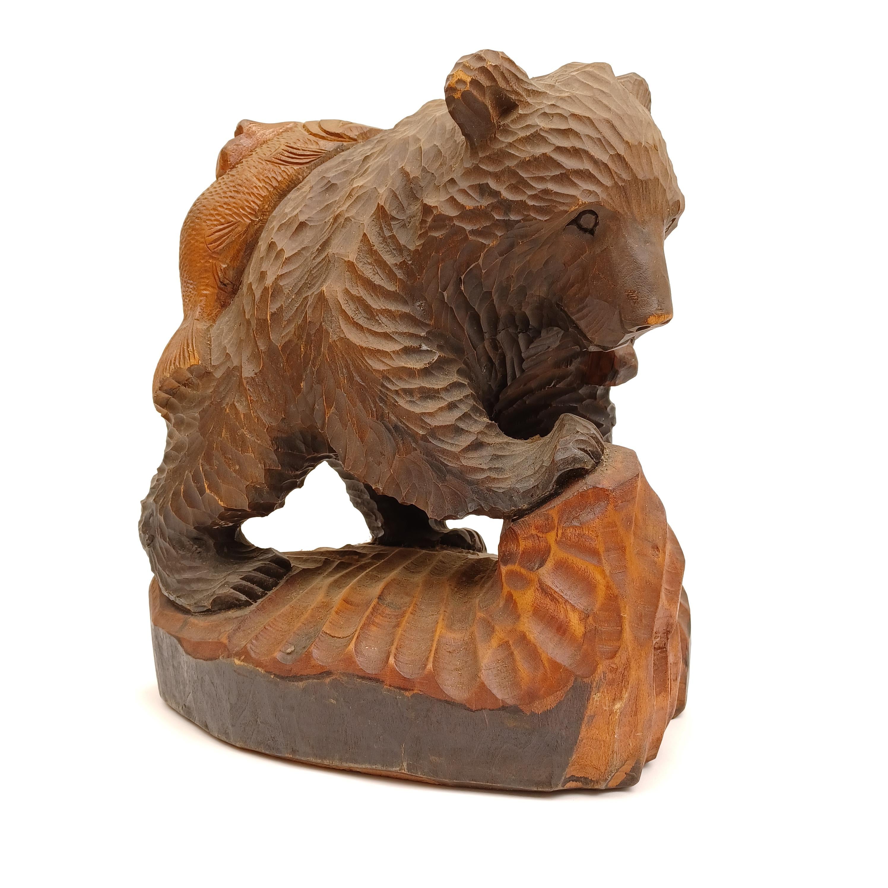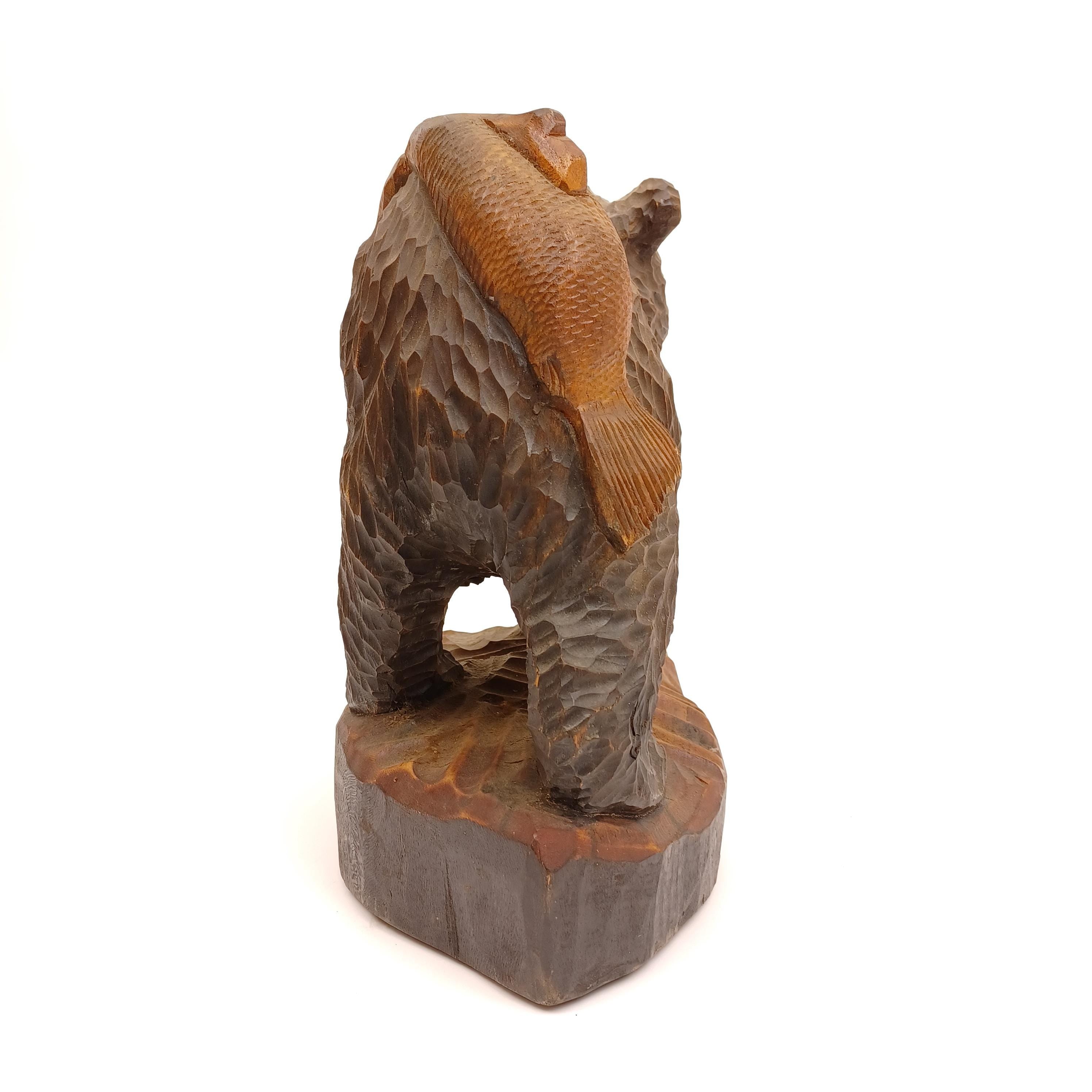 Used Hand-Carved Wooden Bear with Salmon from Japan Hokkaido Ainu Style Folk Art Sculpture 12.2in Vintage Figurine