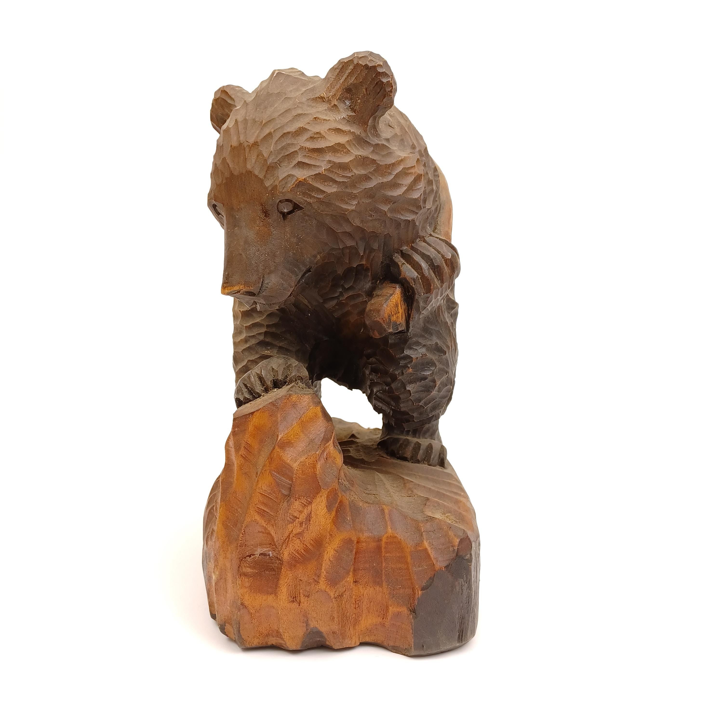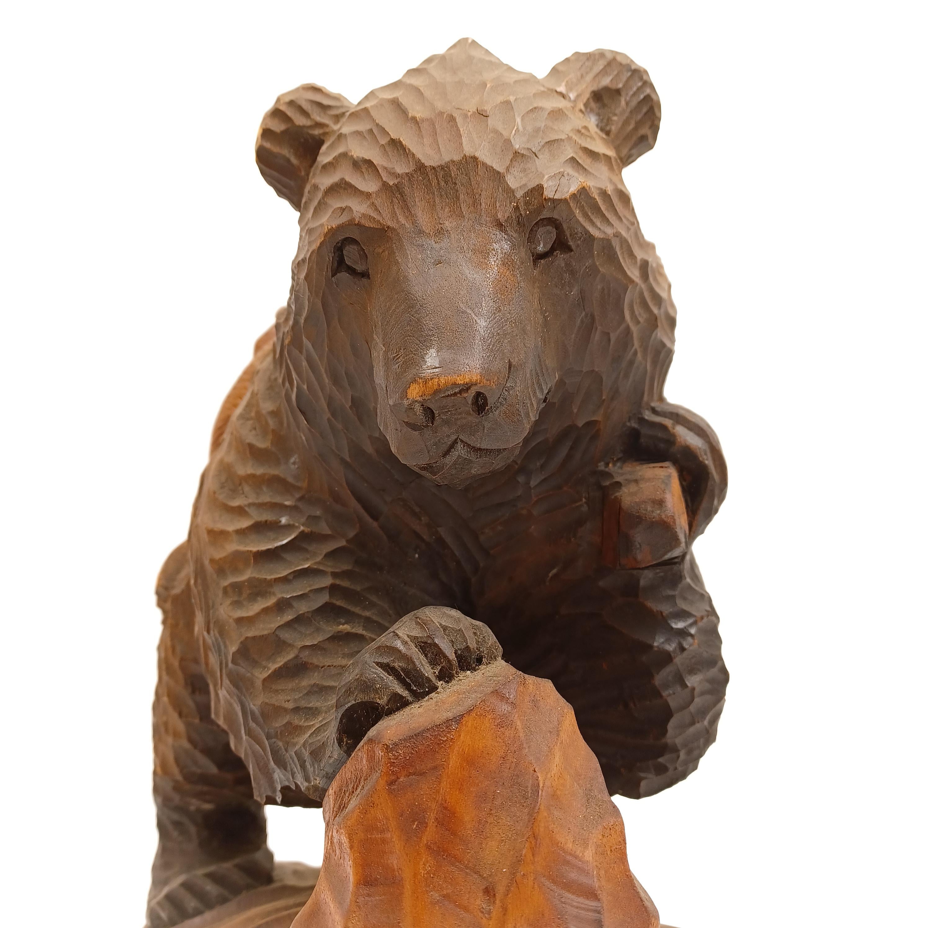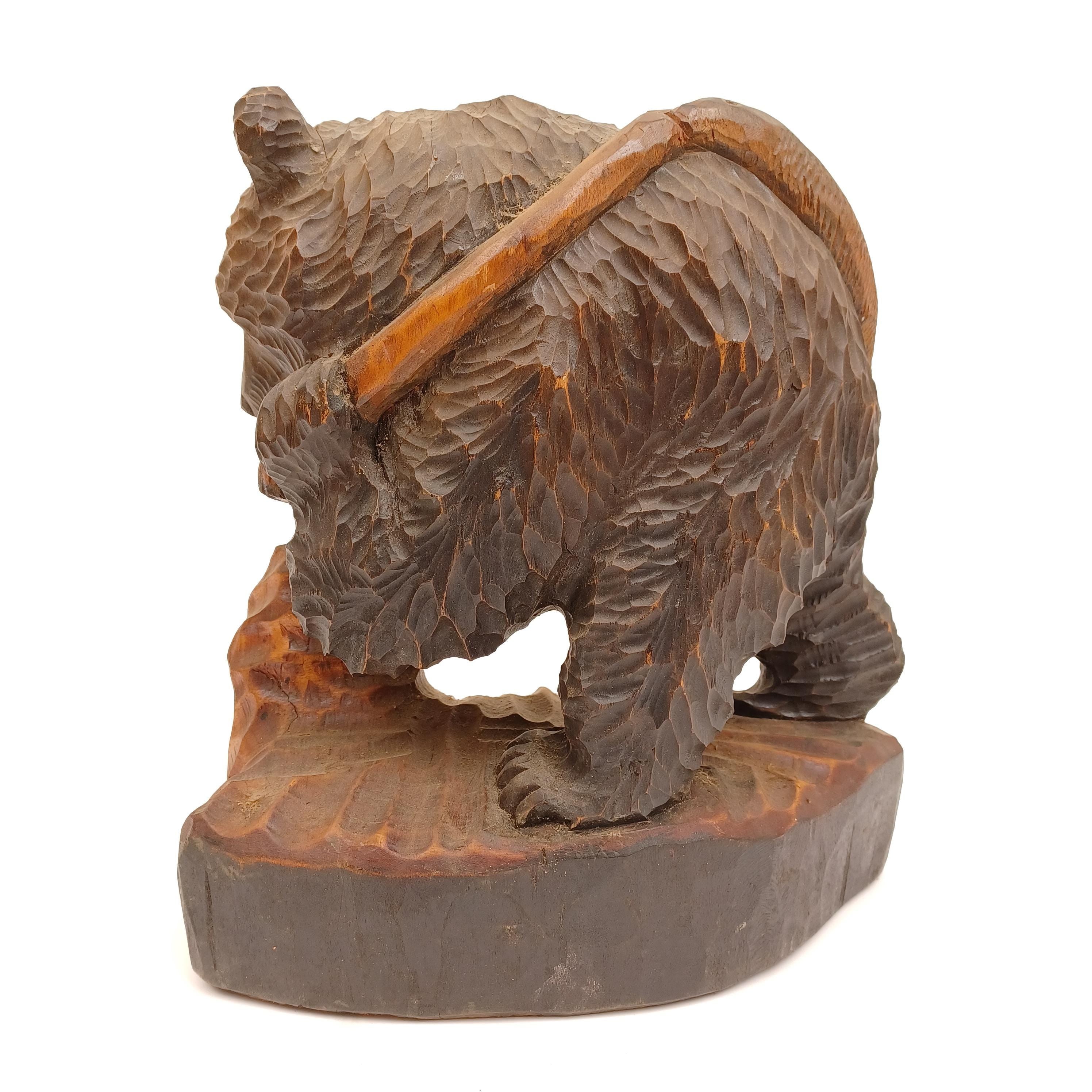 Used Hand-Carved Wooden Bear with Salmon from Japan Hokkaido Ainu Style Folk Art Sculpture 12.2in Vintage Figurine