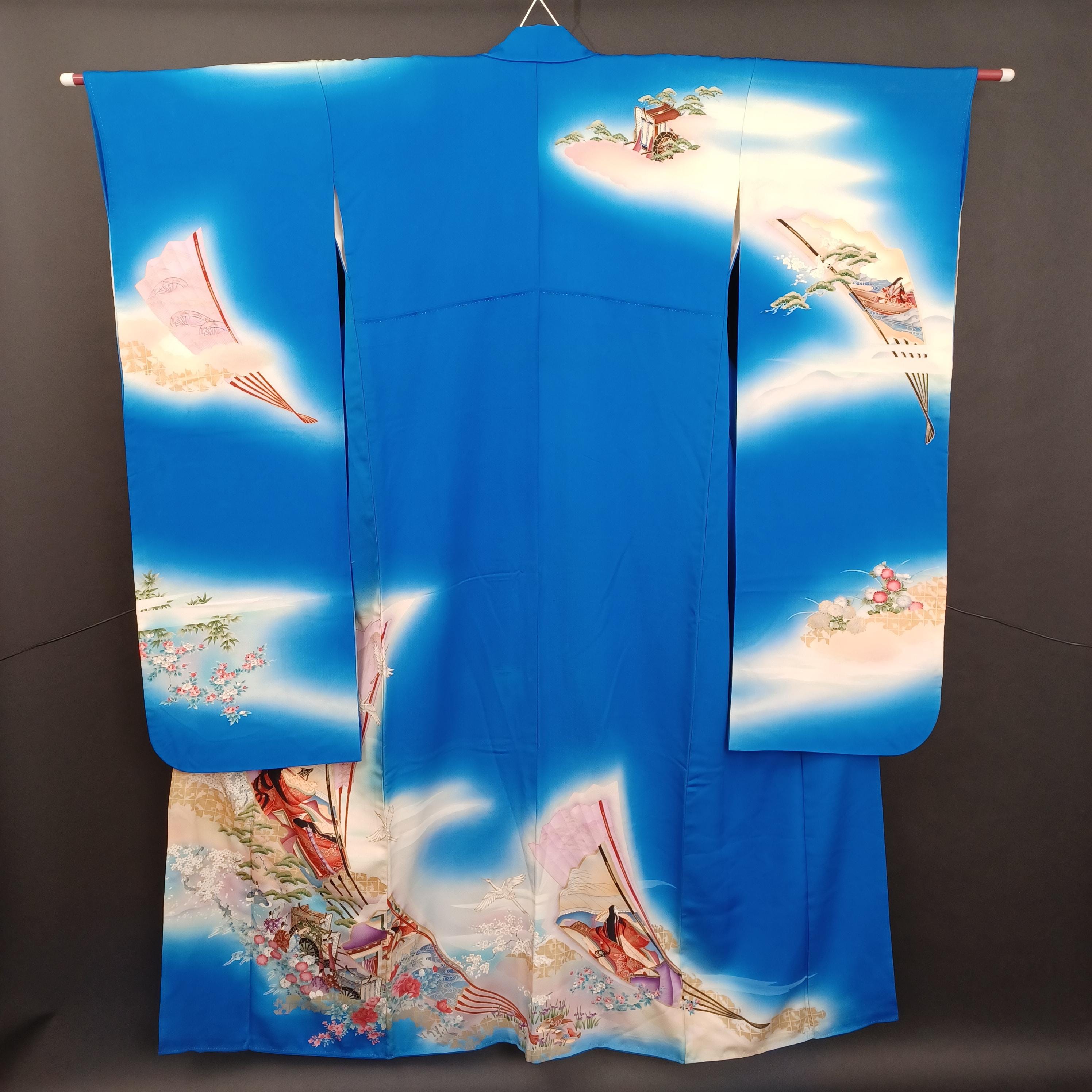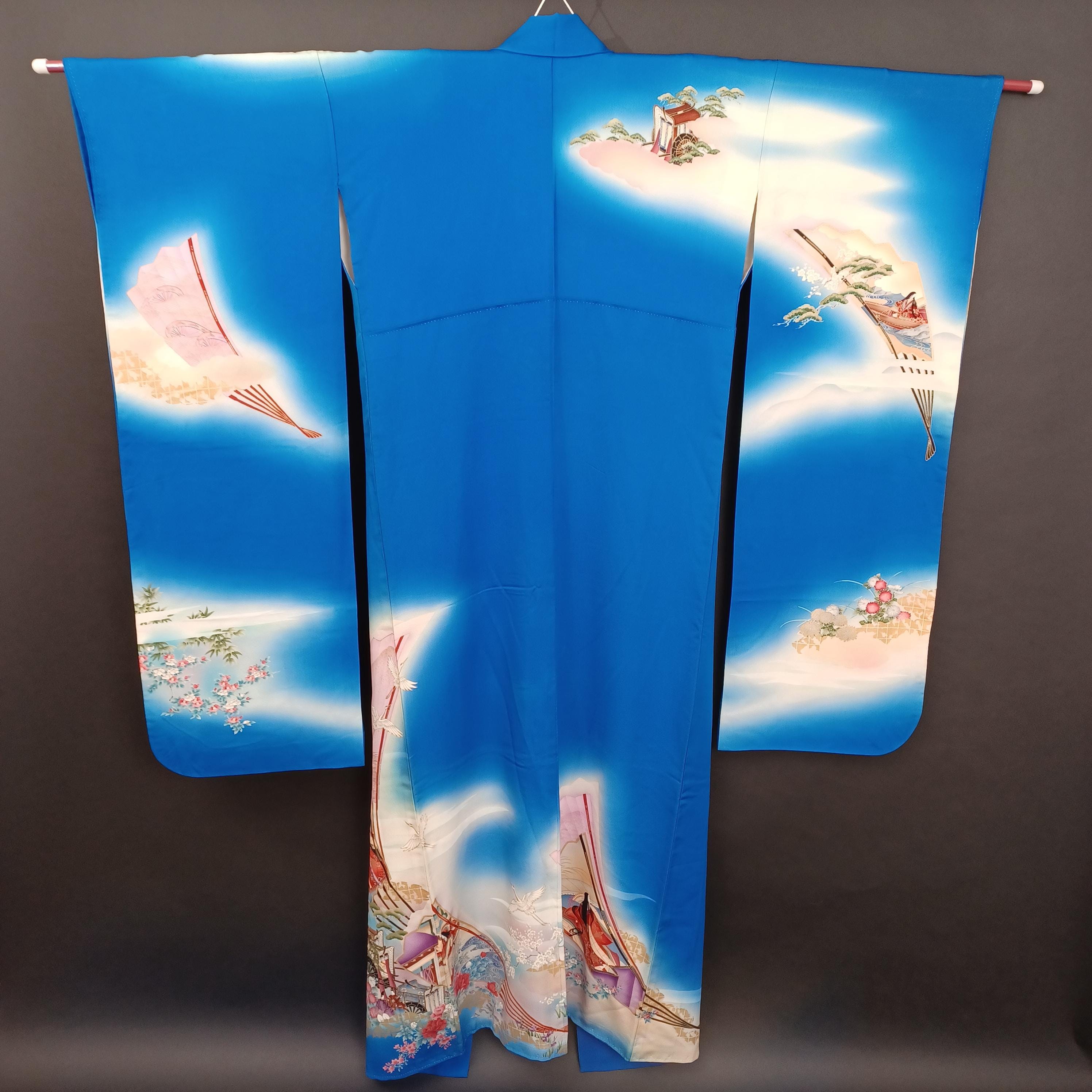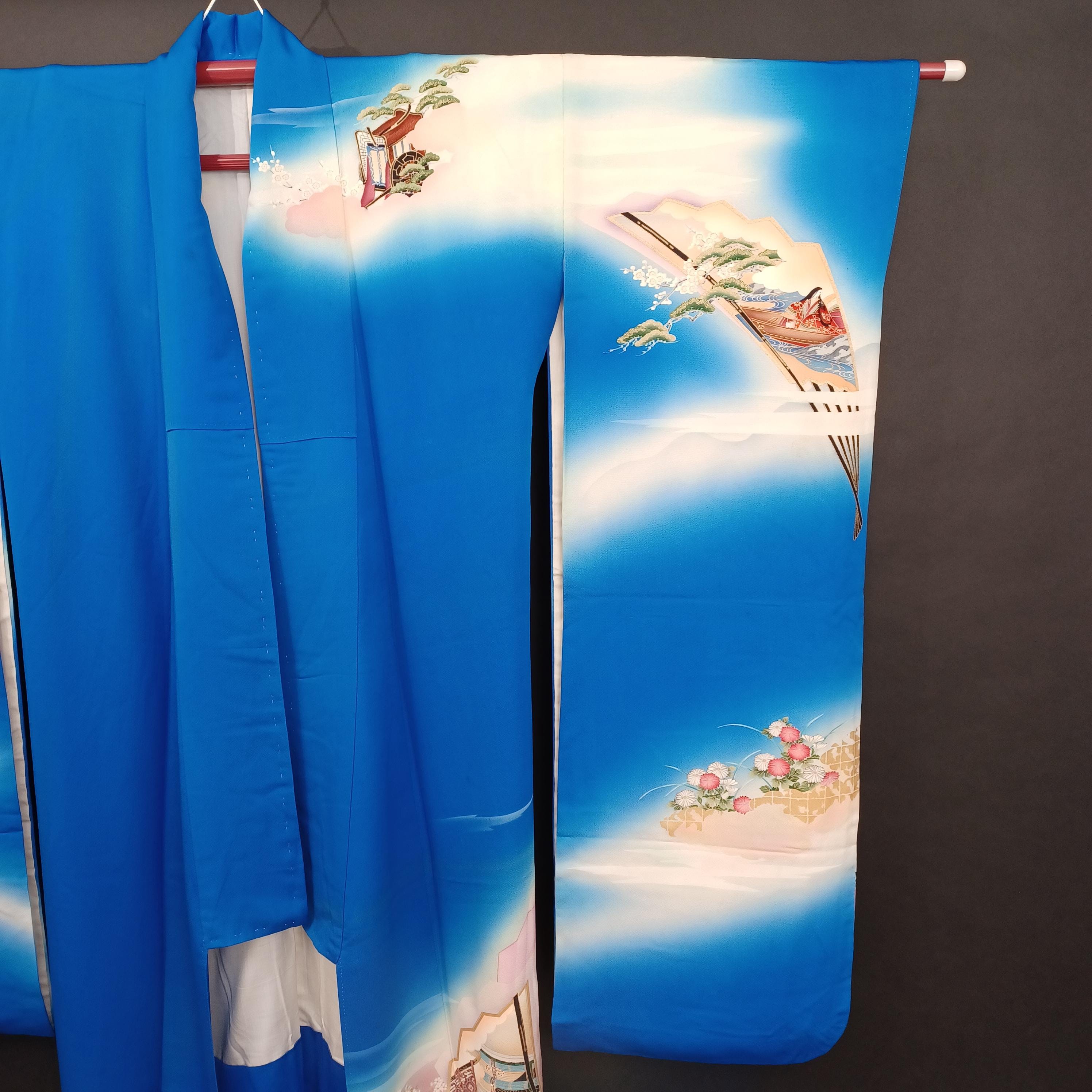 Used Japanese Furisode Kimono – Blue Silk Long Sleeve Robe with Fan & Seasonal Motifs – Elegant Vintage Formal Wear from Japan