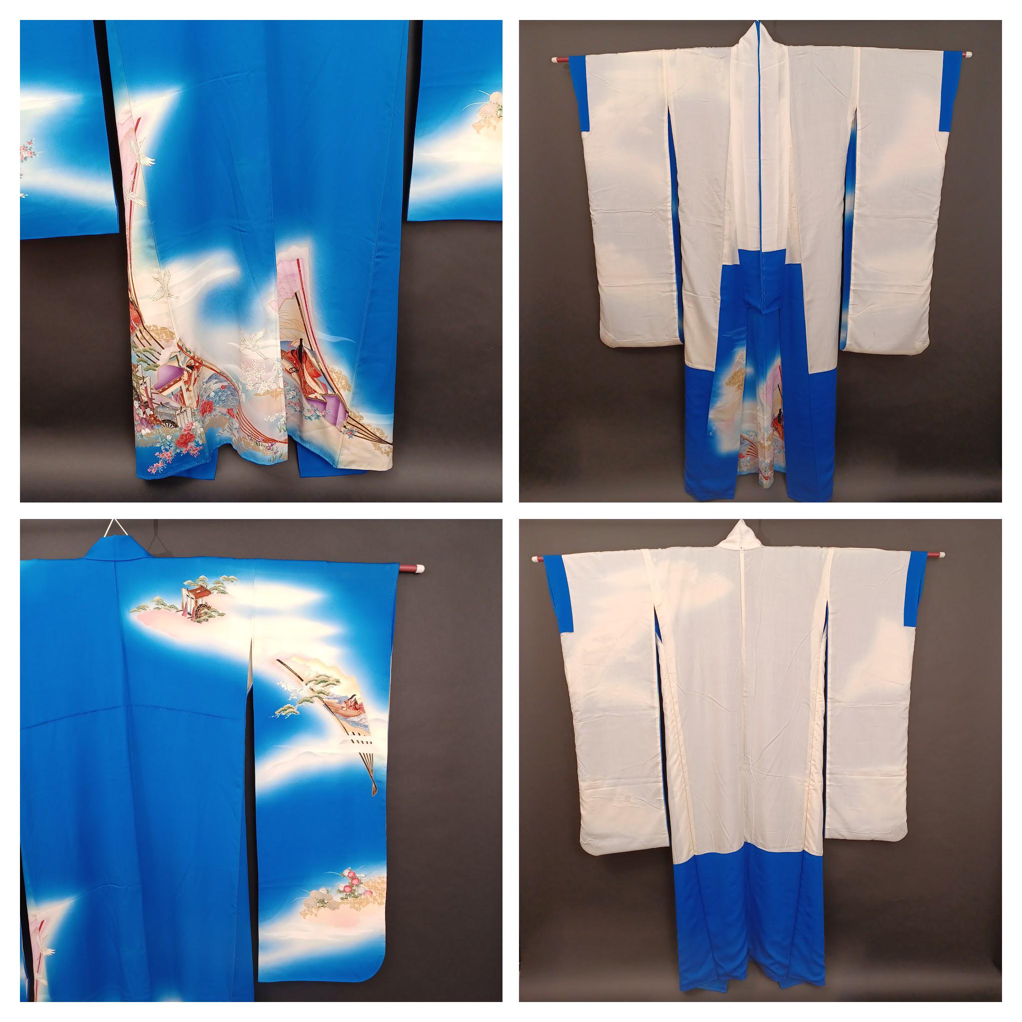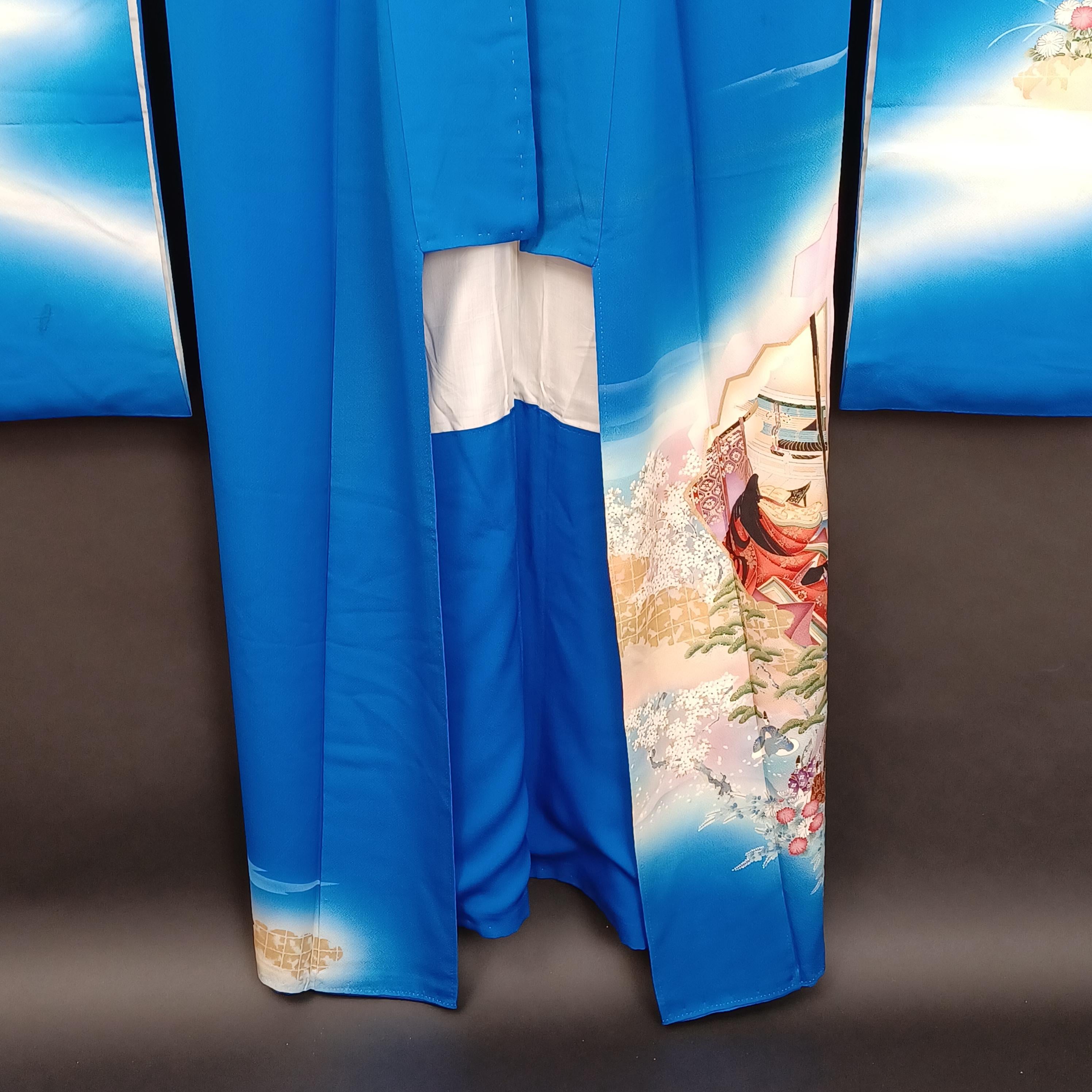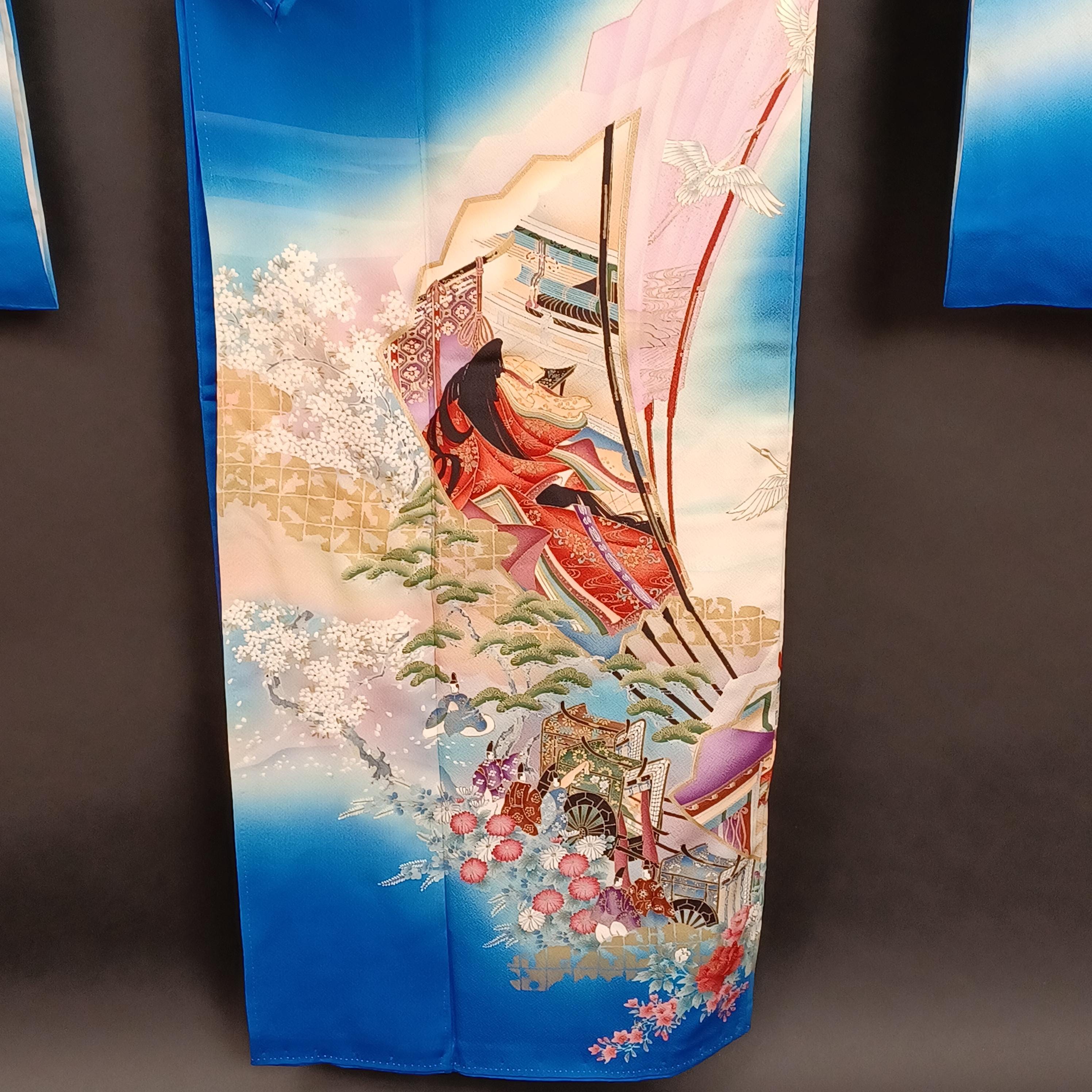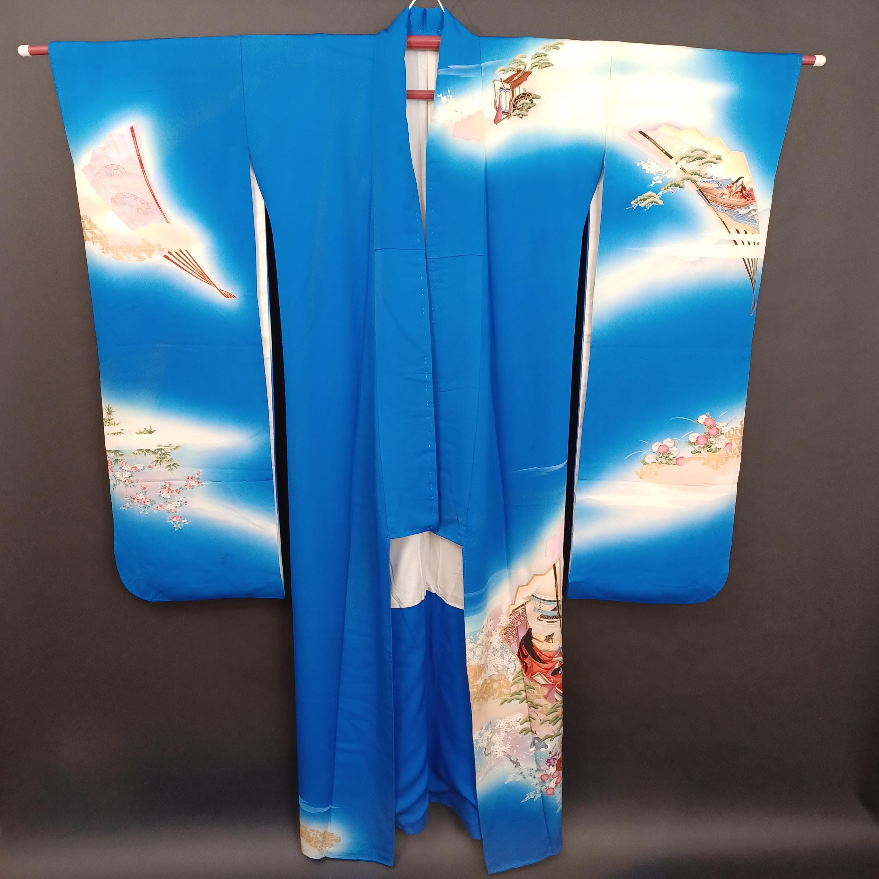Used Japanese Furisode Kimono – Blue Silk Long Sleeve Robe with Fan & Seasonal Motifs – Elegant Vintage Formal Wear from Japan