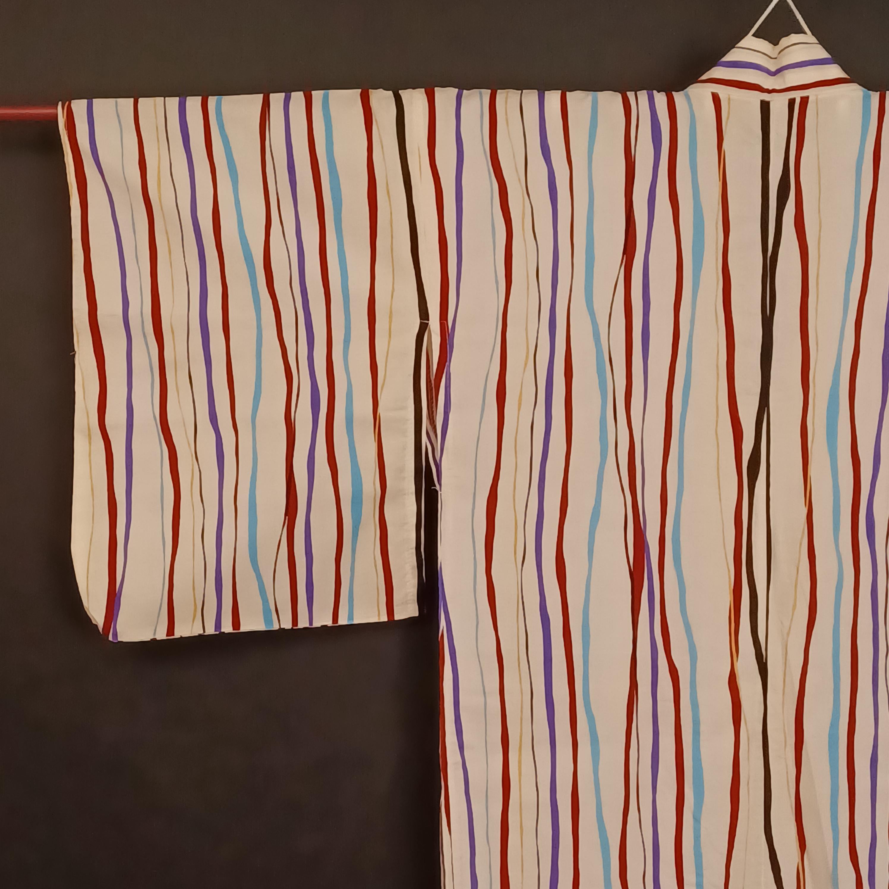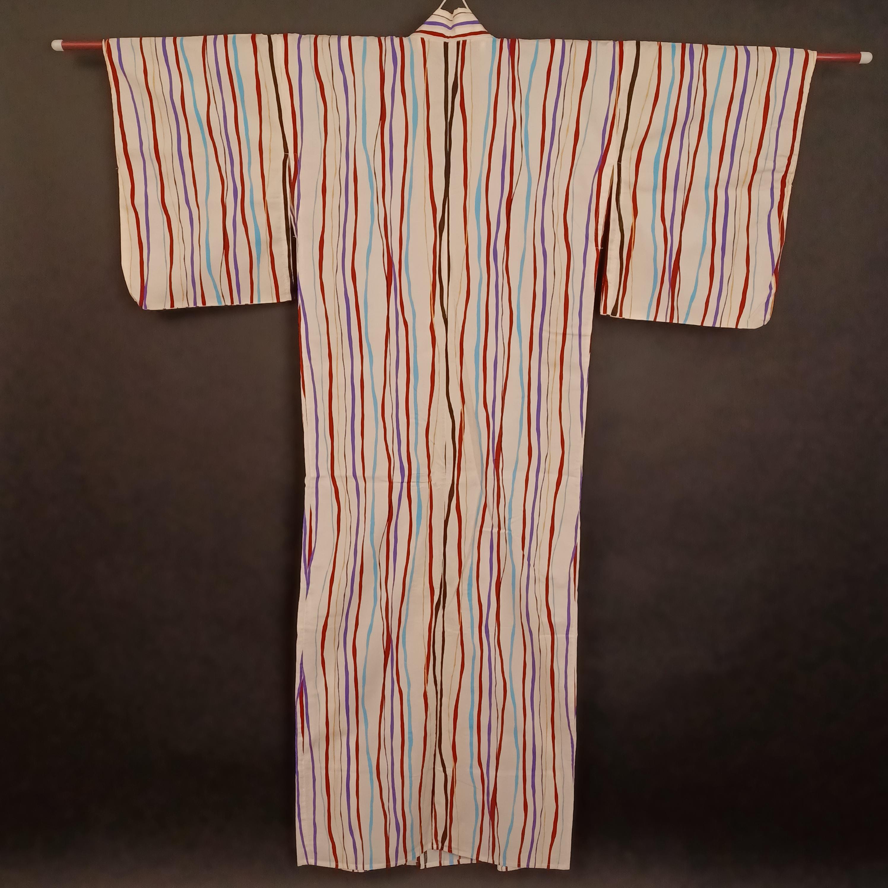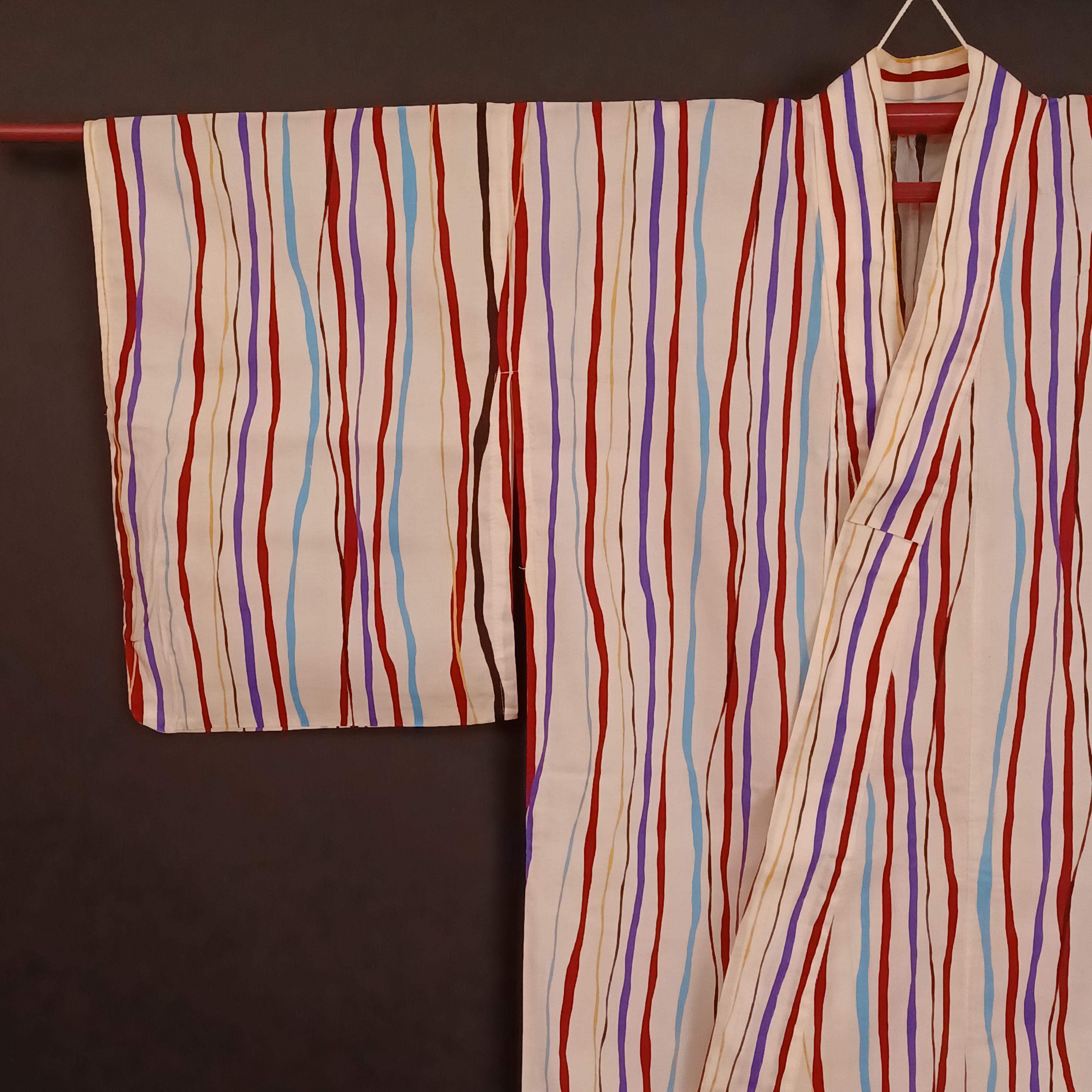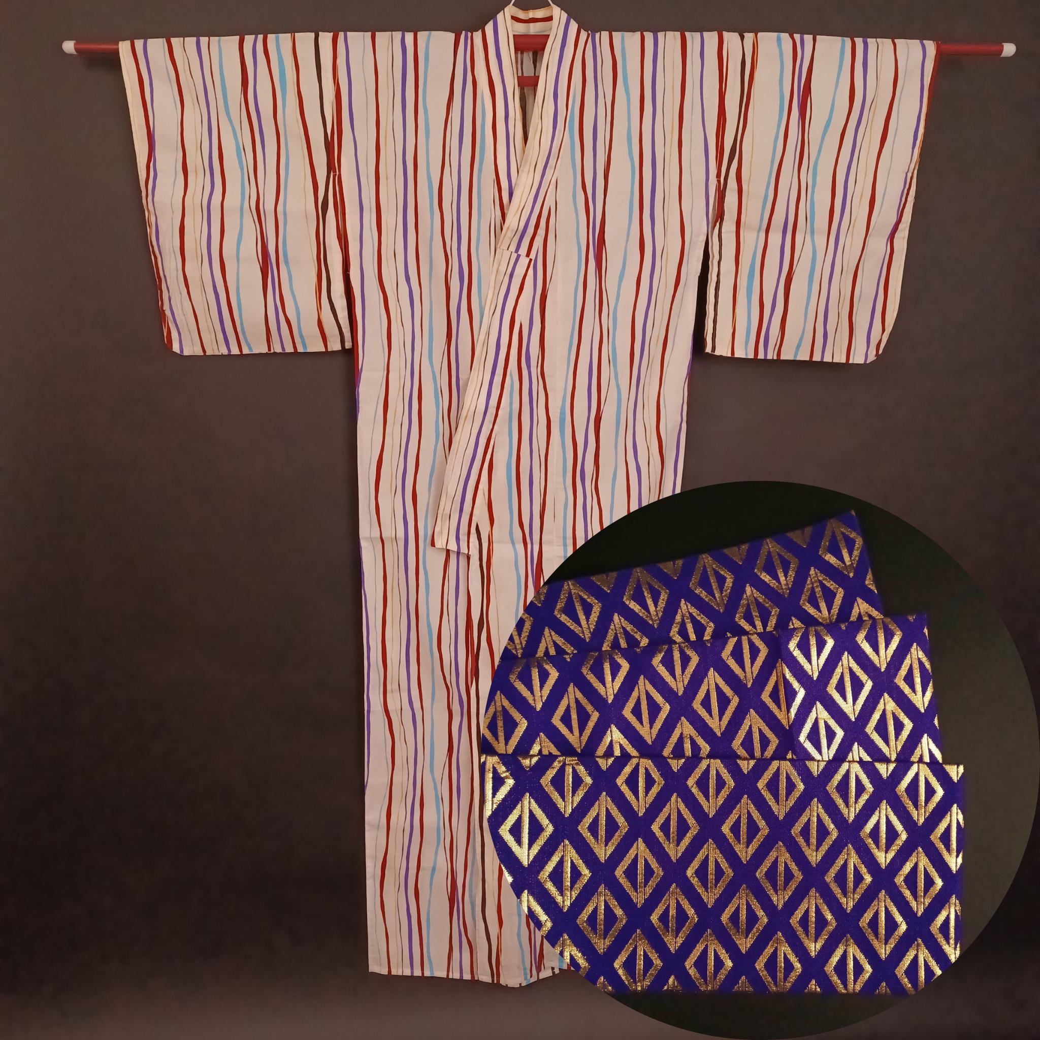 Used Japanese Yukata and Hanhaba Obi Set – Striped Summer Kimono with Purple & Gold Geometric Obi Belt – Cotton Traditional Festival Wear