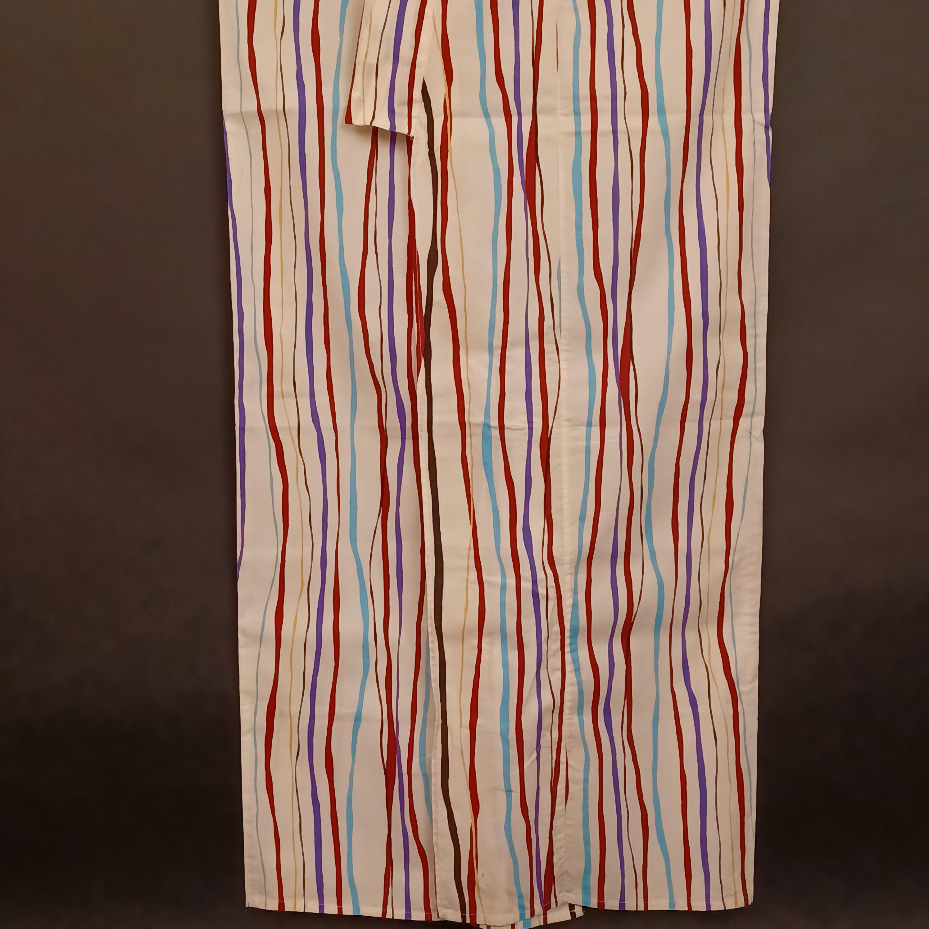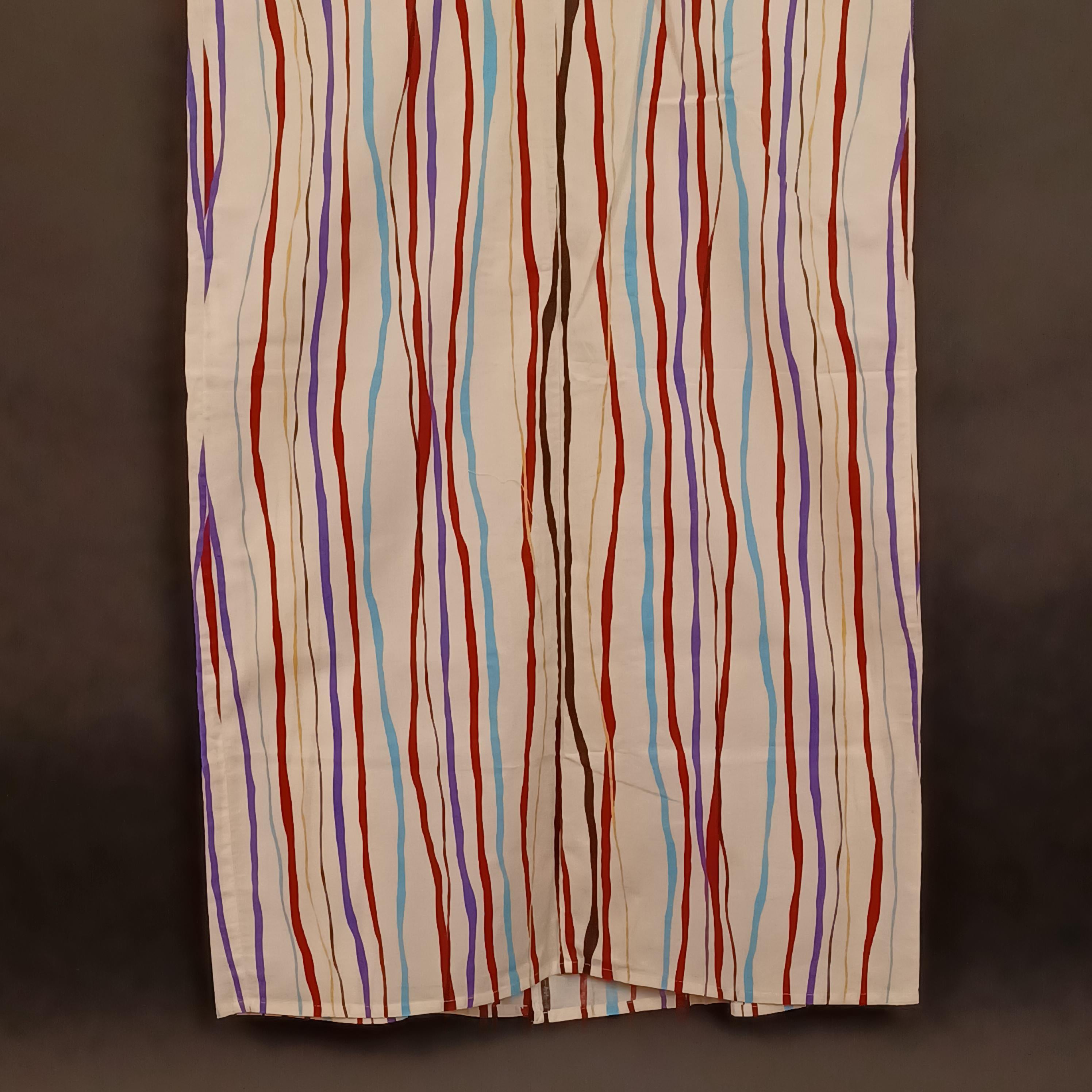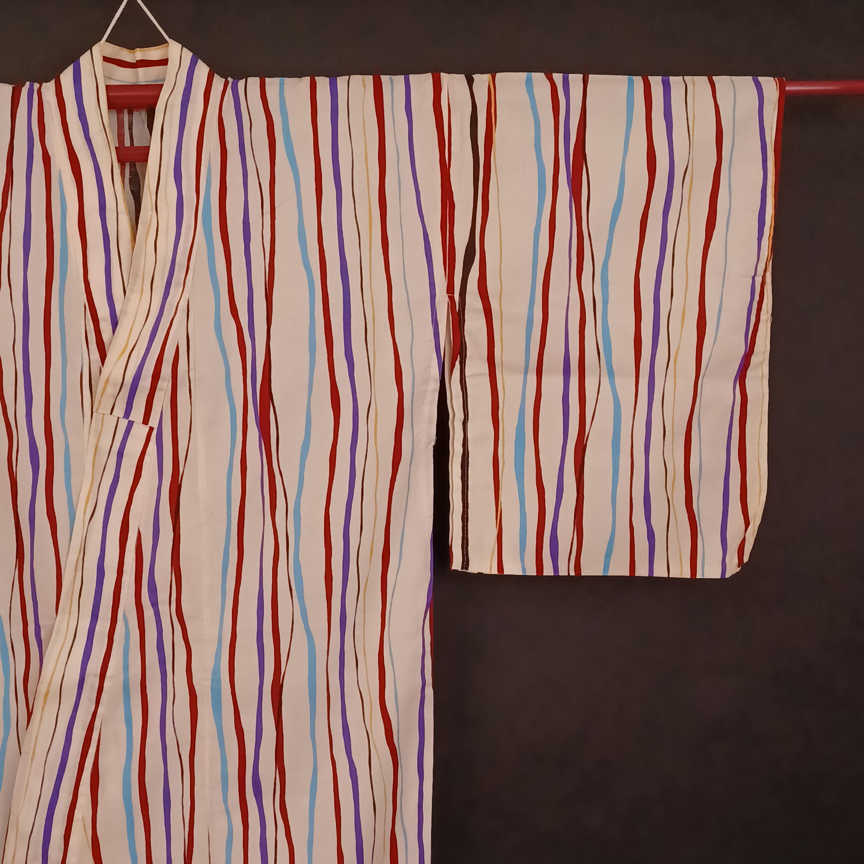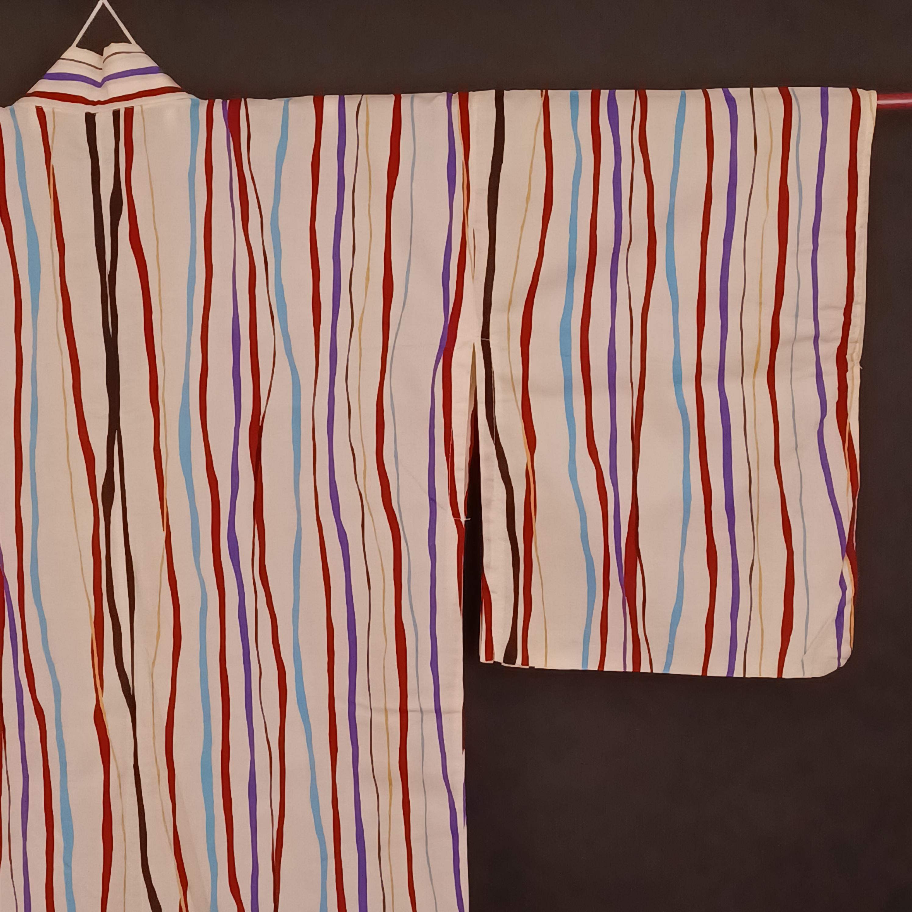 Used Japanese Yukata and Hanhaba Obi Set – Striped Summer Kimono with Purple & Gold Geometric Obi Belt – Cotton Traditional Festival Wear