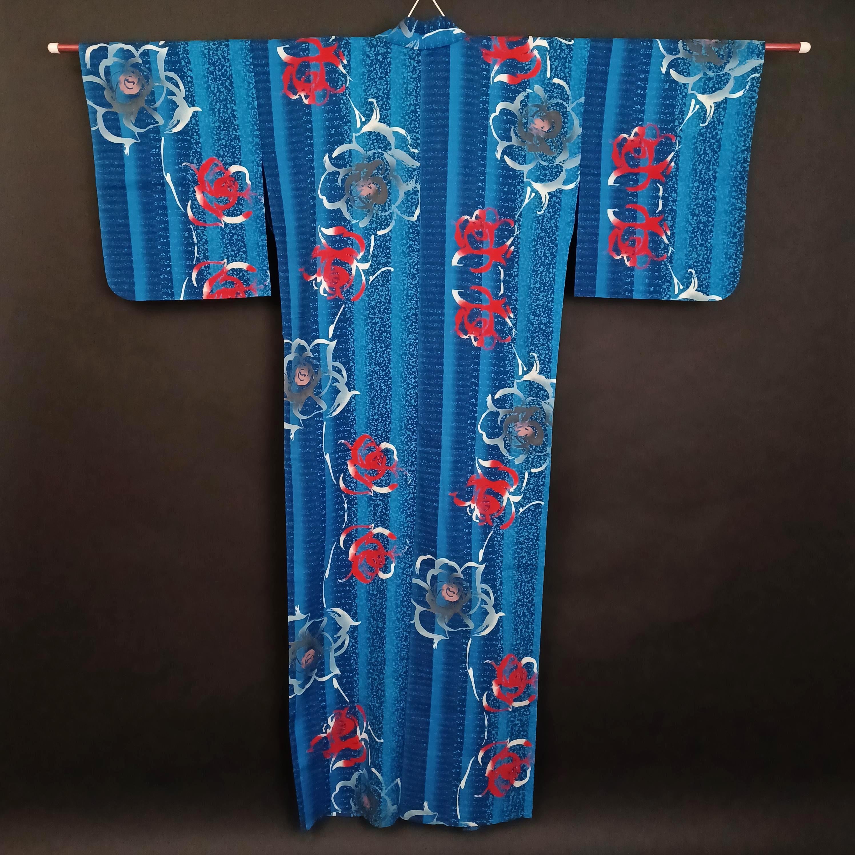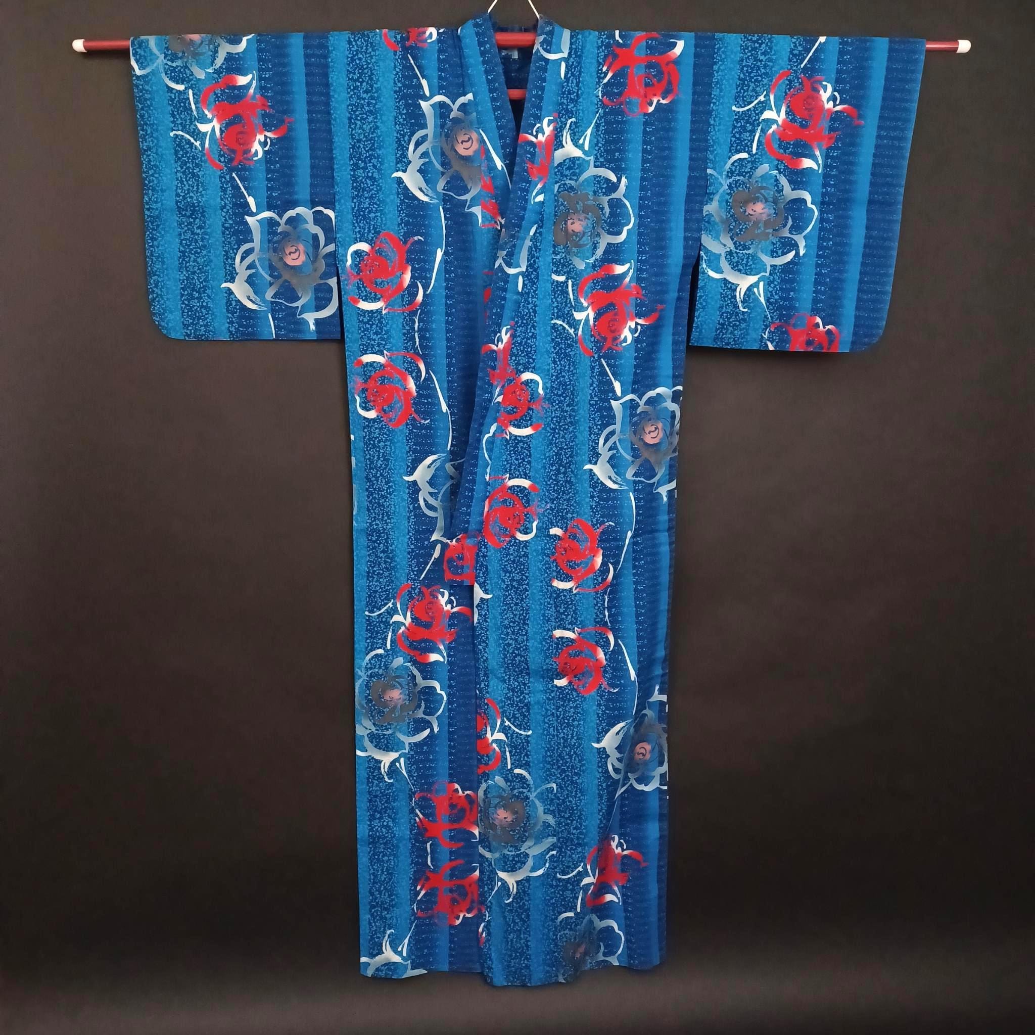 Used Japanese Yukata & Hanhaba Obi Set – Blue Floral Kimono with White and Orange Obi Belt – Summer Cotton Festival Wear – Bold Elegant Look