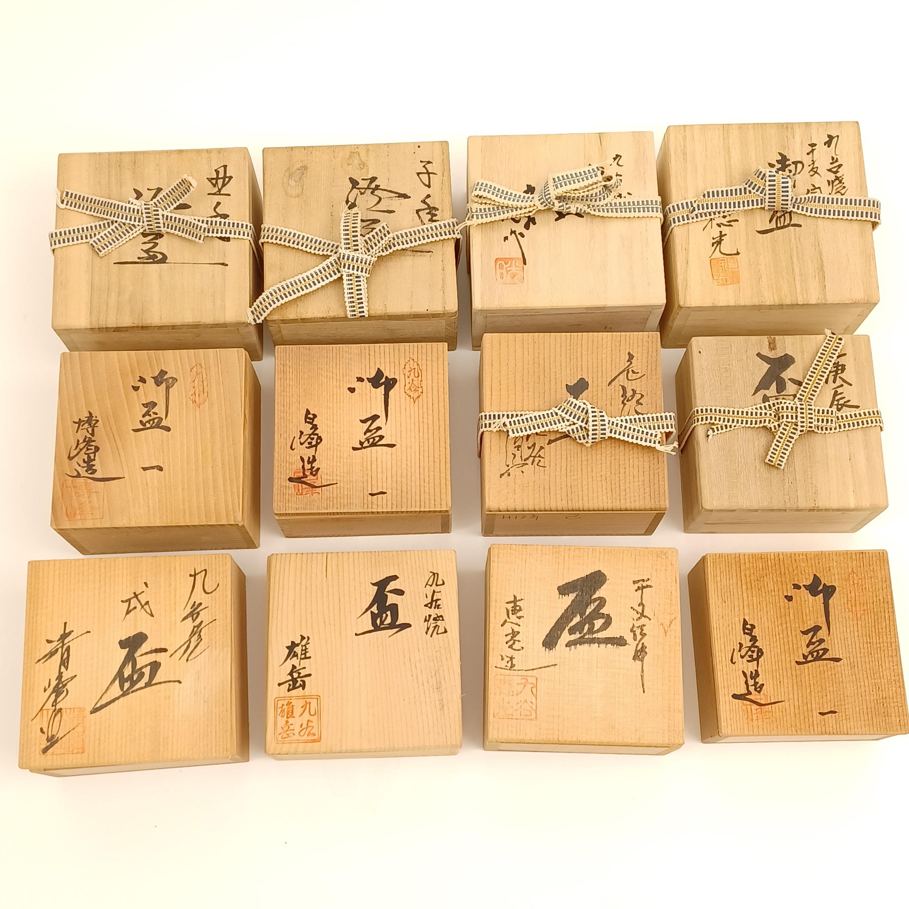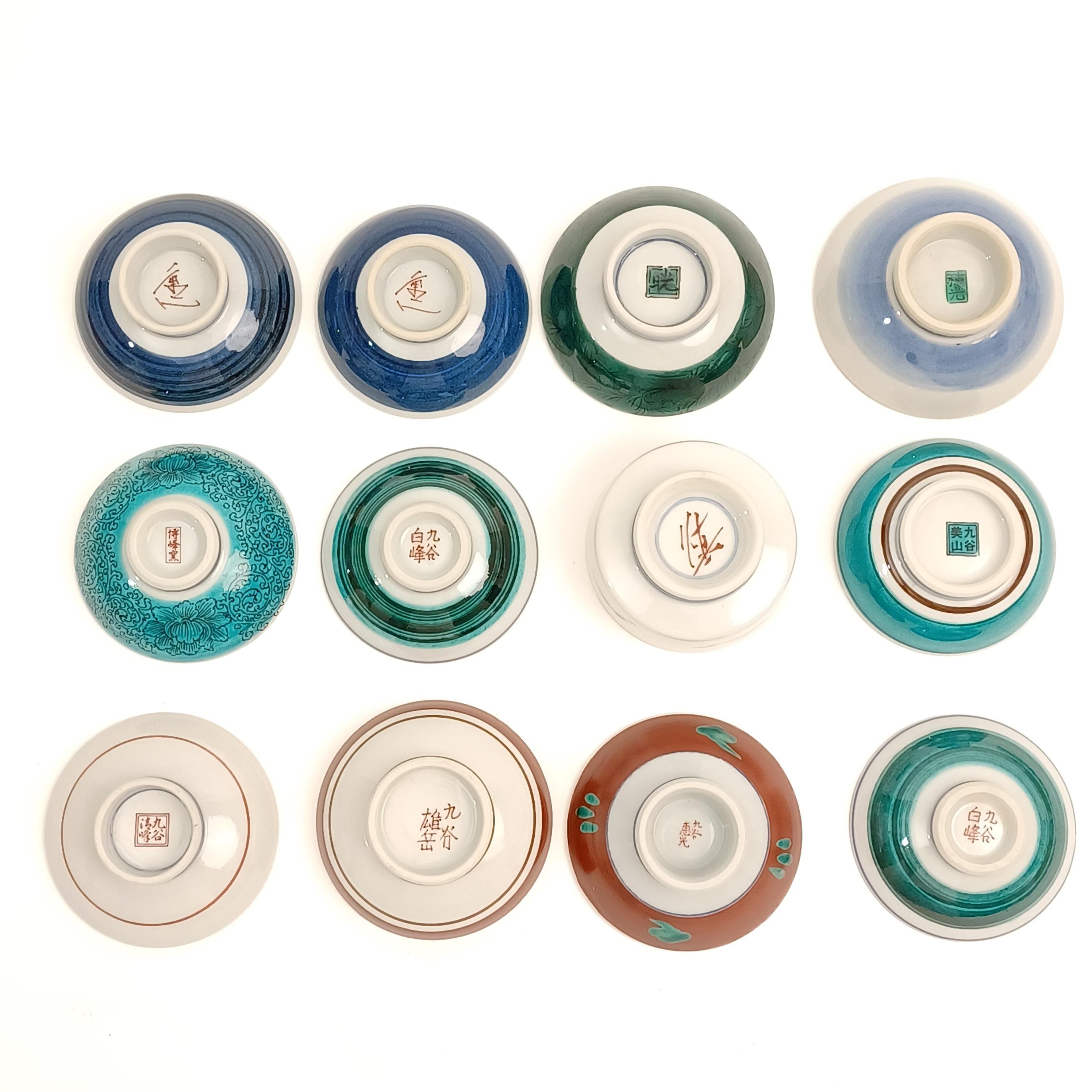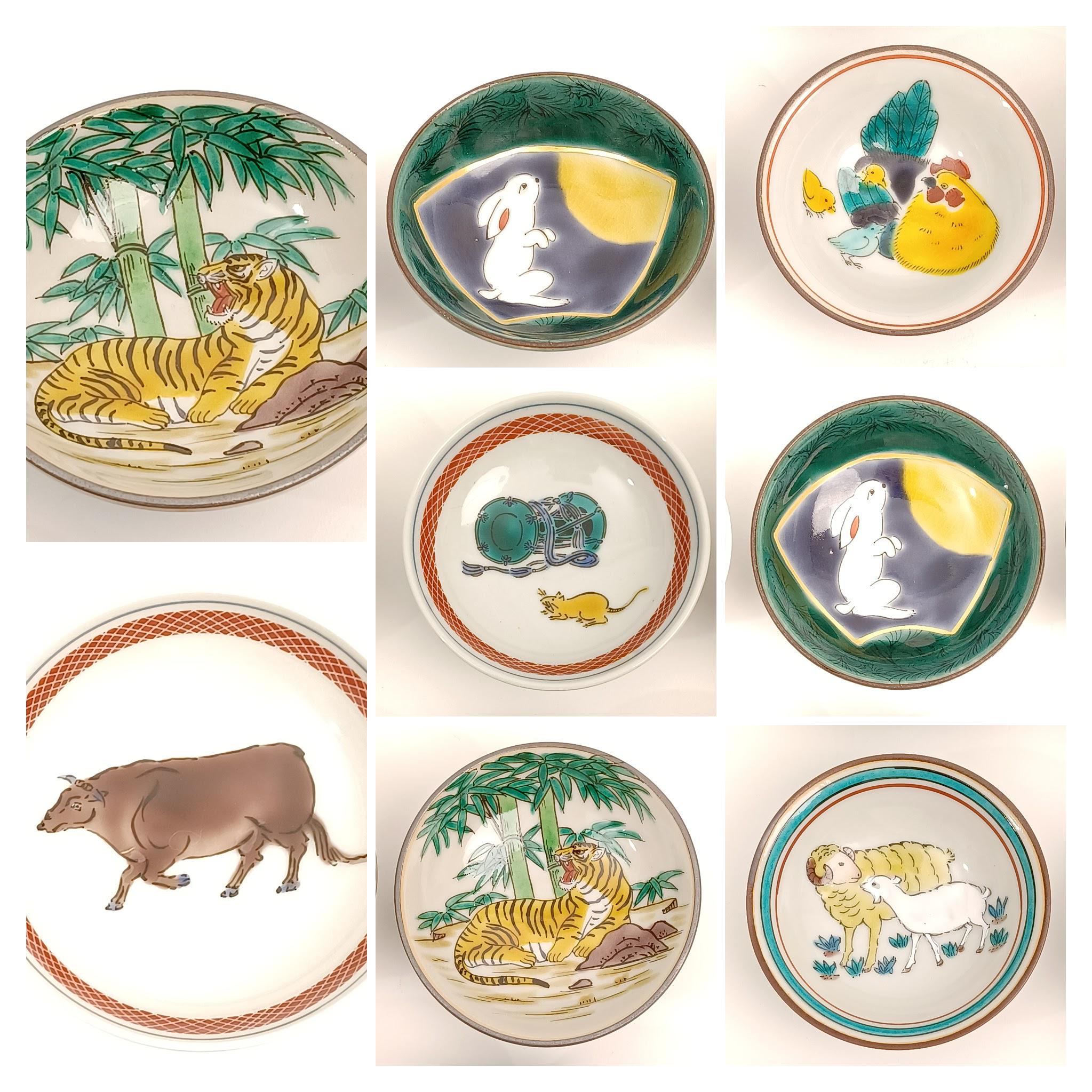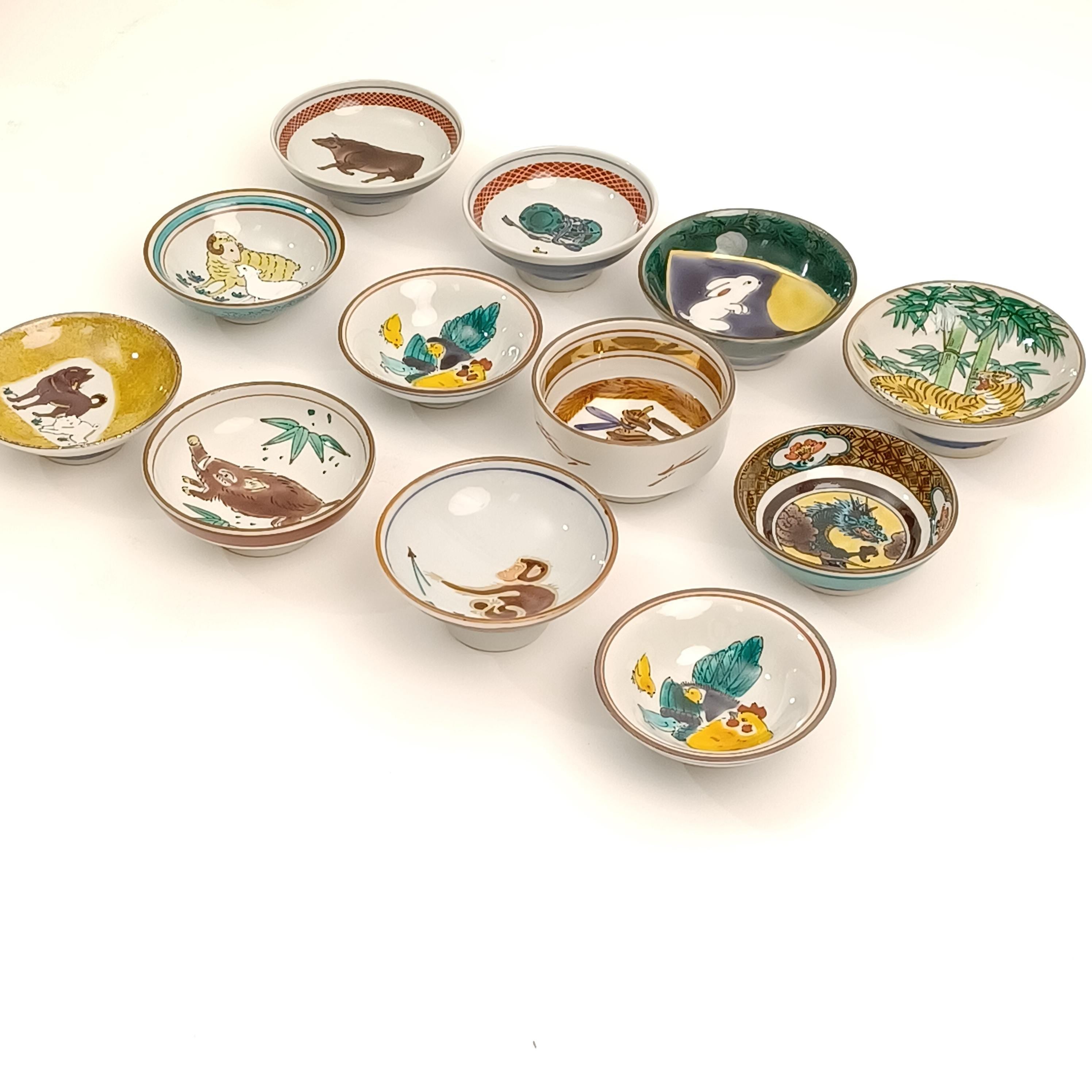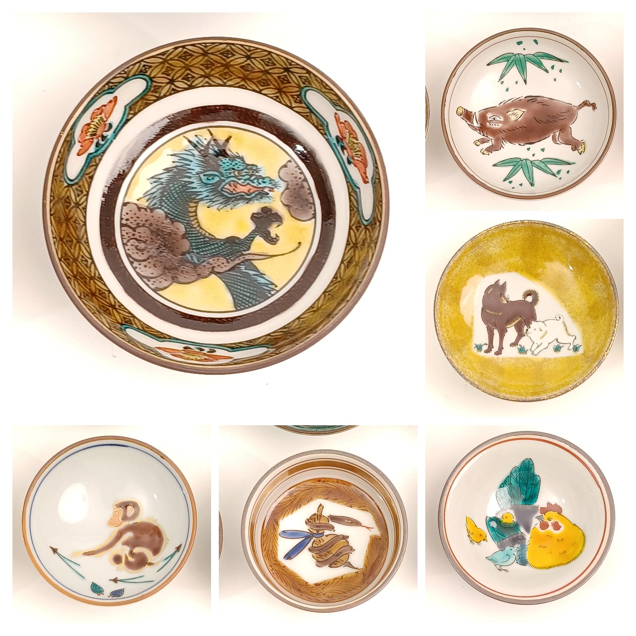 Used Kutani Sake Cups Lot of 12 - Hand-Painted Zodiac Motifs with Signed Wooden Boxes - Japanese Ceramic Ochoko| Forgot Souvenir