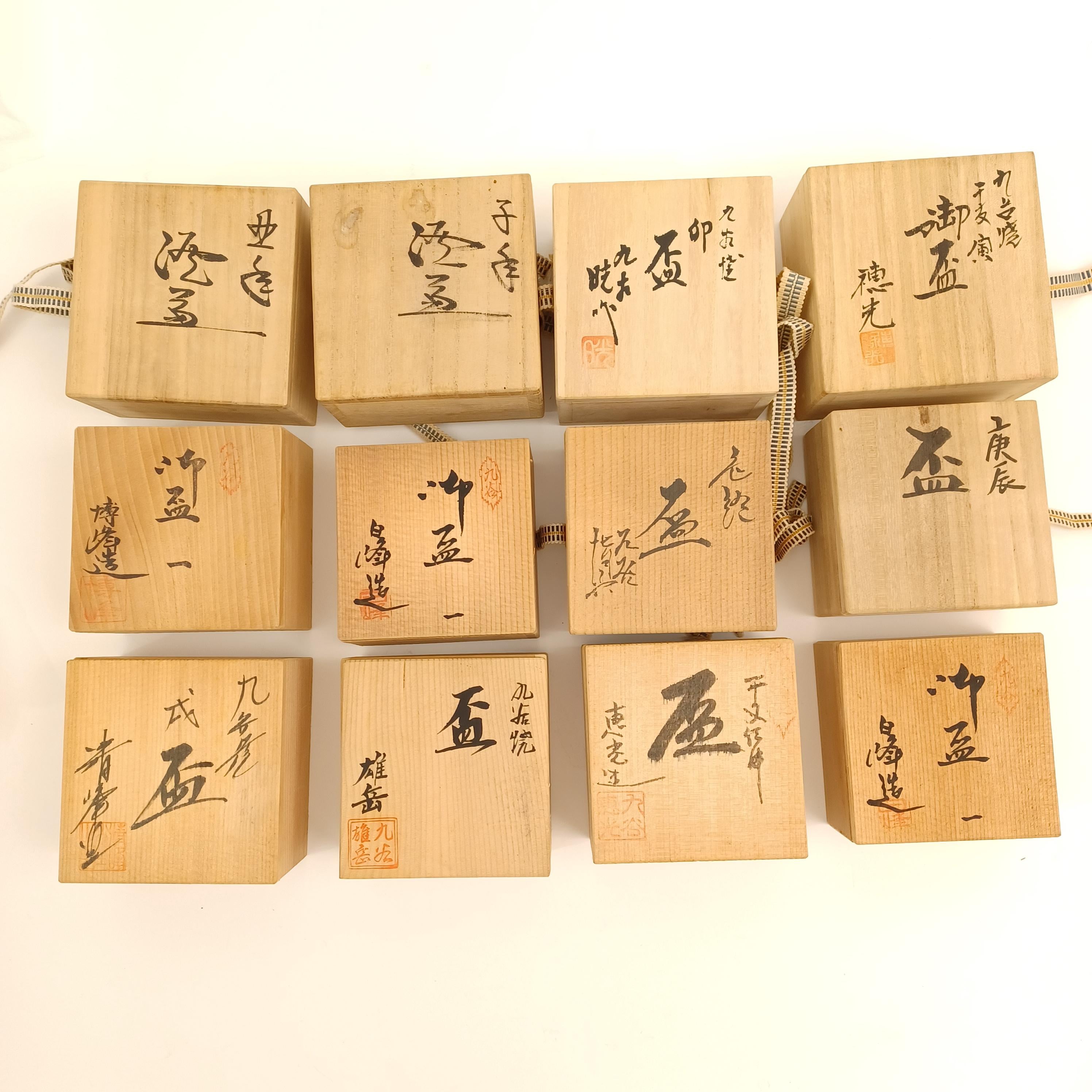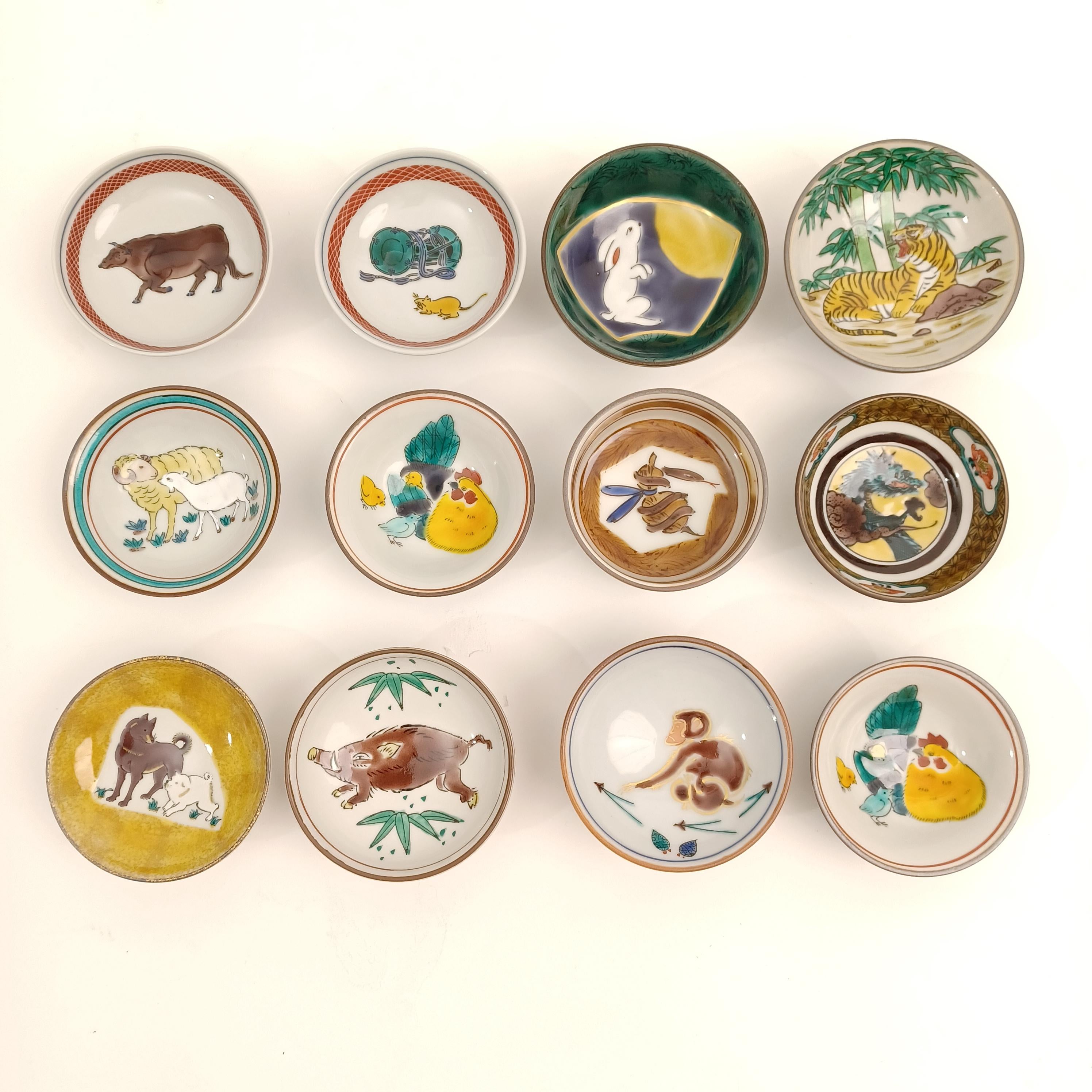 This is a unique lot of 12 Kutani sake cups (ochoko), each a piece of traditional Japanese craftsmanship. Each cup is hand-painted with a different zodiac or auspicious motif in vibrant enamel colors, a hallmark of Kutani porcelain. The set comes with individual wooden boxes, each featuring hand-written inscriptions.