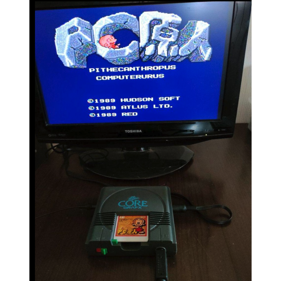 It pioneered the use of HuCard (a credit card-sized media) and later introduced the optional CD-ROM add-on, leading the console wars with advanced storage technology in the late 1980s and early 1990s. The game shown on the screen, PC Genjin (Bonk's Adventure), is one of the system's most iconic titles.