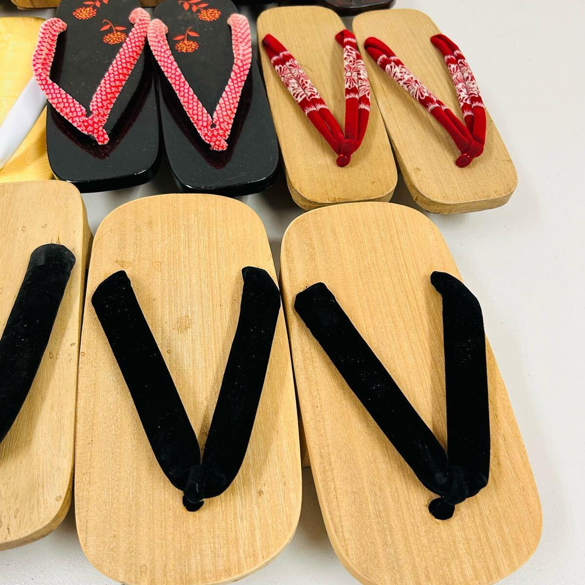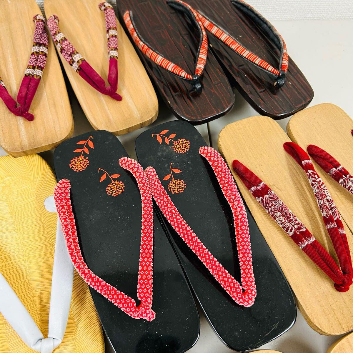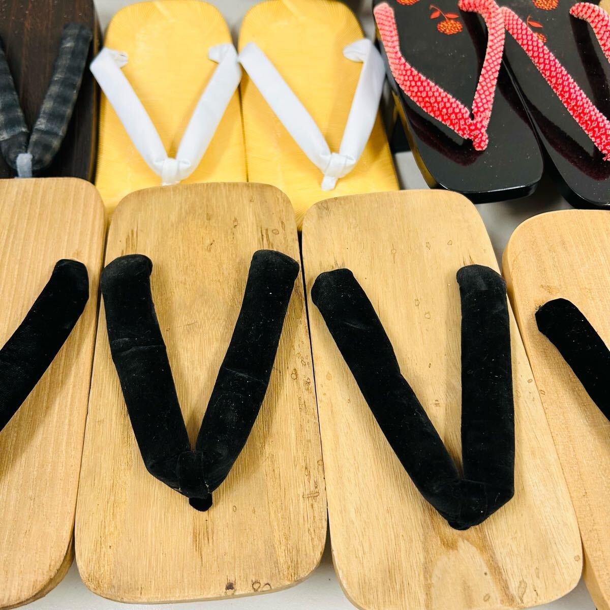 This is a large lot of 13 pairs of vintage Japanese Geta sandals, a traditional form of Japanese footwear. Geta are wooden sandals historically used since the Edo period to elevate the feet and provide excellent ventilation. They are composed of a flat wooden base and a fabric thong, known as a hanao, which is worn between the toes. They are typically worn with kimonos or yukatas. 👘