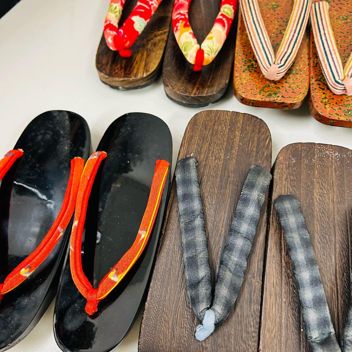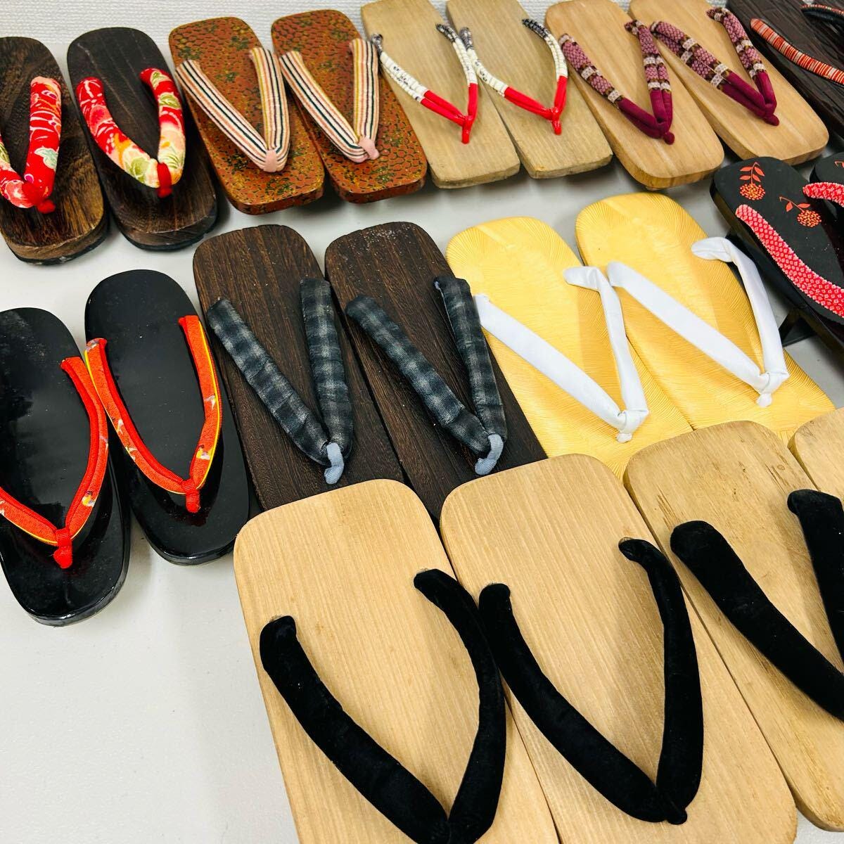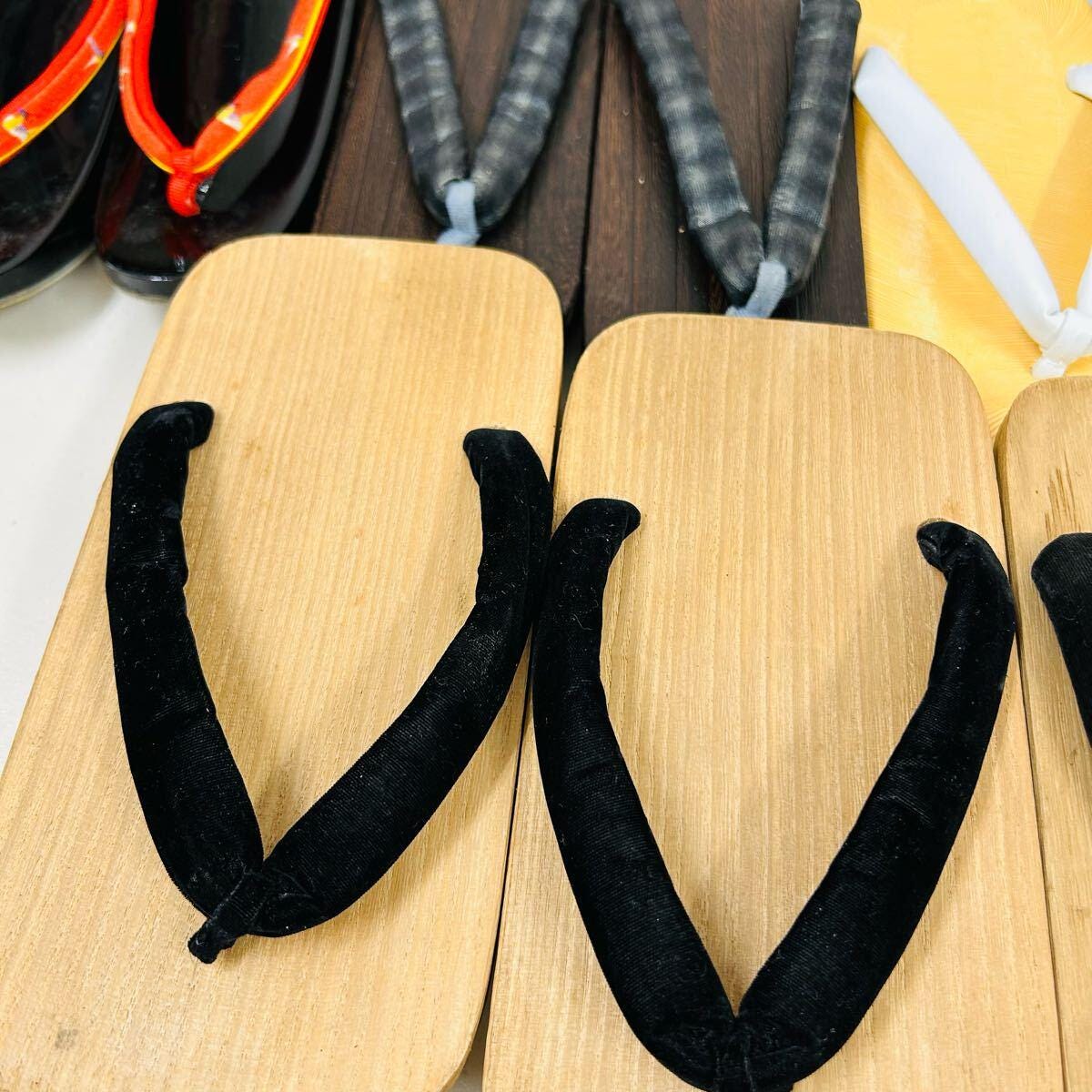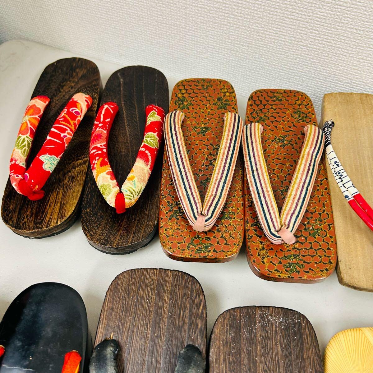 This is a large lot of 13 pairs of vintage Japanese Geta sandals, a traditional form of Japanese footwear. Geta are wooden sandals historically used since the Edo period to elevate the feet and provide excellent ventilation. They are composed of a flat wooden base and a fabric thong, known as a hanao, which is worn between the toes. They are typically worn with kimonos or yukatas. 👘