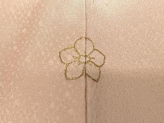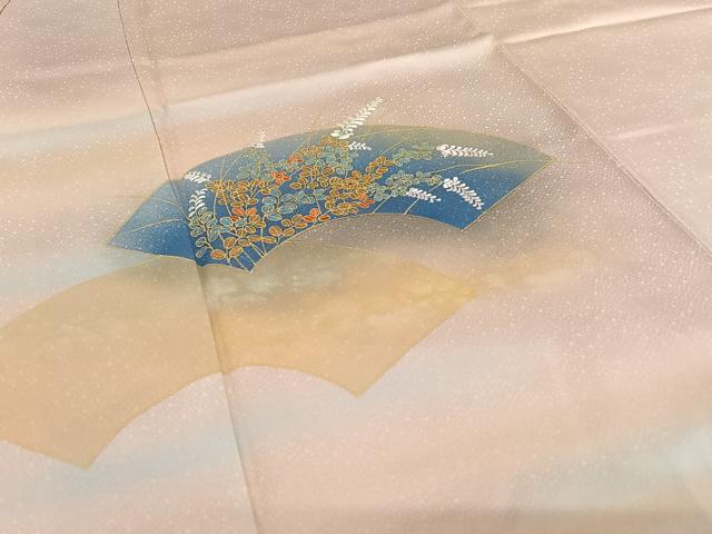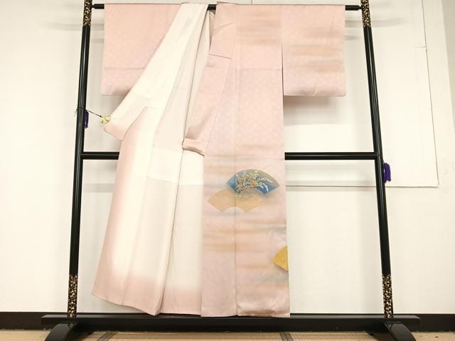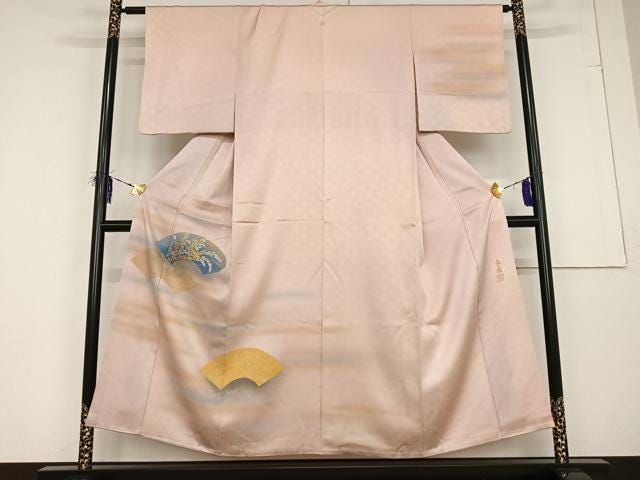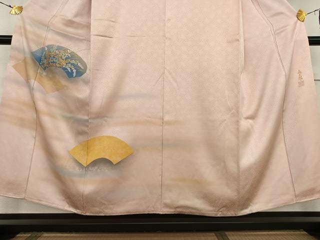 This is a remarkable vintage Houmongi kimono, crafted by Kizaburo Fukuda, father of the Living National Treasure embroidery artist Kiju Fukuda. It features delicate embroidery and gold-painted paper fan (uchiwa) motifs on pale pink silk with subtle ombré shading.