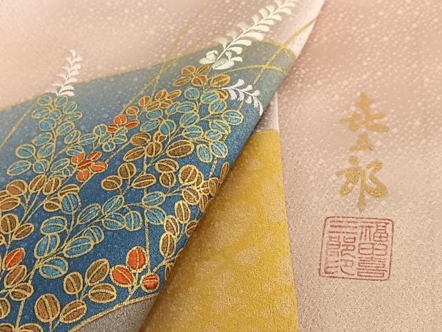 Kizaburo was a master of traditional Japanese embroidery, and his legacy was passed on to his son Kiju Fukuda, the only officially recognized embroidery Living National Treasure in Japan. Some of Kiju’s dyed works bear his father’s name in homage, as seen in this piece.