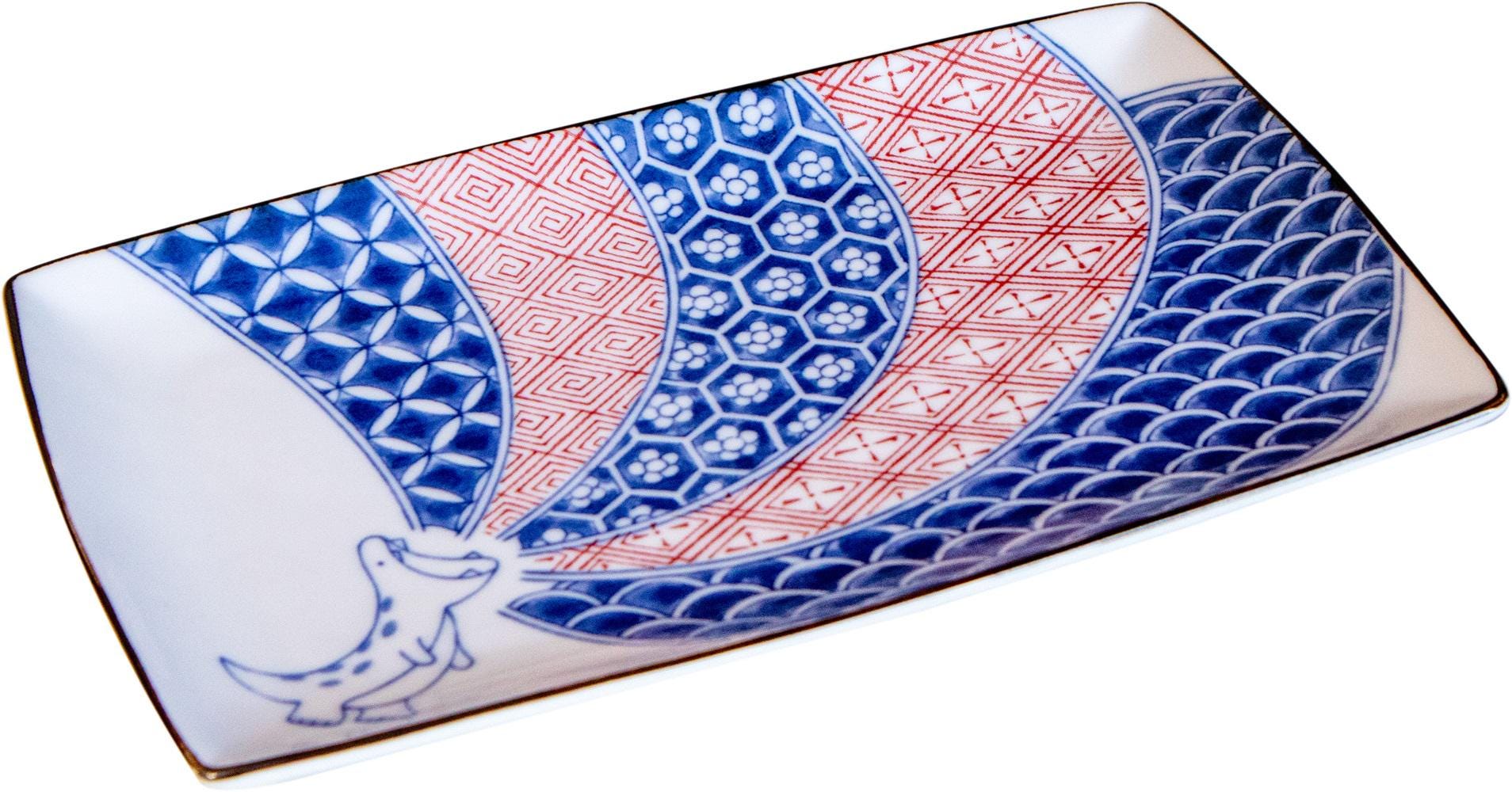 Add a playful and auspicious touch to your table with this Japanese rectangular plate featuring a charming dinosaur design. The pattern is inspired by Shonzui, a traditional motif that symbolizes good fortune.