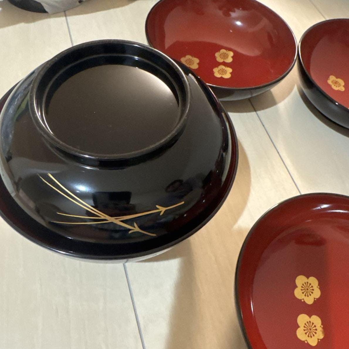 Aizu Lacquerware Bowl Set of 5 – Red & Black Japanese Soup Bowls with Gold Plum Blossoms, Lids and Instructions – New Unused Gift Set