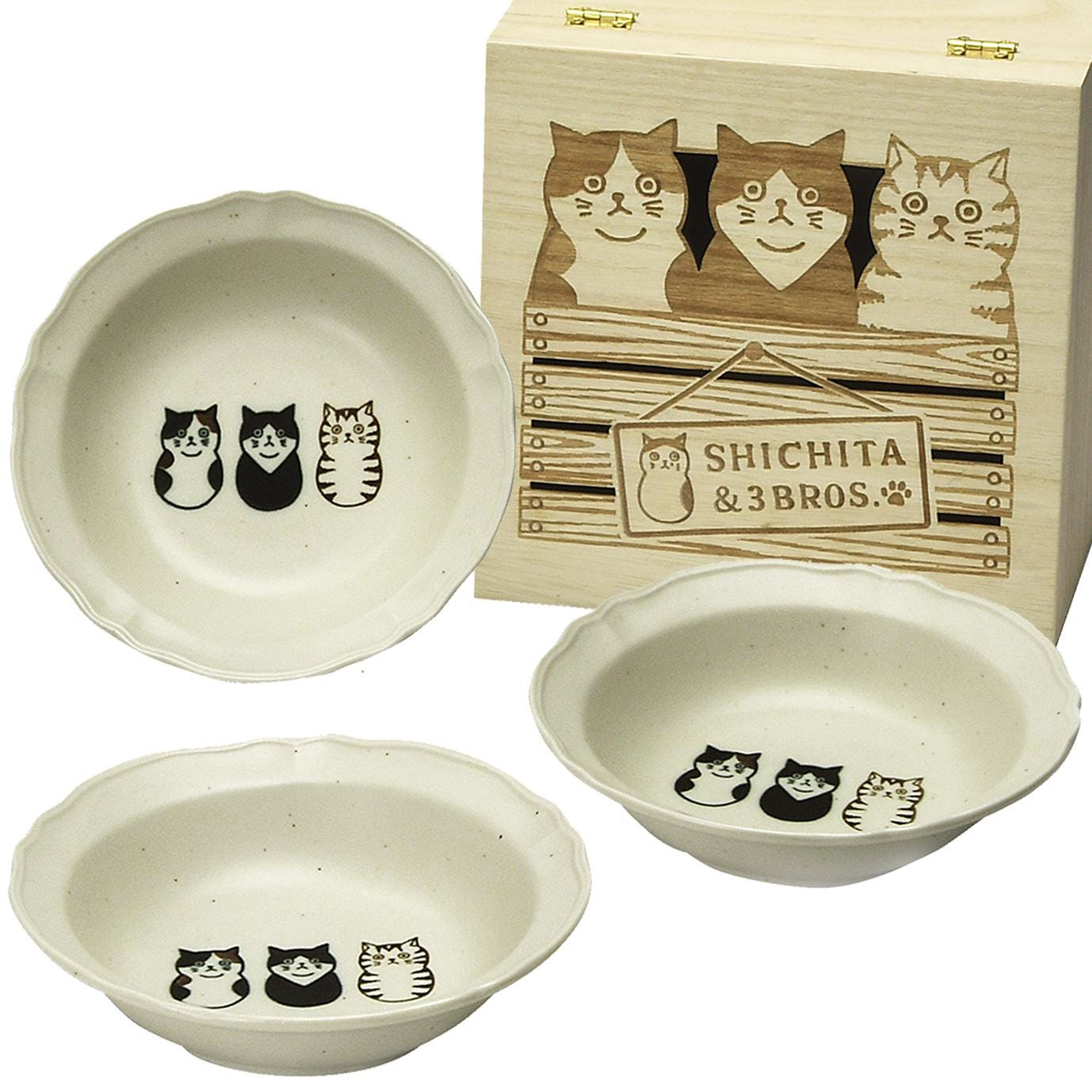 Japanese Cat Illustration Bowl Set of 3 Hand-Drawn Style Kitty Dishes Porcelain Kobachi Gift Wood Box