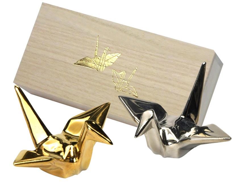 Japanese Crane Chopstick Rest Set of 2 - Gold and Silver Porcelain Auspicious Gift for Longevity and Marital Harmony| Forgot Souvenir