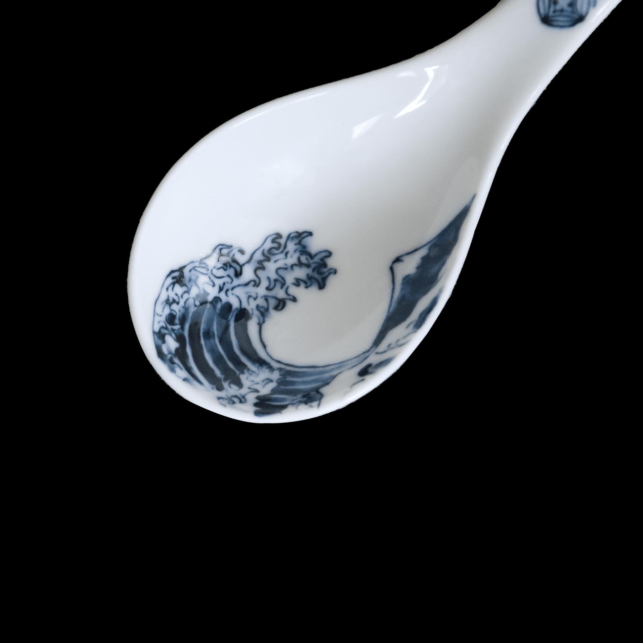 Japanese Porcelain Ramen Spoon with Hokusai Great Wave Design – Sometsuke Blue & White Spoon – Microwave and Dishwasher Safe – Made in Japan