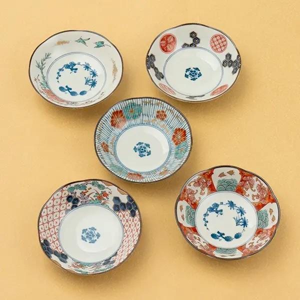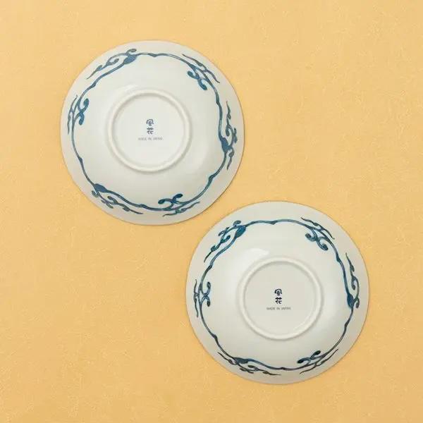 This beautiful set of five Japanese porcelain bowls brings the timeless elegance of the Koimari (Old Imari) style to your dining table. Each bowl is gracefully adorned with a vibrant "sometsuke" (underglaze blue) design, and the charming arabesque pattern on the back adds a delightful surprise.