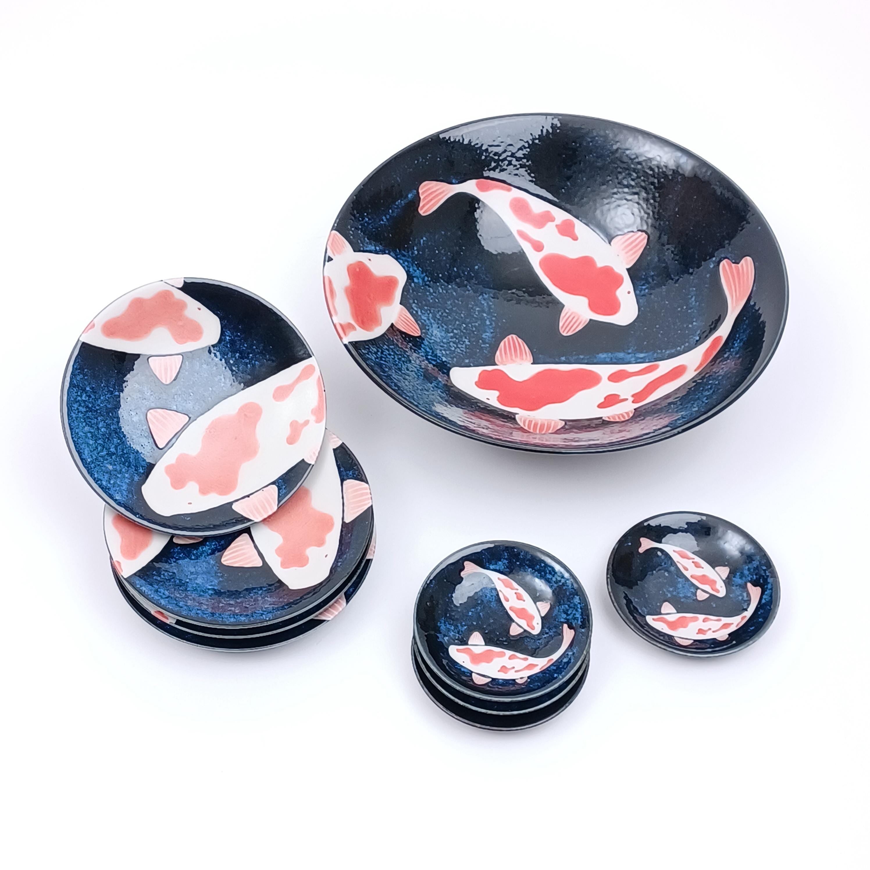 Made in Japan 9 pieces set Dish Bowl Blue Colored Carp Ceramic Awasaka Sinse 1961| Forgot Souvenir