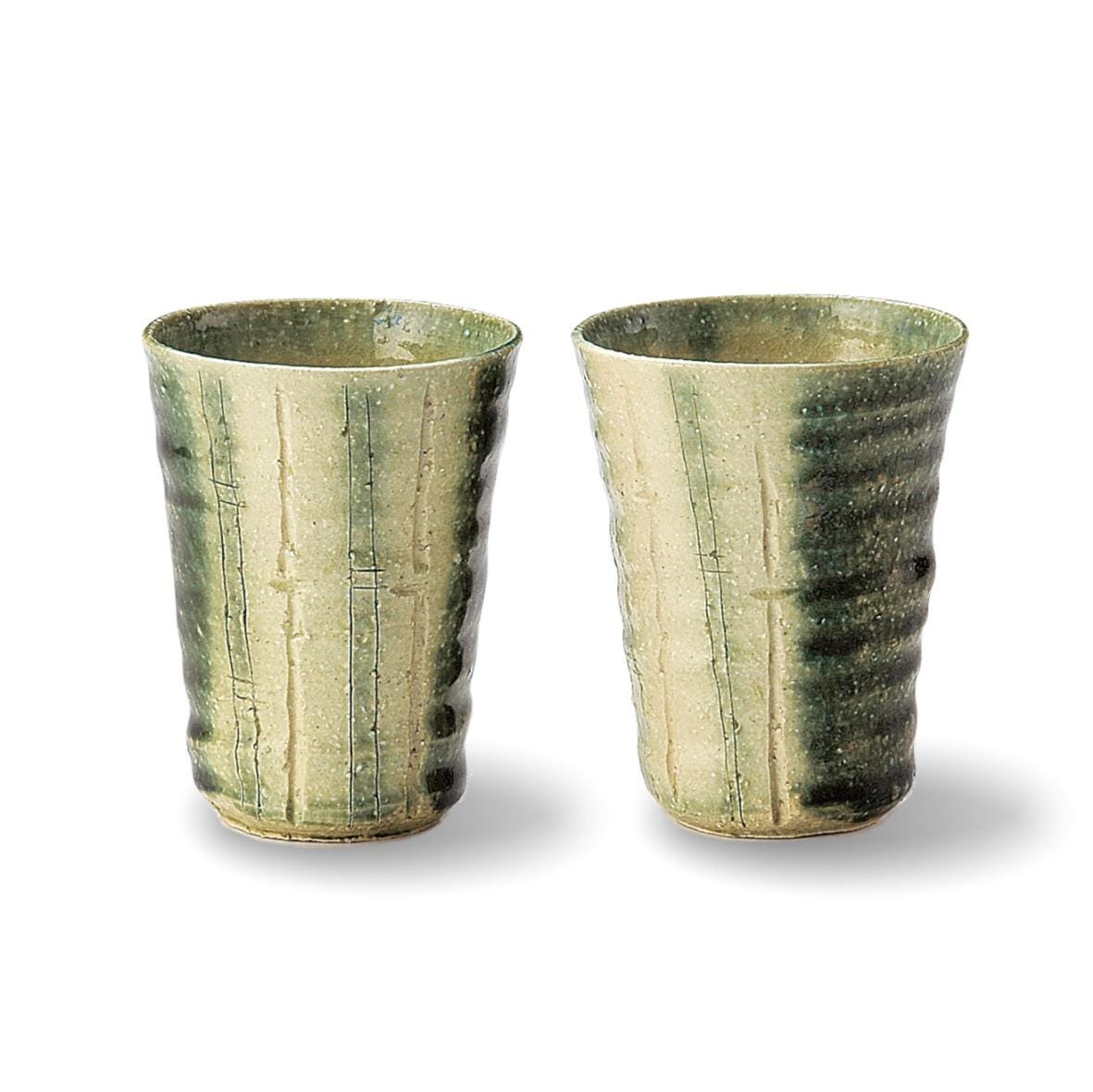 Made in Japan Awasaka porcelain Keiyama Kiln Wada Kazufumi Oribe Bamboo Carved Cup Pair for Gift Birthday Thanksgiving Wedding