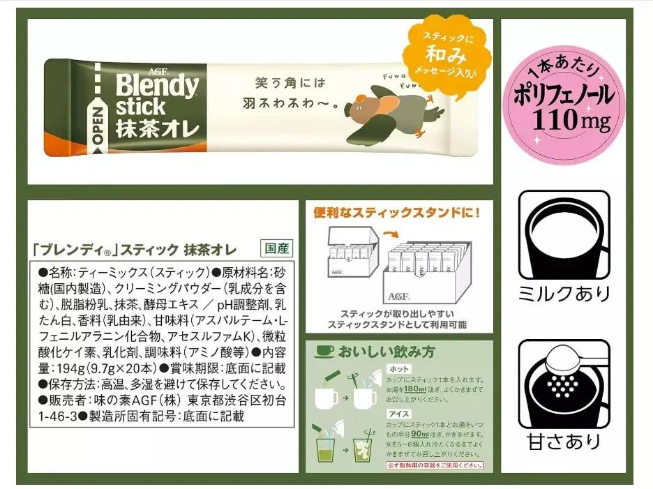 Matcha Latte Japanese Blendy Stick - 20 Instant Matcha Milk Tea Sticks - Authentic Japan Green Tea Powder