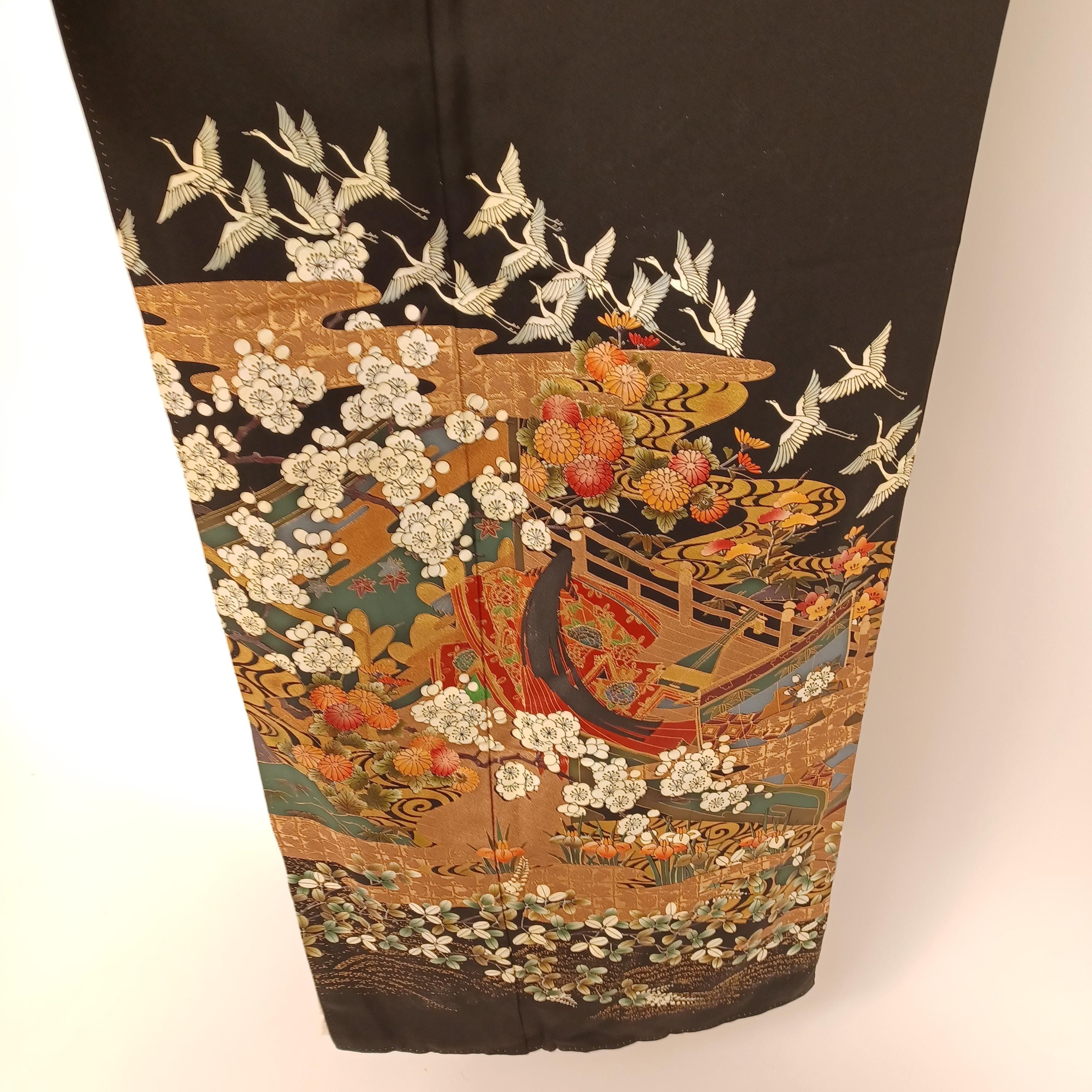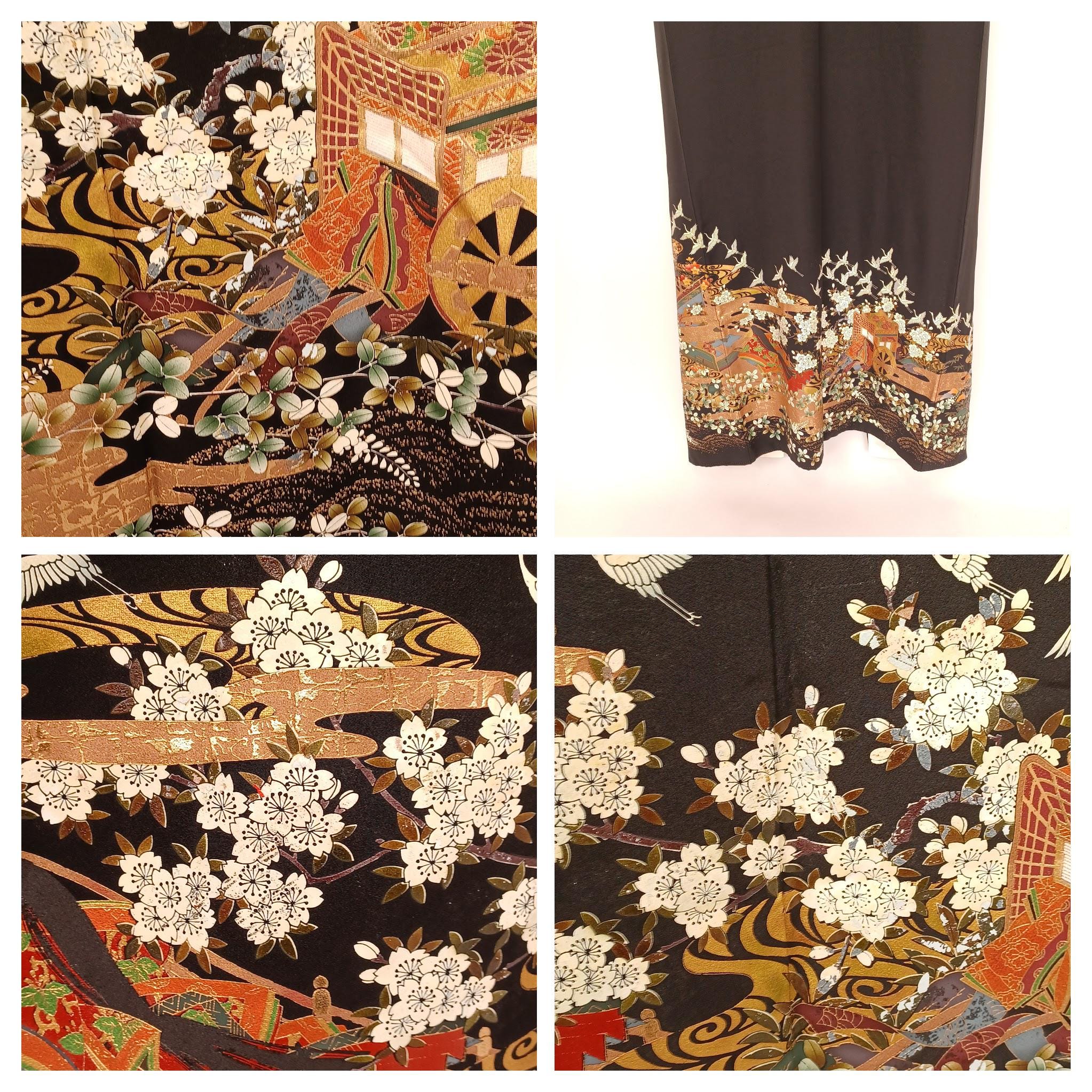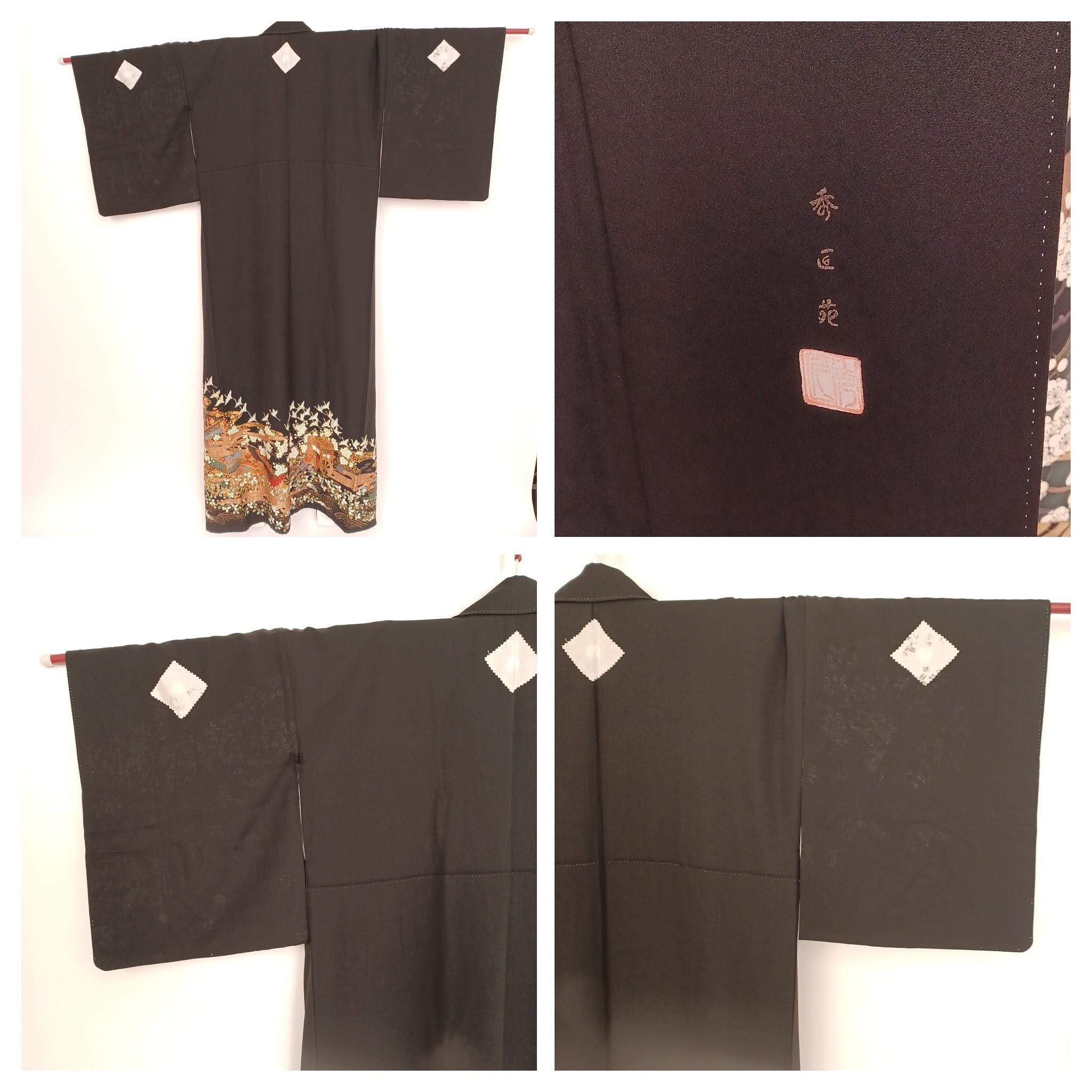 Unused Japanese Kurotomesode Kimono with Gold Floral & Gosho Cart, Minor Dye Transfer, 66in, 168cm, Formal Wear