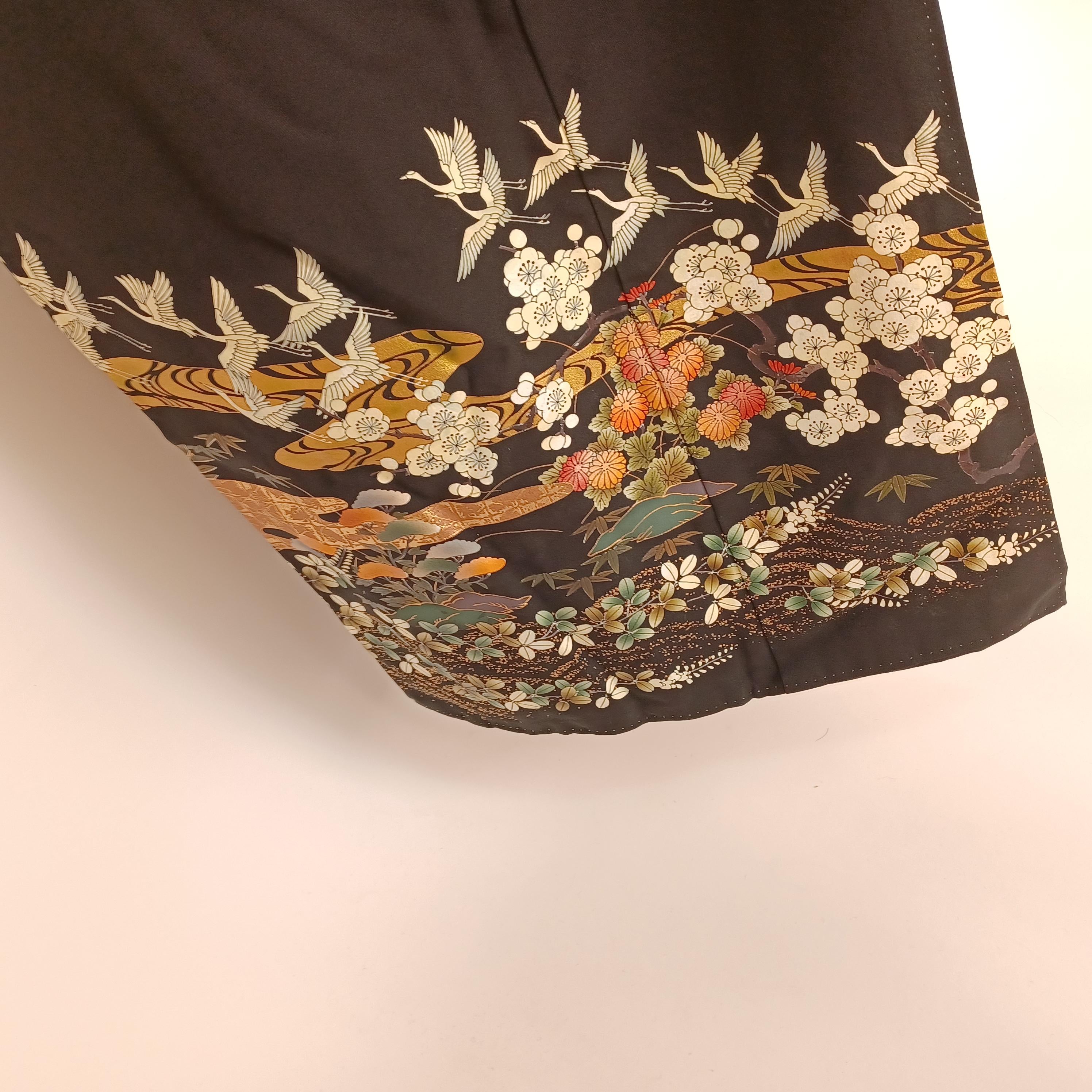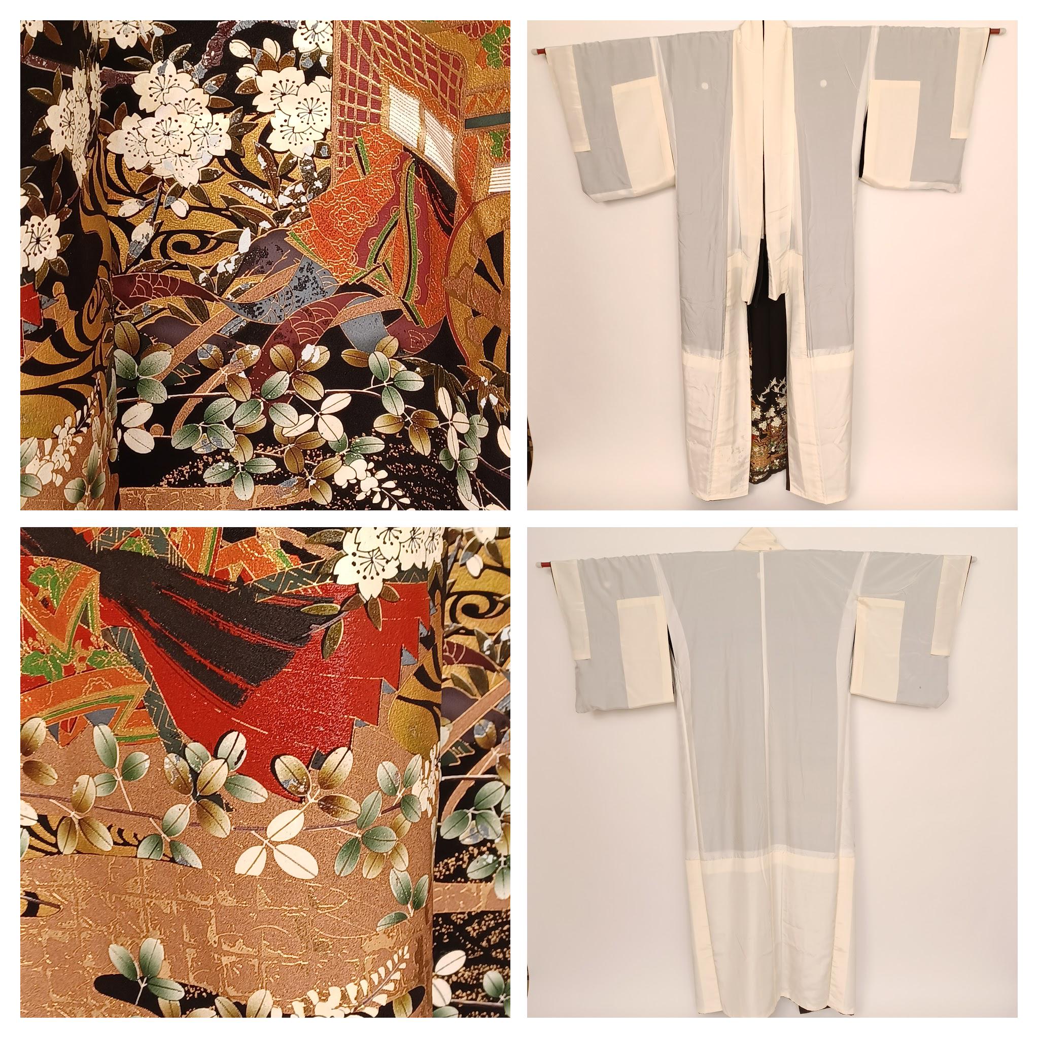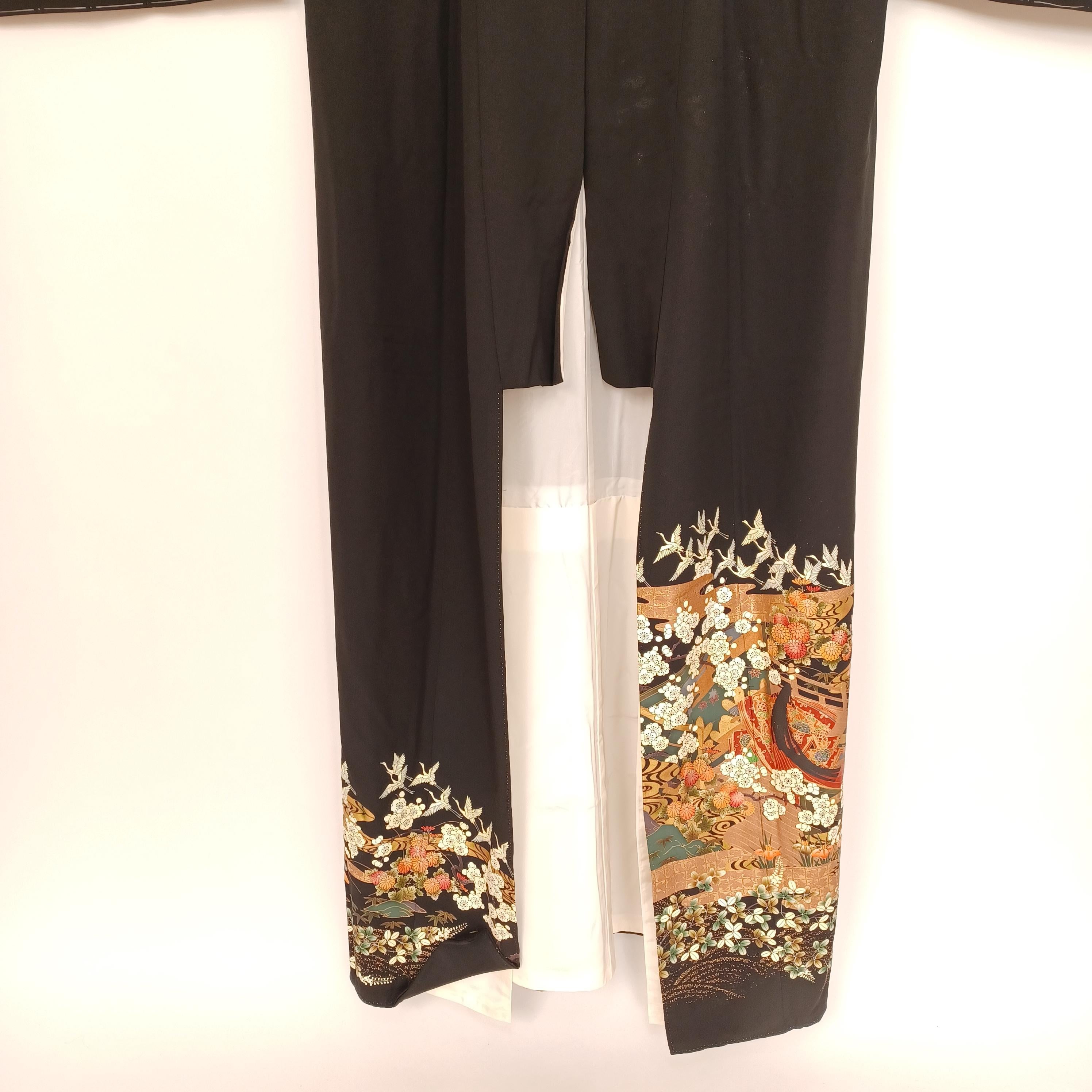 Unused Japanese Kurotomesode Kimono with Gold Floral & Gosho Cart, Minor Dye Transfer, 66in, 168cm, Formal Wear