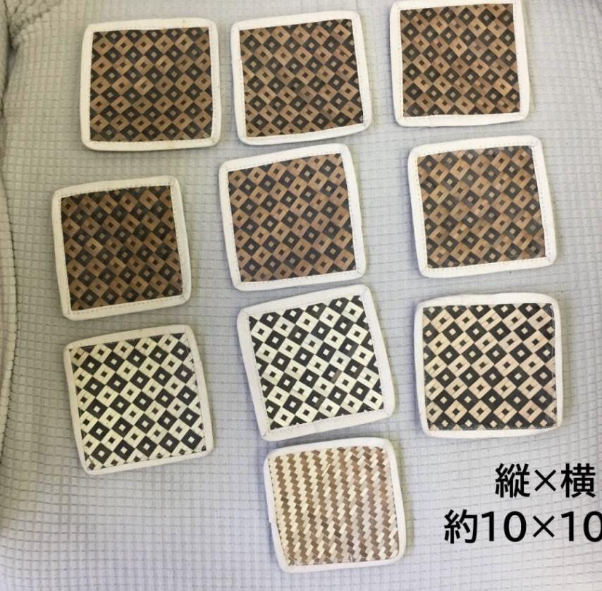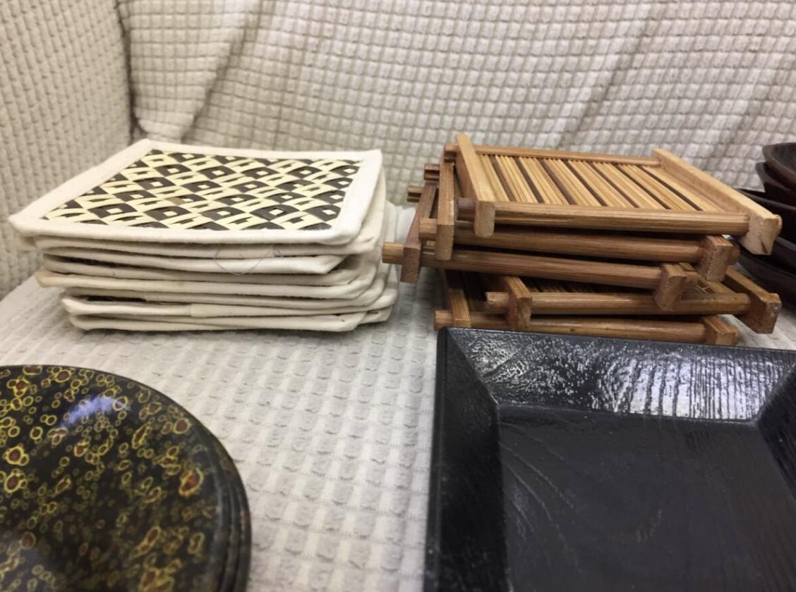 This is a large mixed lot of 34 used Japanese coasters and small dishes. The collection includes various styles, such as traditional Japanese designs, modern designs, and intricate Yosegi-zaiku (Japanese parquet) woodcraft.