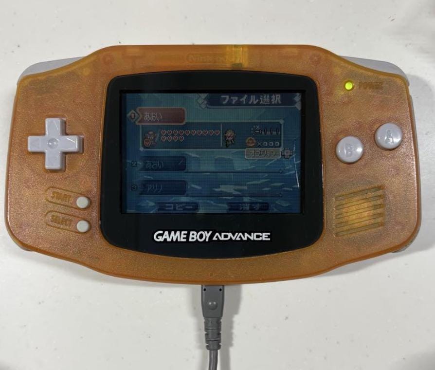 This is an original Game Boy Advance console in orange front with a clear red back shell.