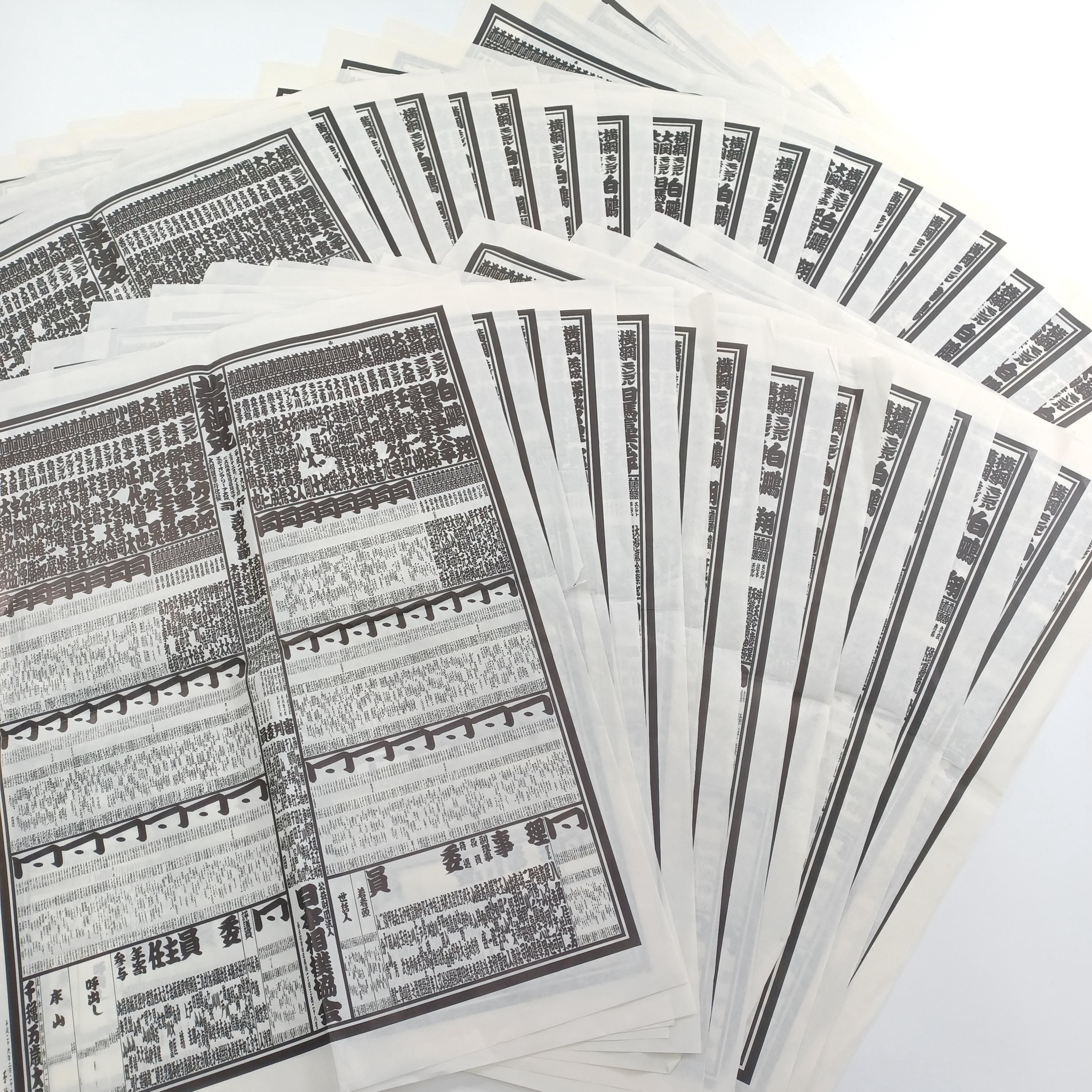 This is a large collection (bulk lot) of 32 official Japanese Sumo Wrestling ranking lists, known as Banzuke-hyo (番付表).