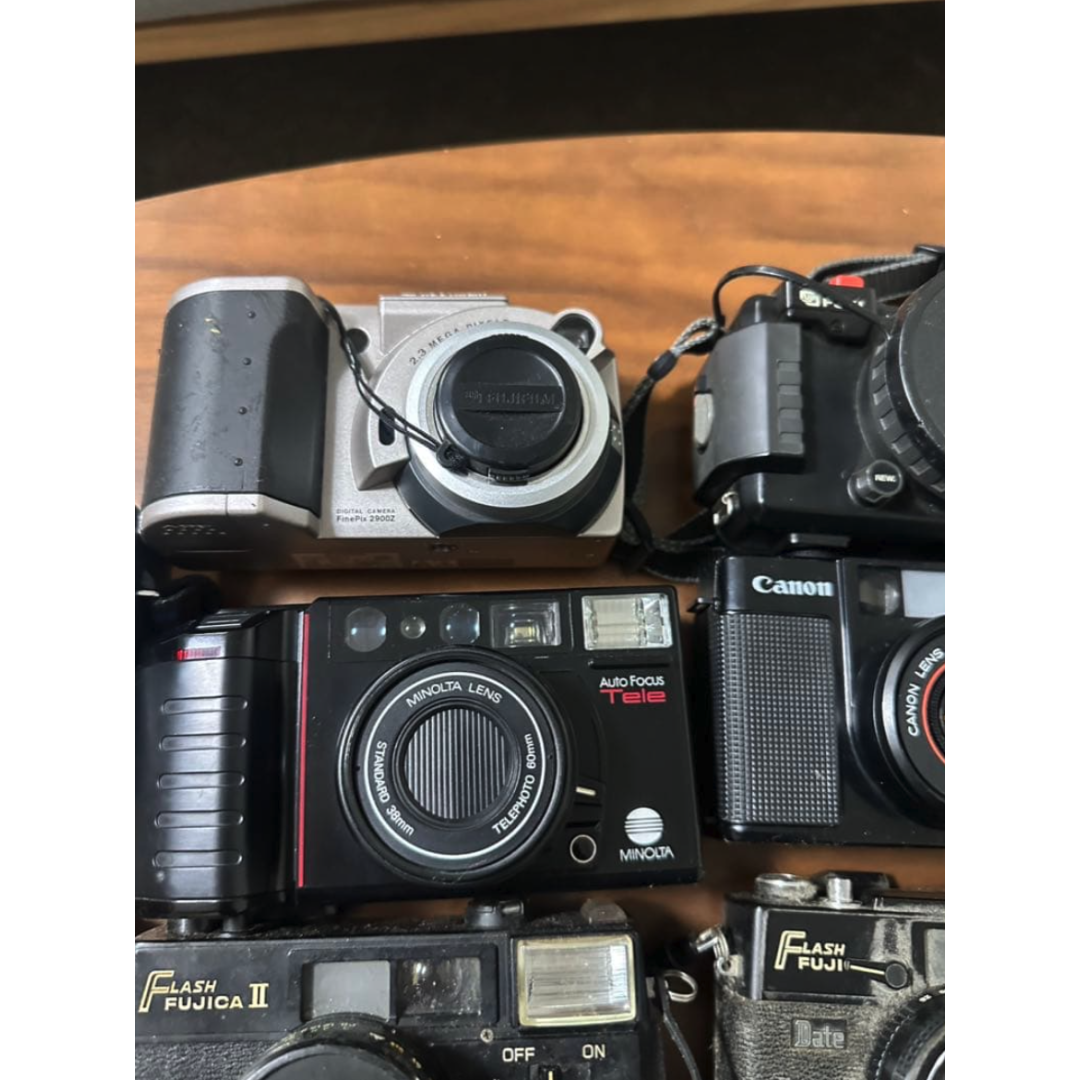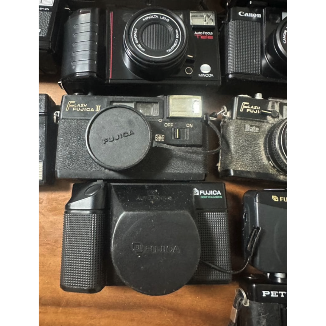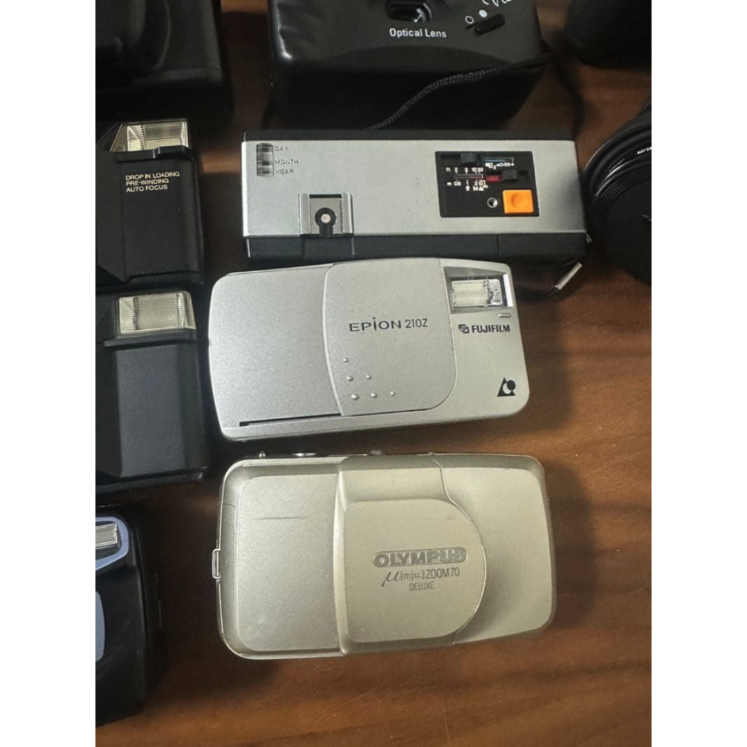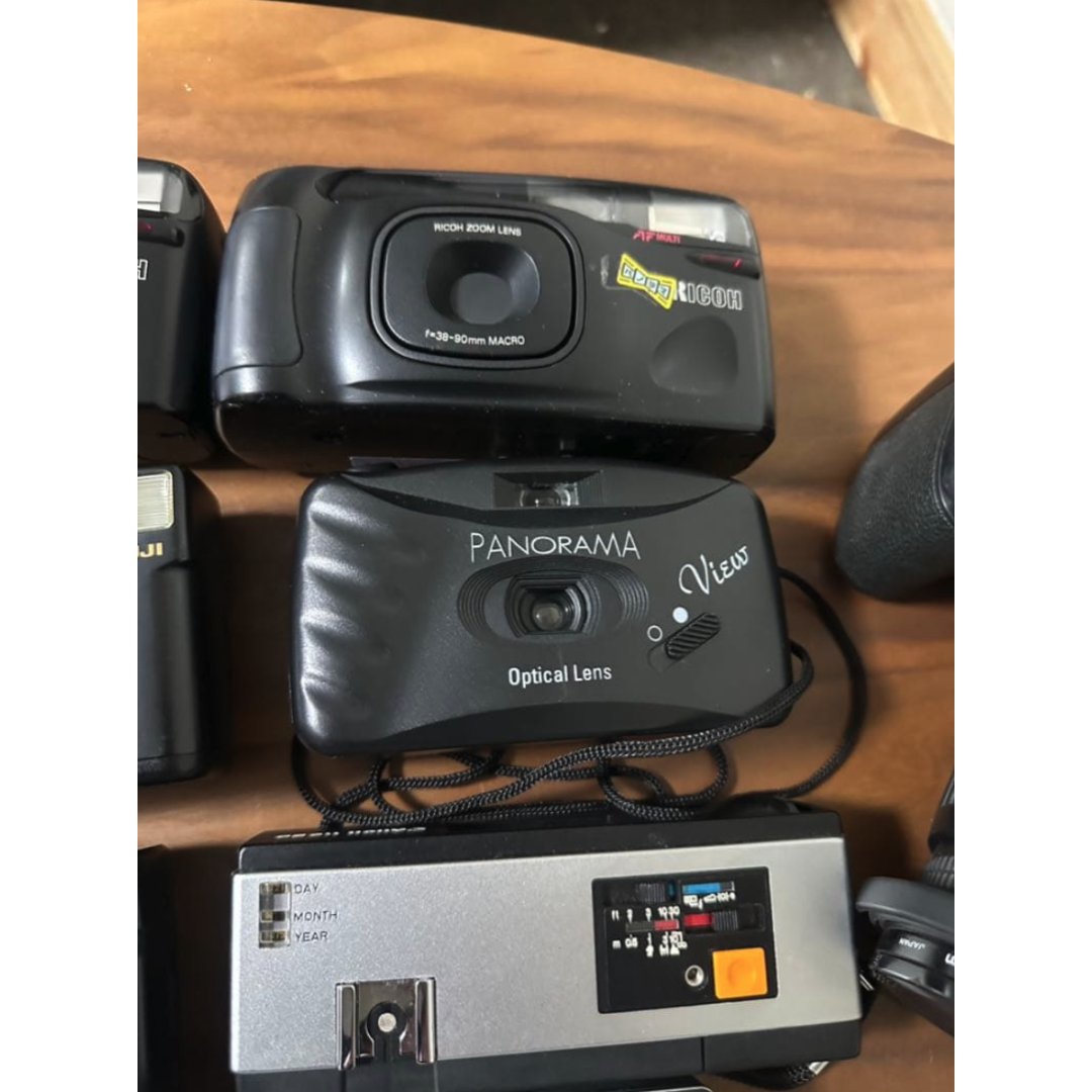 This is a massive collection of 22 cameras, including film, compact, and digital models. This lot is perfect for camera enthusiasts, collectors, or those looking for repair projects and parts.