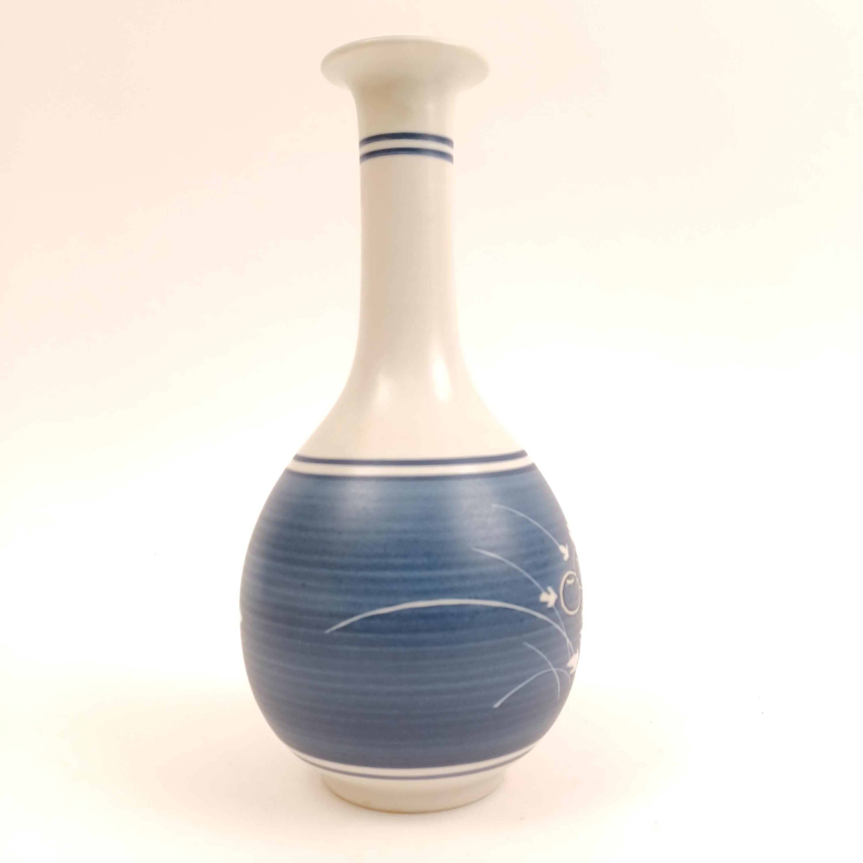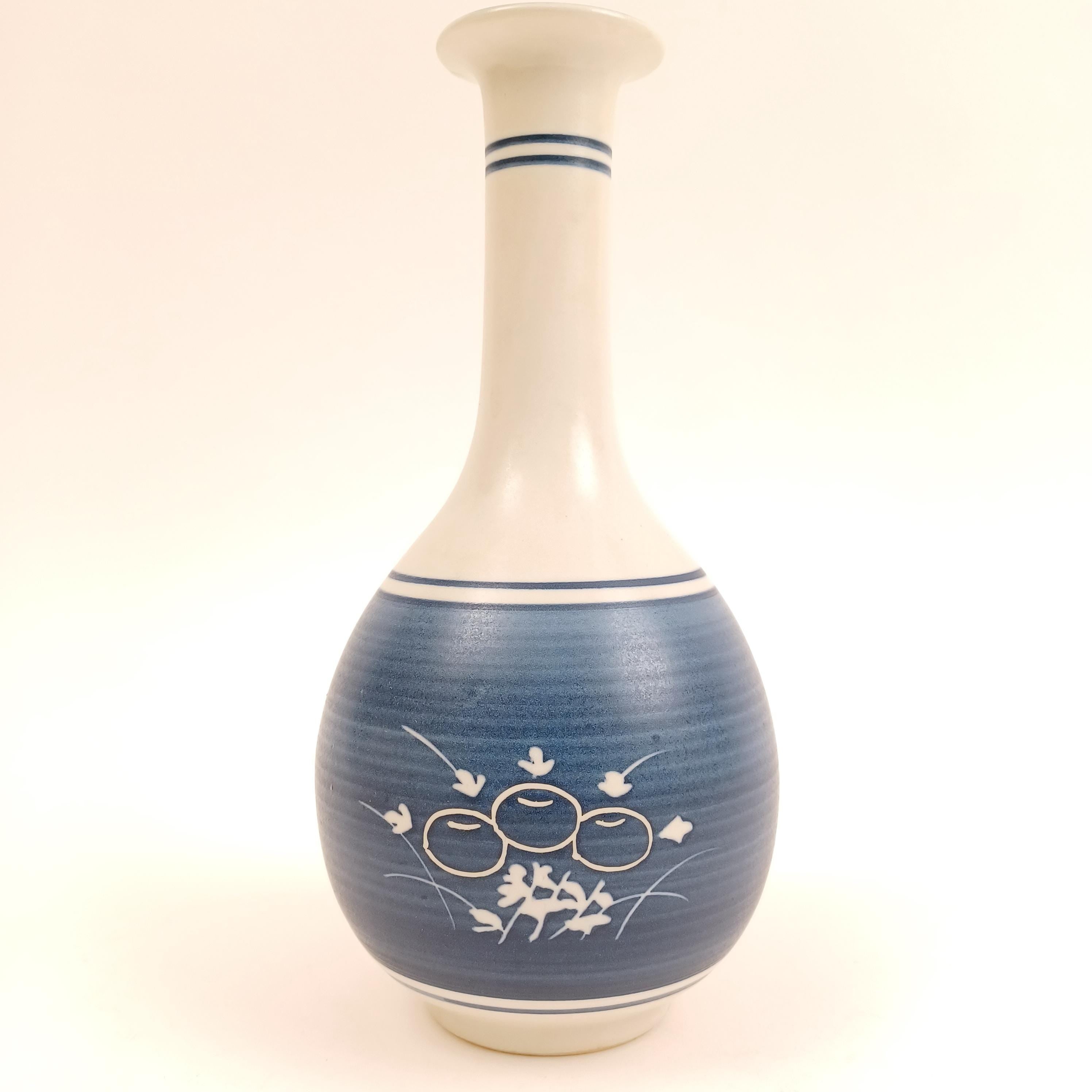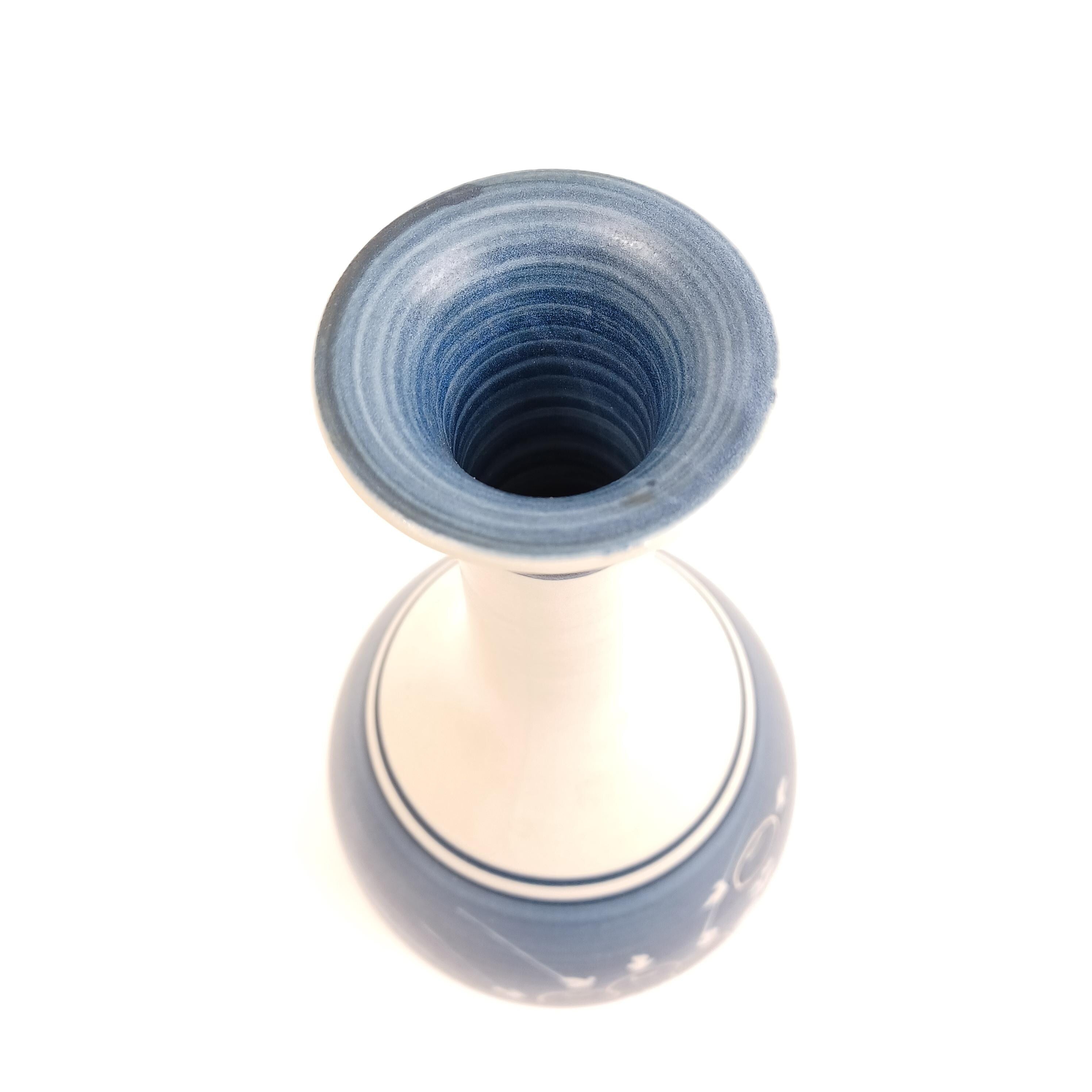 This is a traditional Japanese ceramic vase (Hanakei) crafted by the renowned Takumi kiln in Yaizu, Shizuoka. Featuring a beautifully hand-painted Gosu blue glaze and the classic Giku-sendan (chrysanthemum band) motif, this vase embodies the refined aesthetic of mid-20th-century Japanese ceramic artistry.