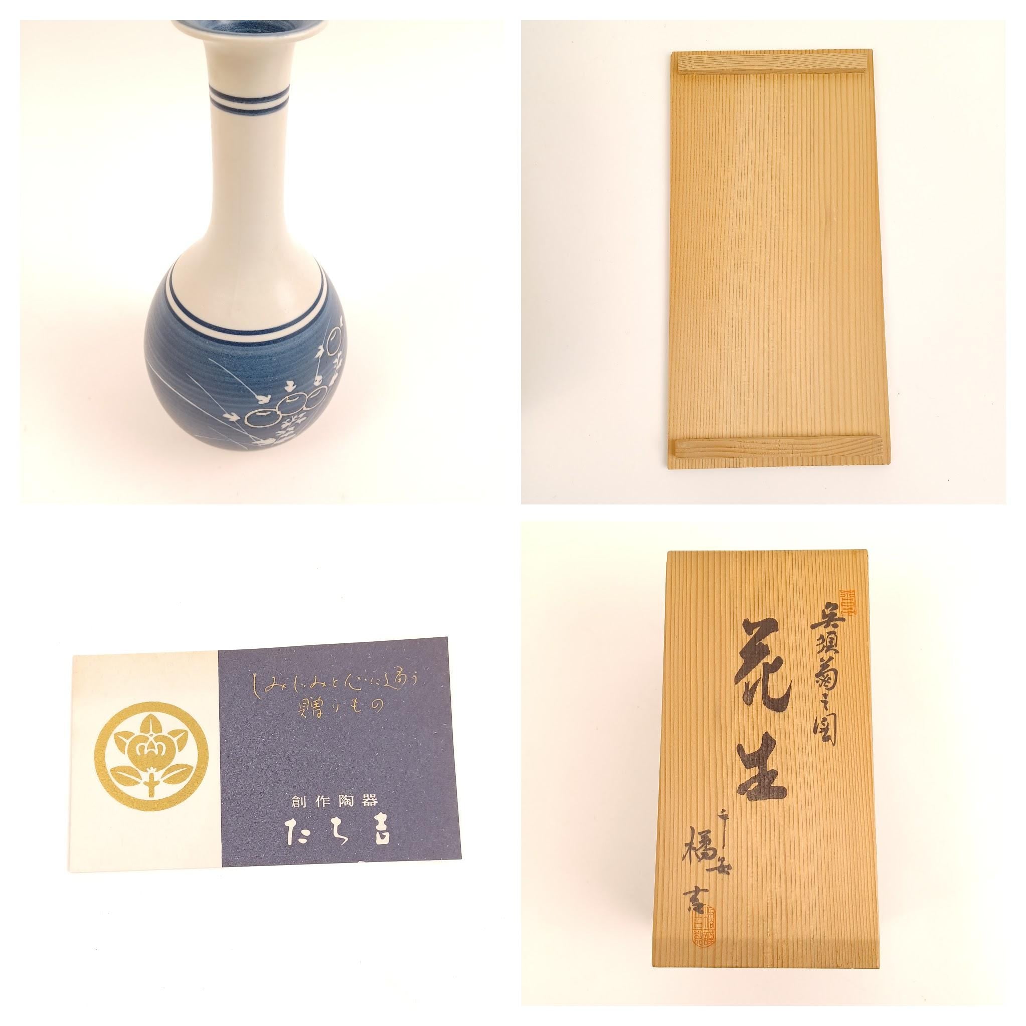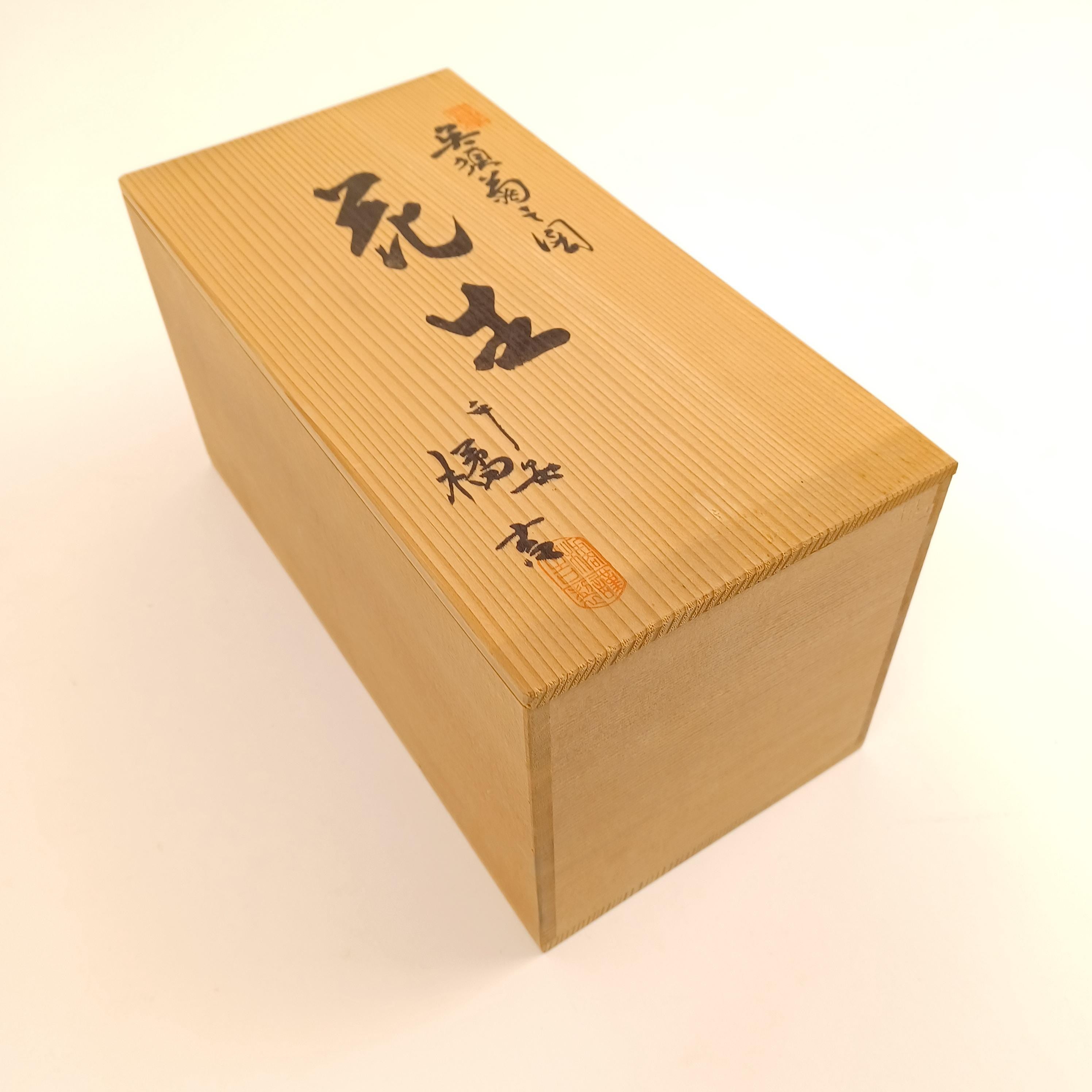 The vase comes with its original signed tomobako (wooden box) and brand card, indicating it was likely created as a premium gift item. A fine piece for collectors or anyone who appreciates traditional Japanese craftsmanship.