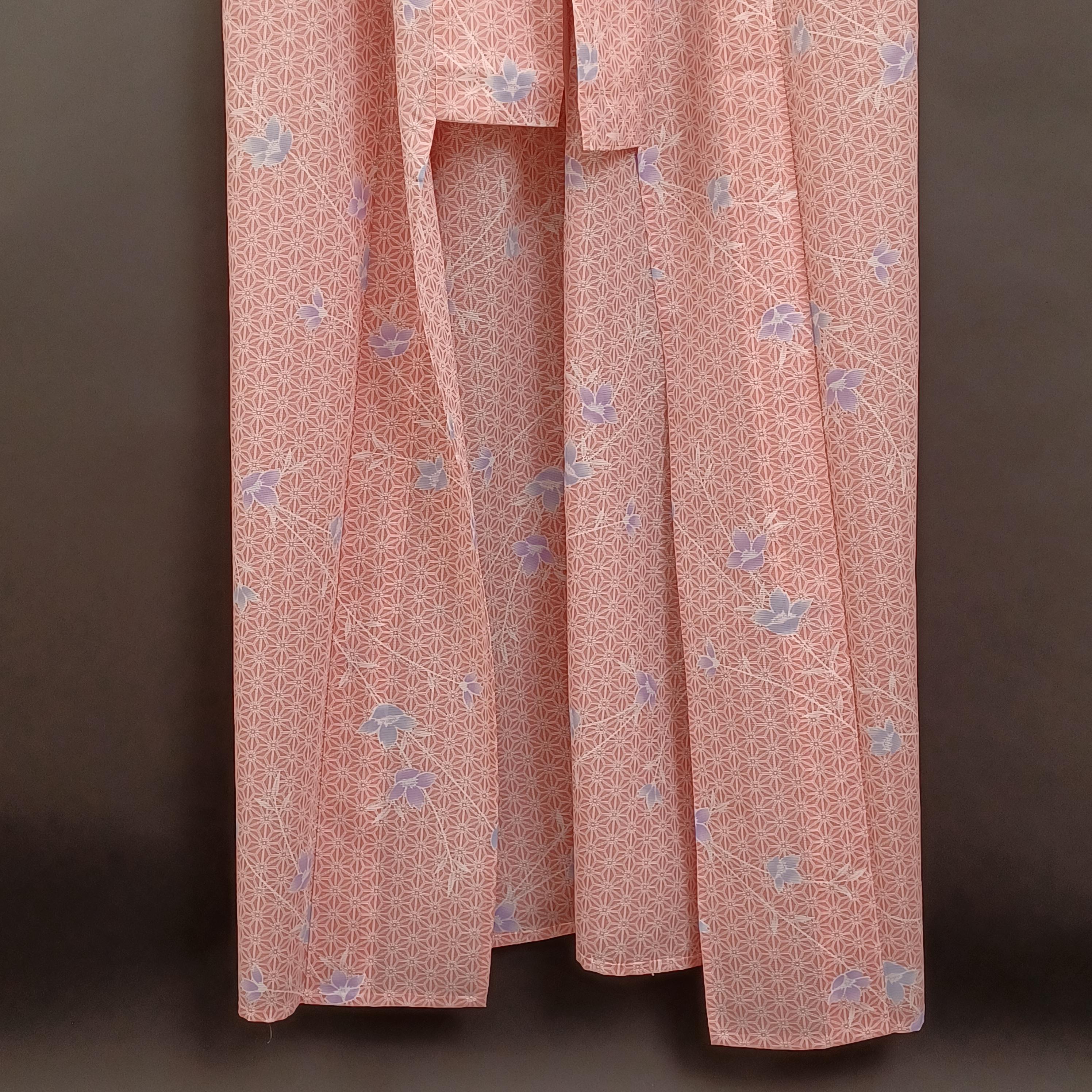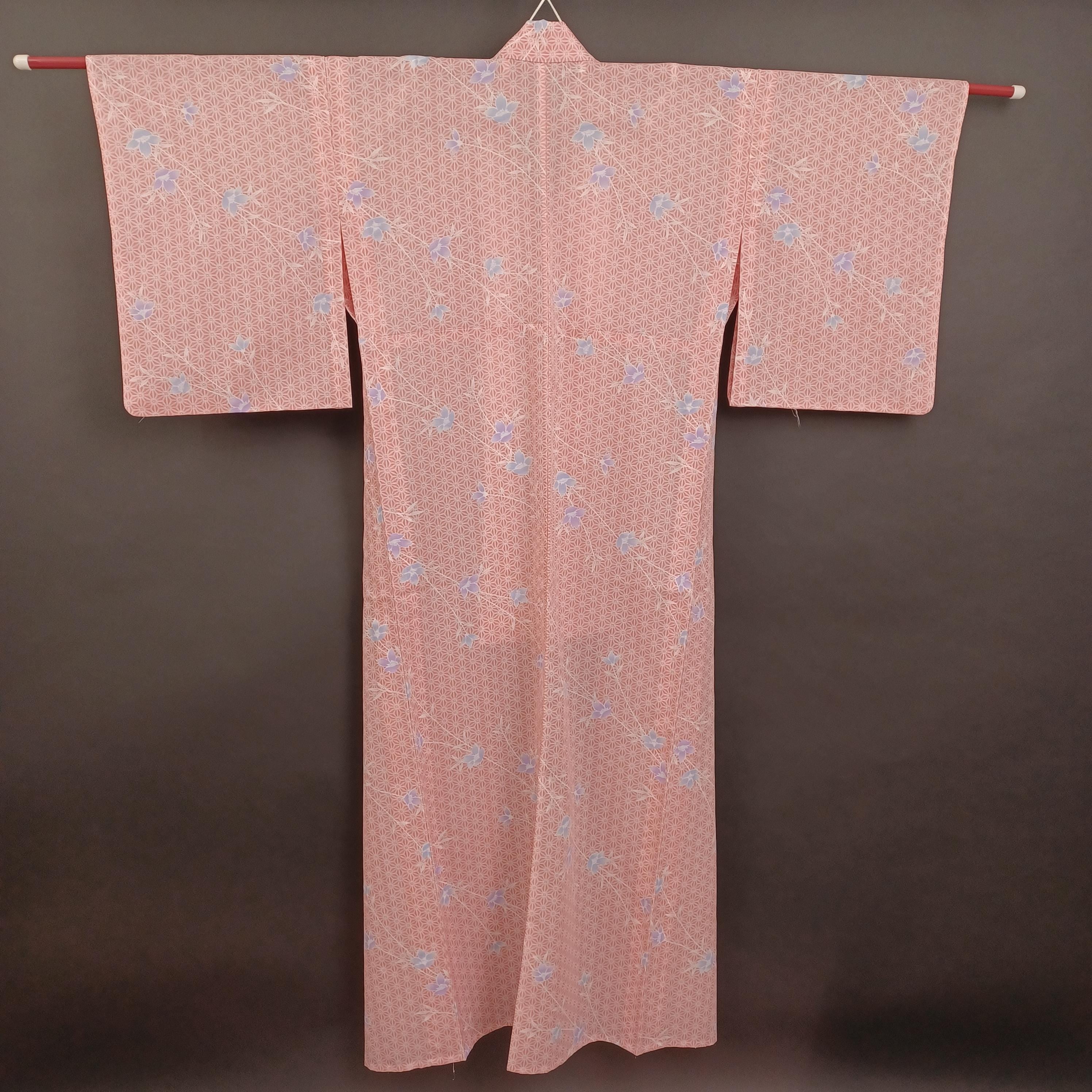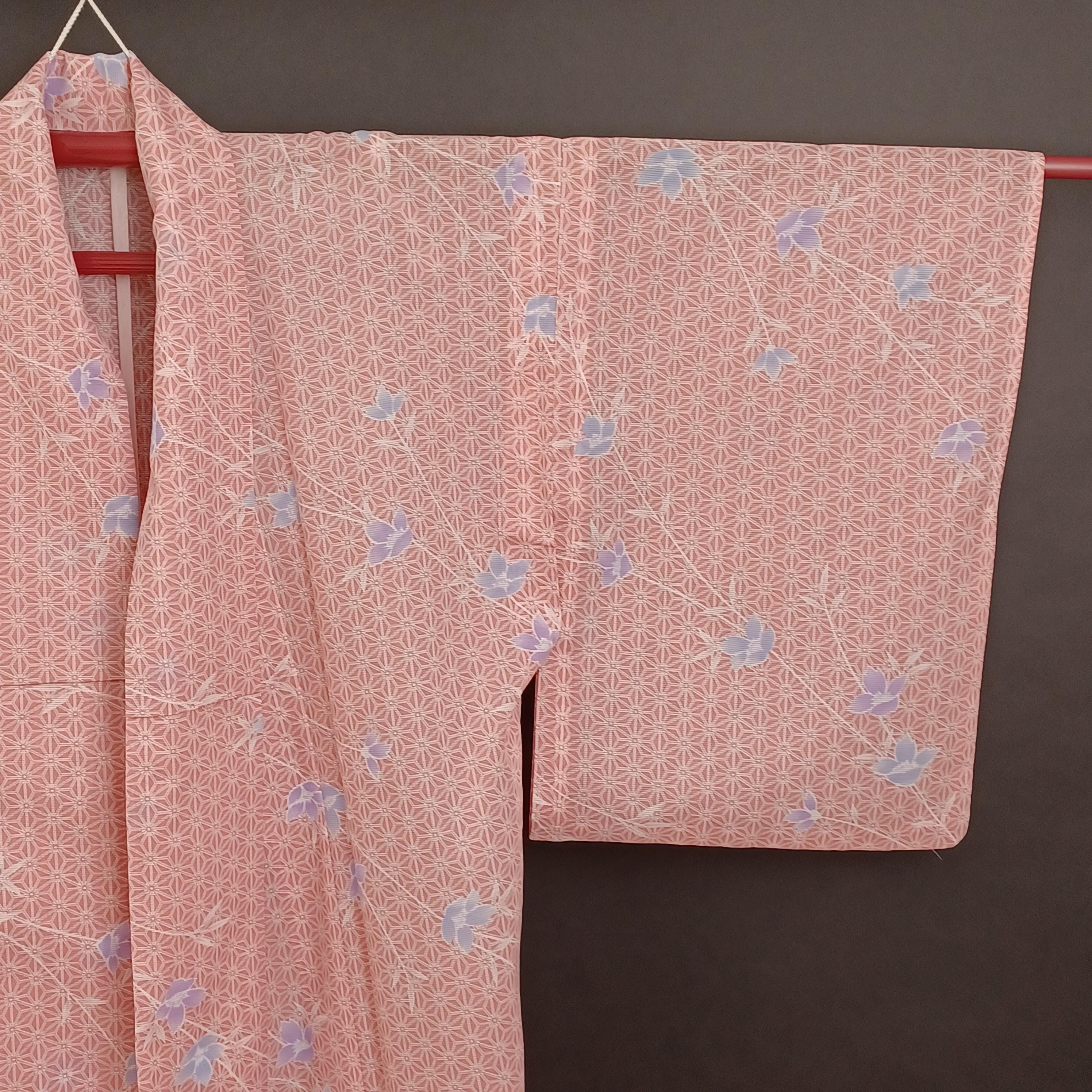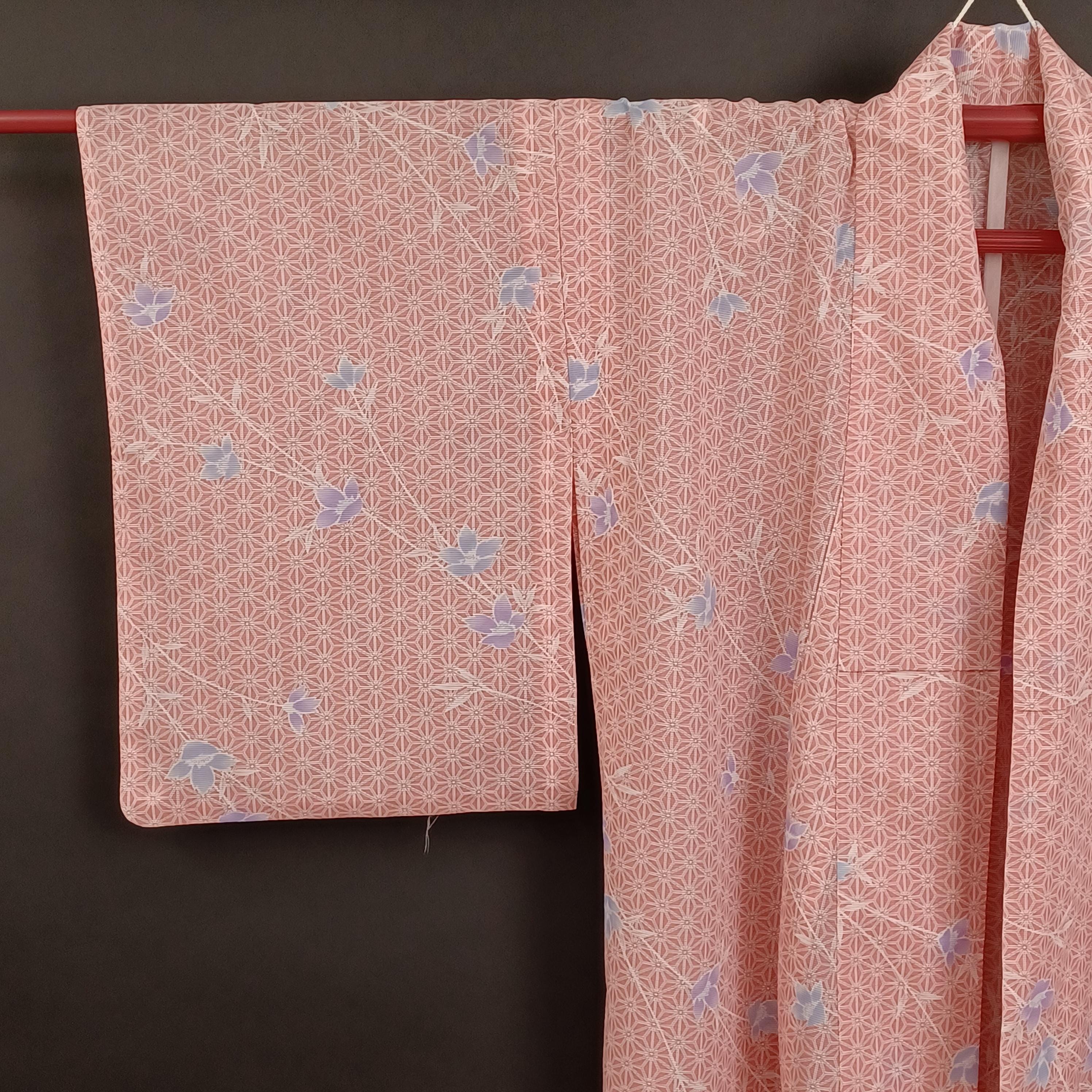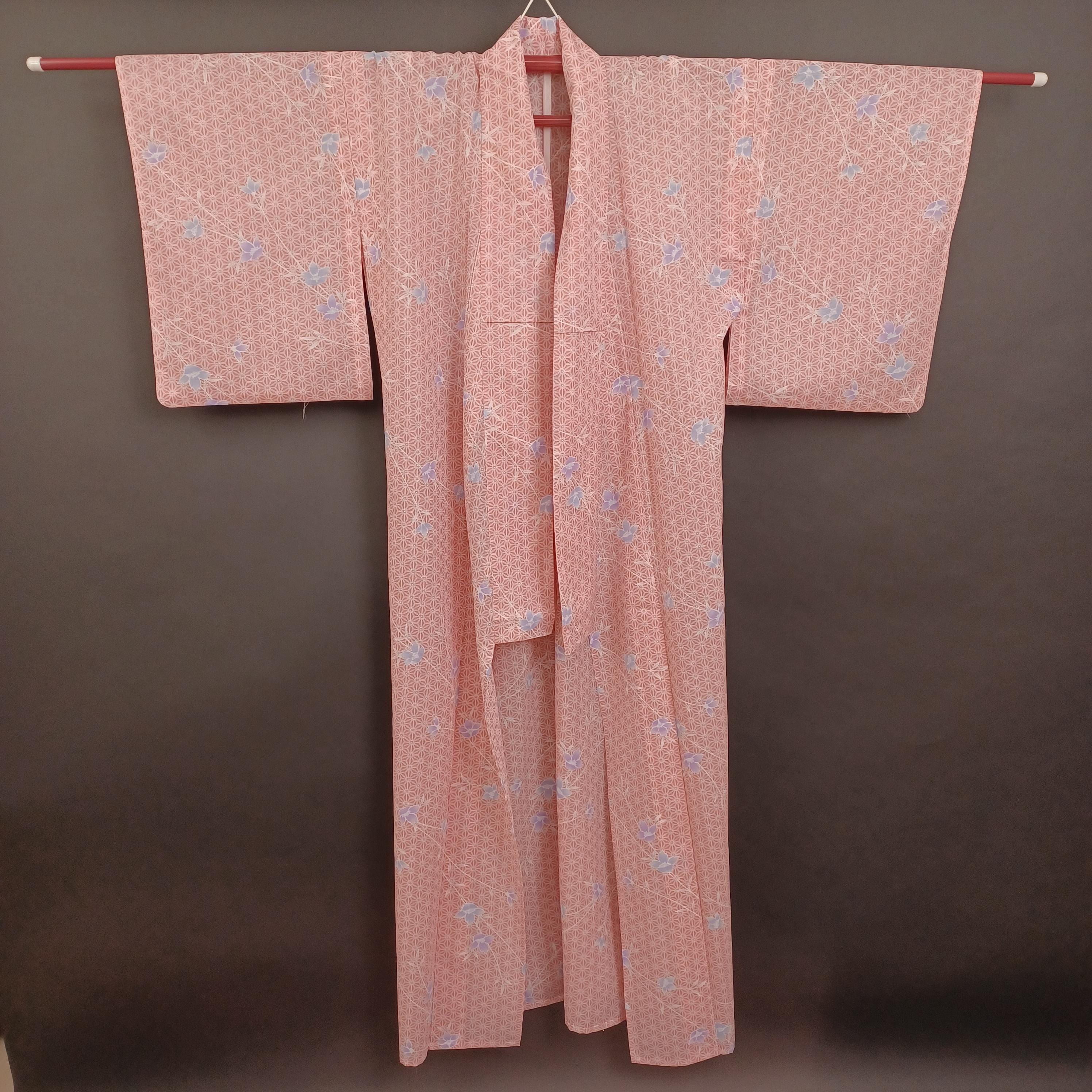 This kimono features a beautiful floral motif on a traditional Japanese pattern, making it a truly unique and elegant piece. Its flowing design is perfect for formal occasions, as a unique home decor piece, or even for craft projects.