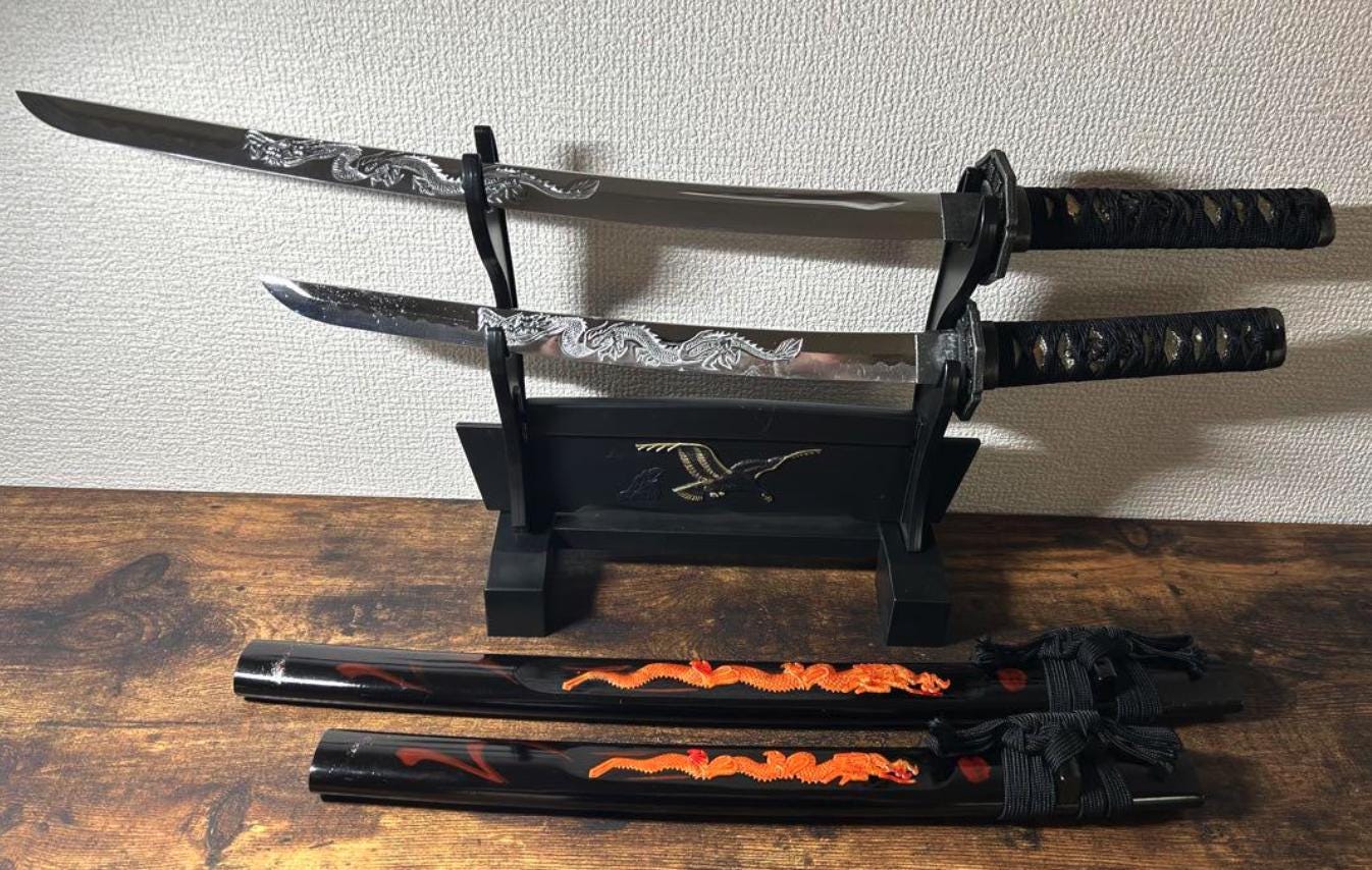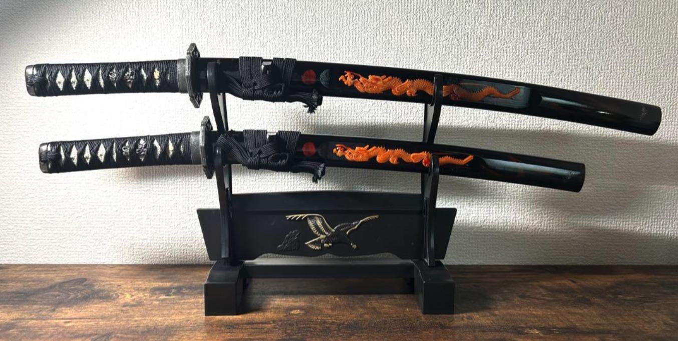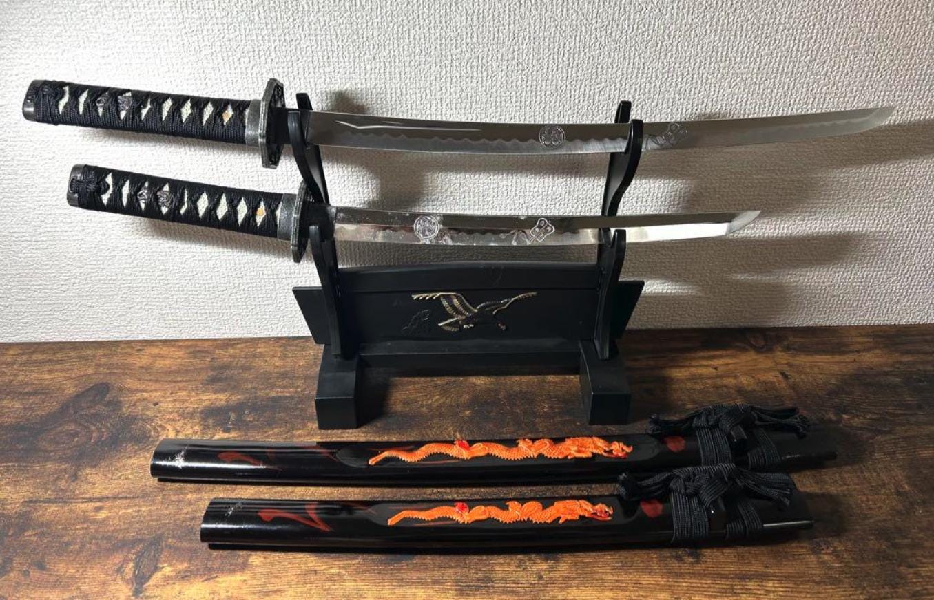 This is a Used set of two Japanese Katana Sword Replicas (Daisho), including one long sword and one short sword, along with a plastic display stand. 🇯🇵 These are Ornamental Metal Replicas intended primarily for display and decor.