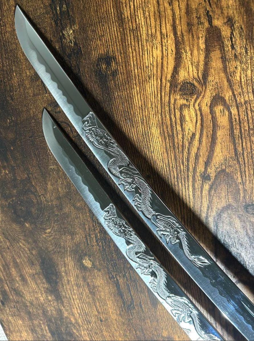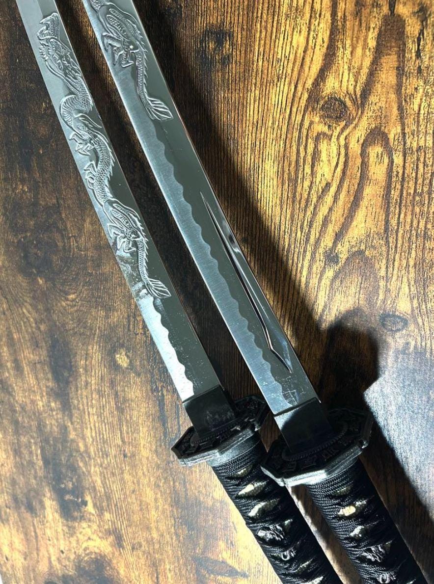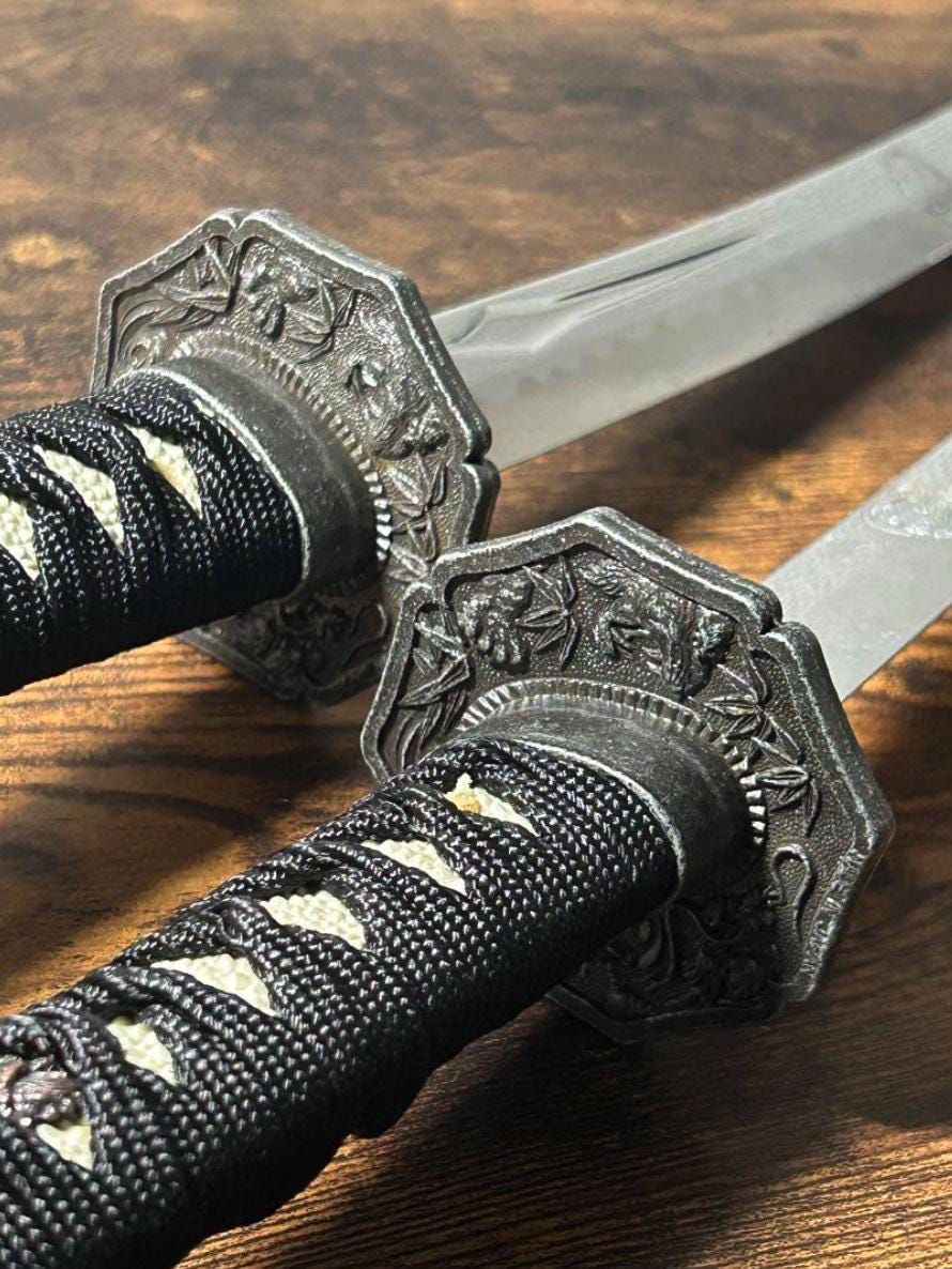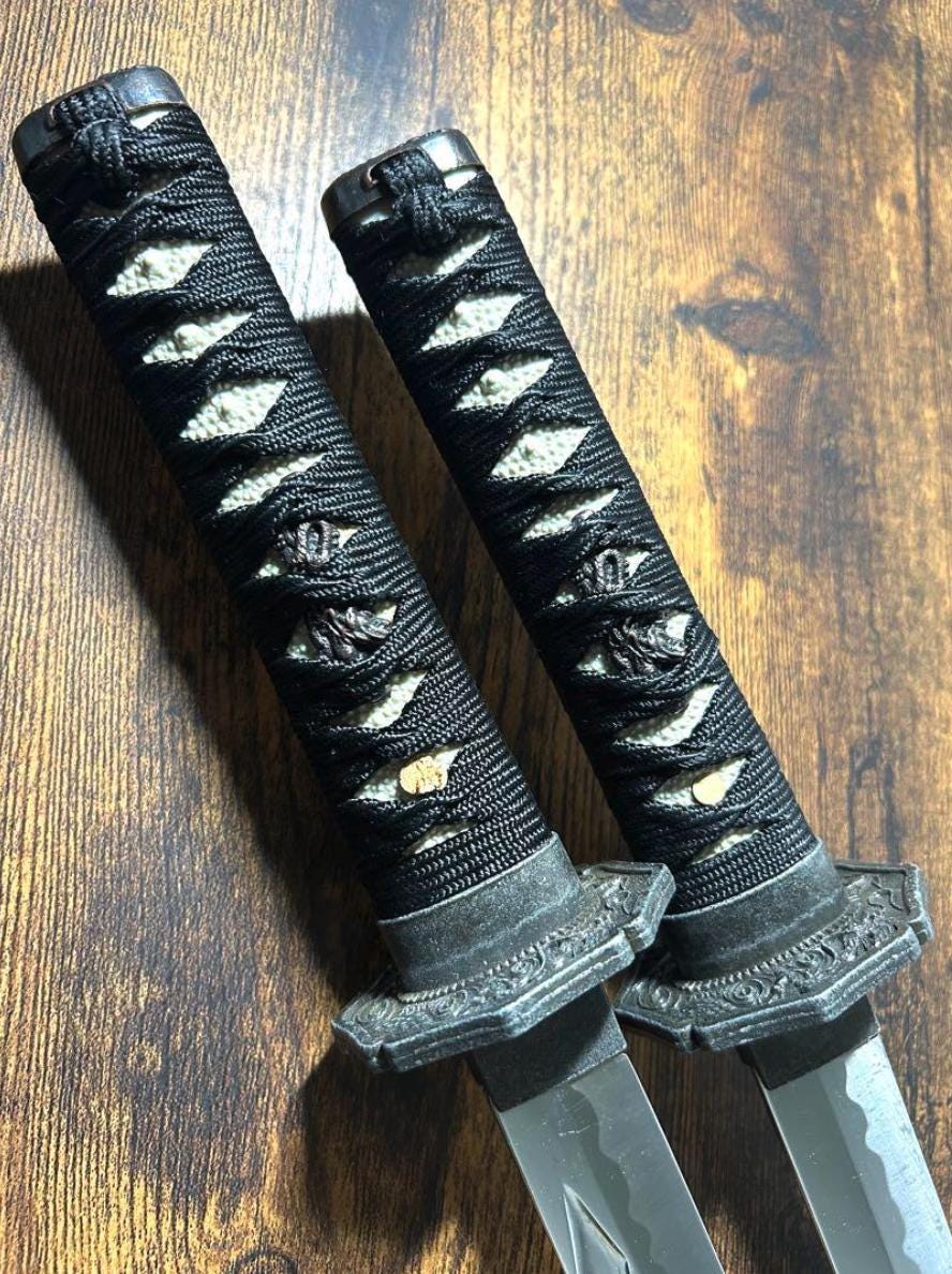 This is a Used set of two Japanese Katana Sword Replicas (Daisho), including one long sword and one short sword, along with a plastic display stand. 🇯🇵 These are Ornamental Metal Replicas intended primarily for display and decor.