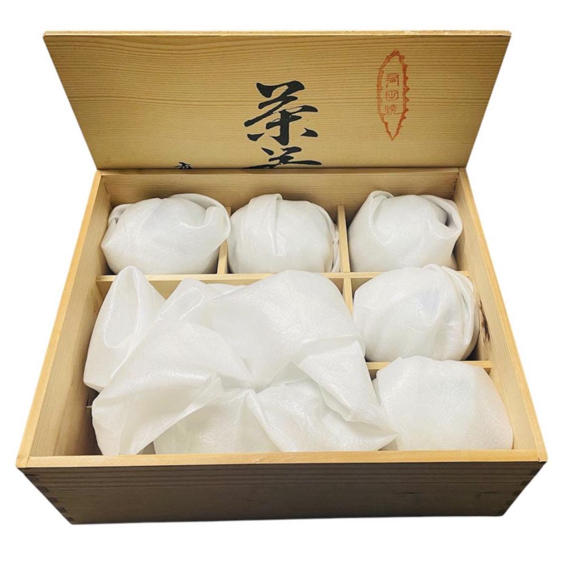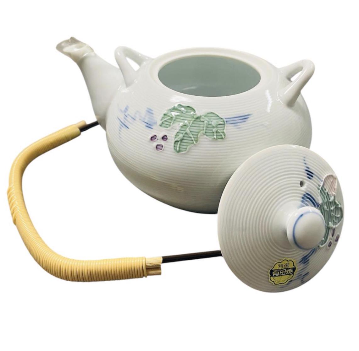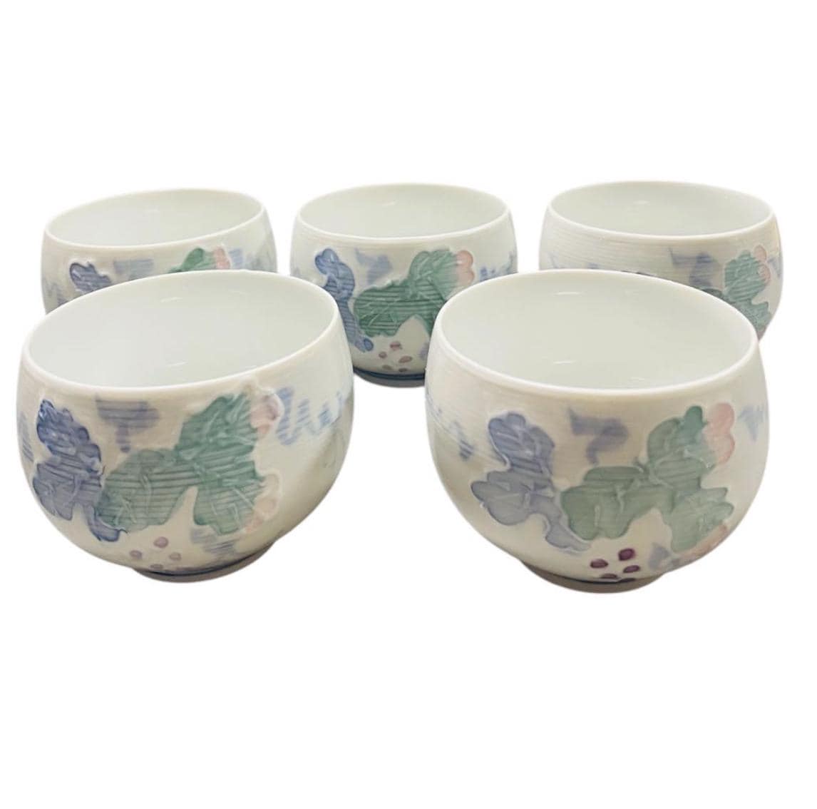 Used Japanese Teapot Set in Wooden Box – White Floral Pot with 5 Yunomi Teacups – Porcelain – Handcrafted Arita Ware – Made in Japan