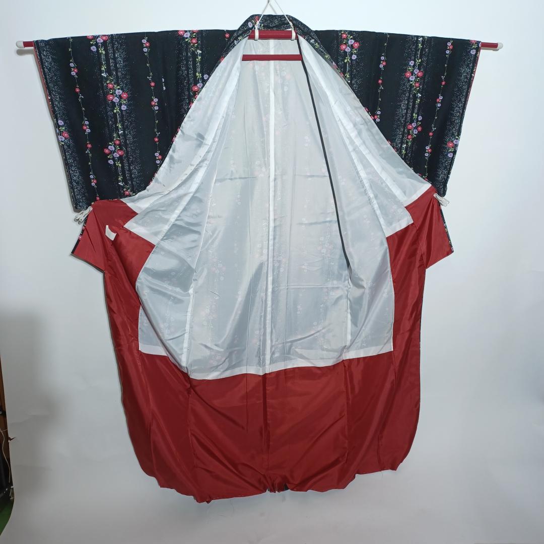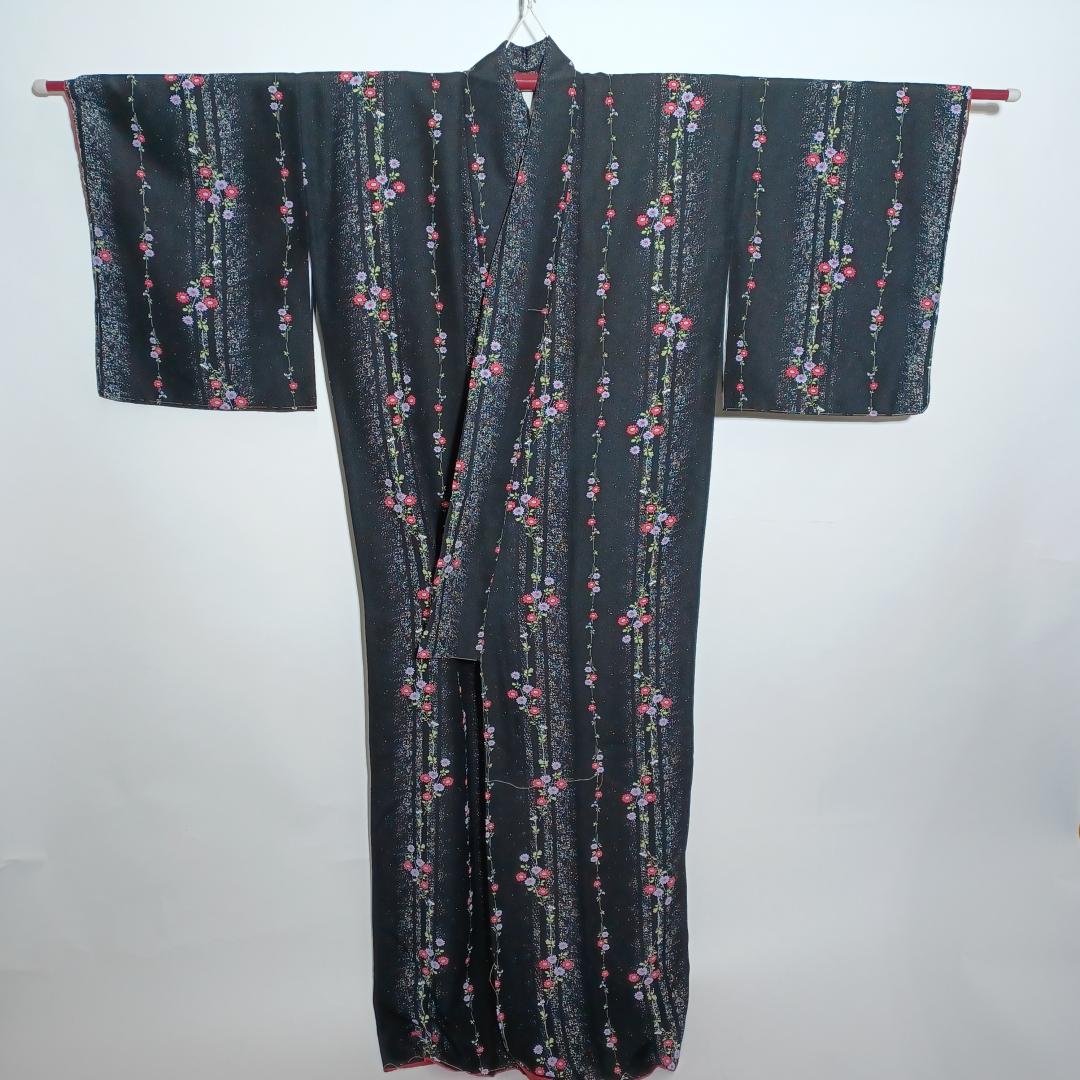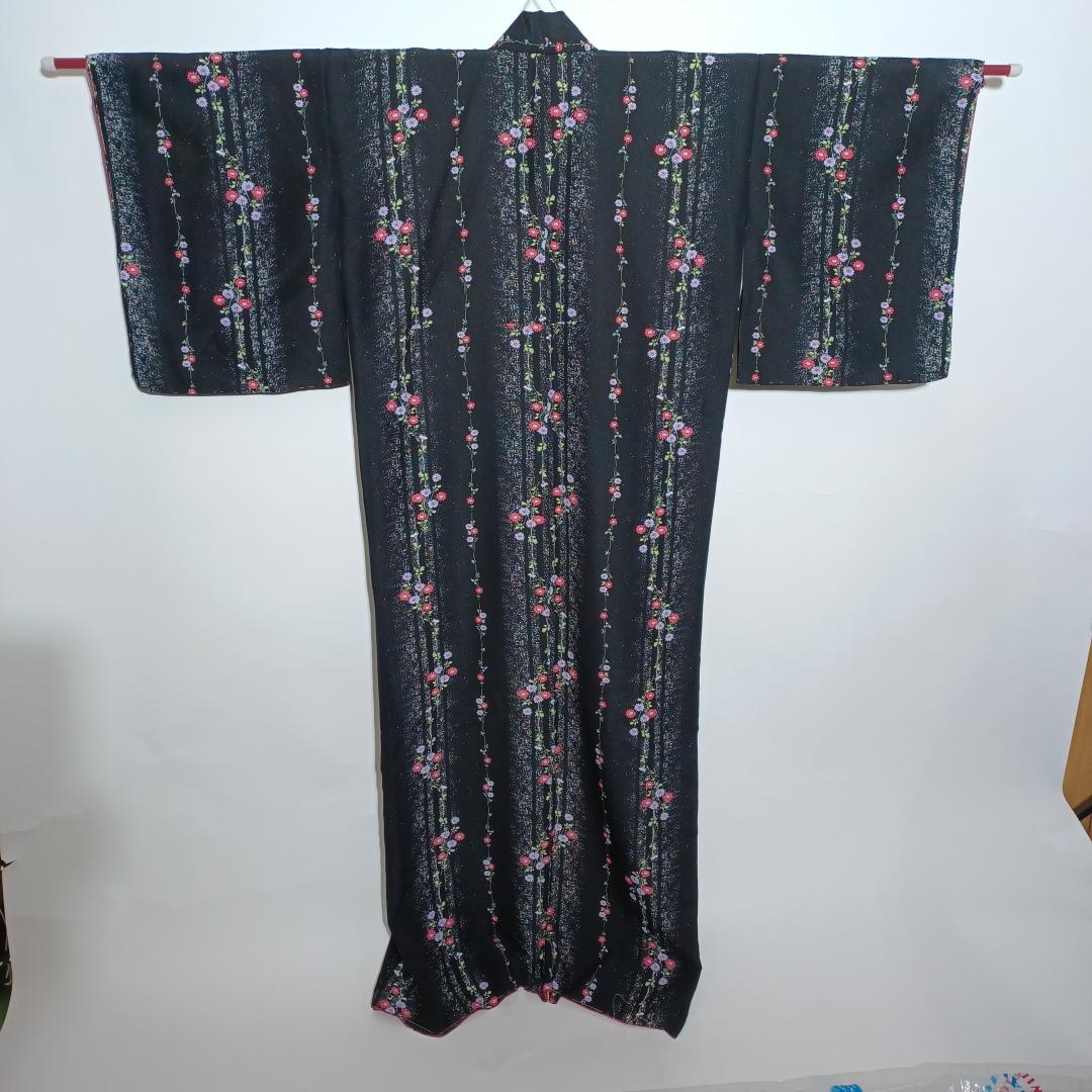 Used Japanese Vintage Kimono Black with Elegant Floral Pattern Traditional Robe for Women Silk Feel Classic Asian Fashion Length 165cm