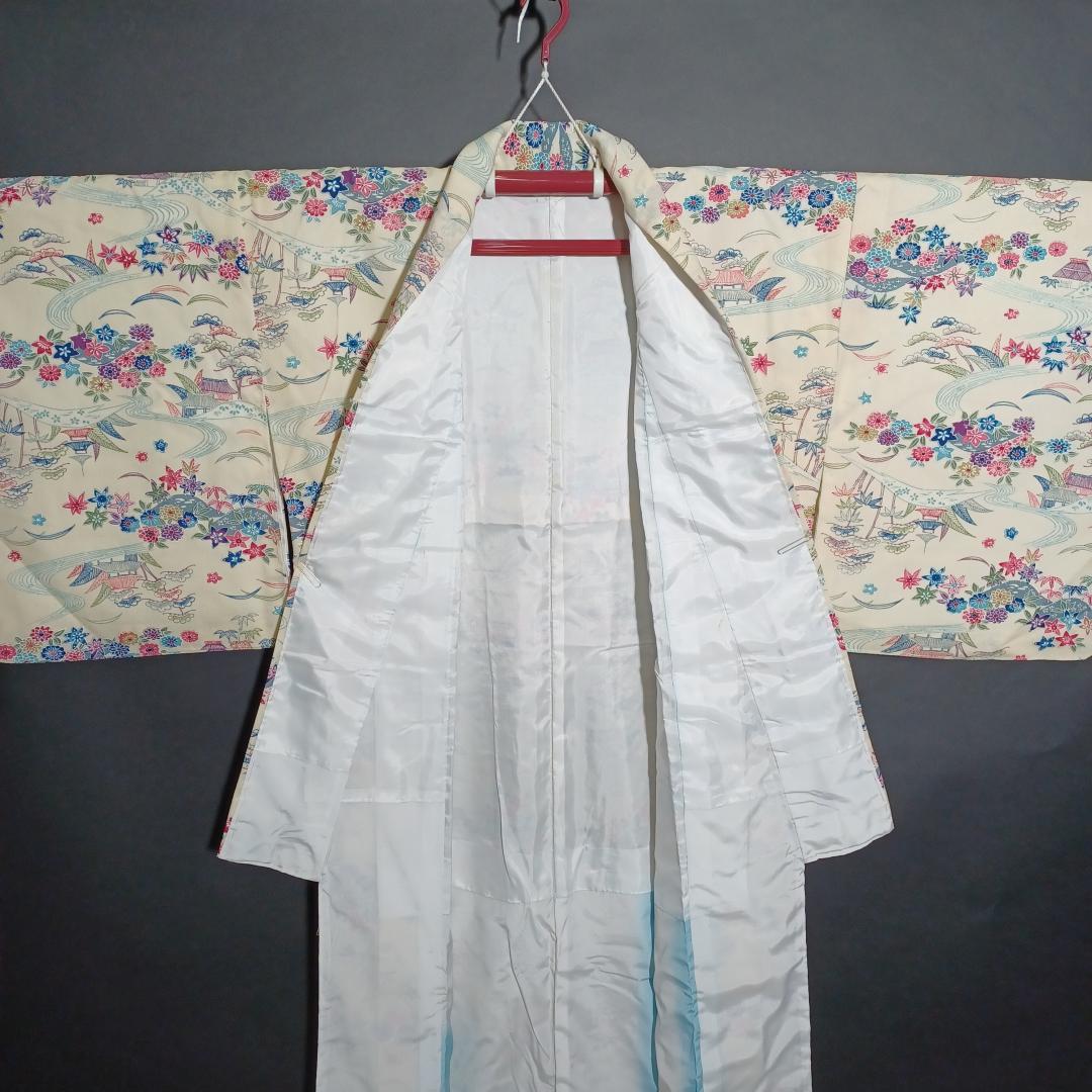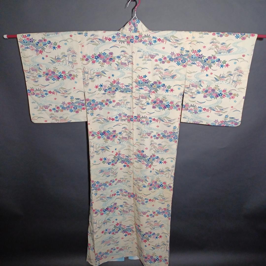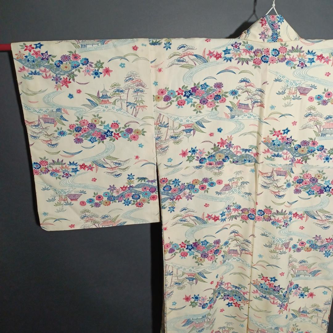 Used Japanese Vintage Kimono Cream White with Elegant Pine & Floral Pattern Traditional Silk Feel Women's Robe Yukata Height 151cm