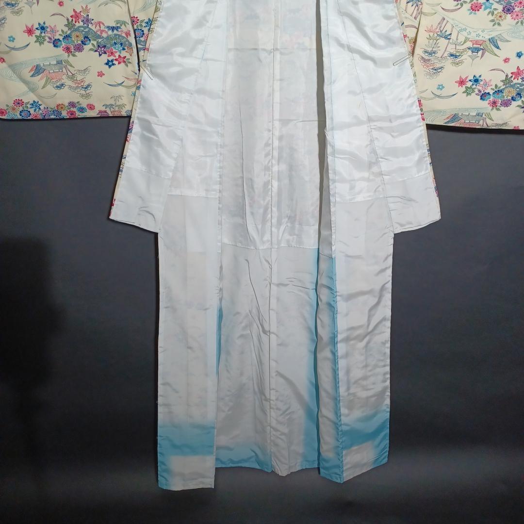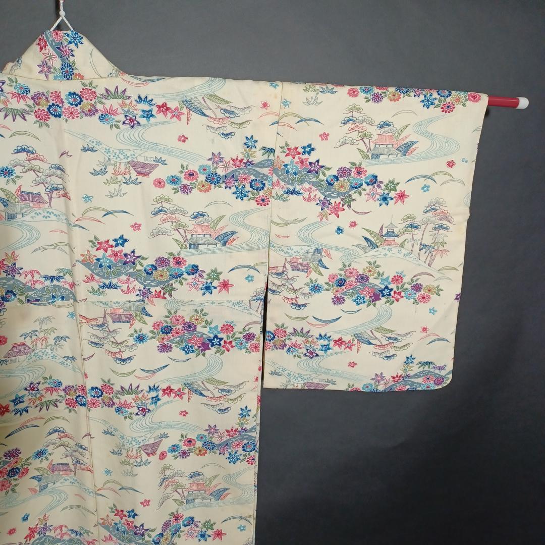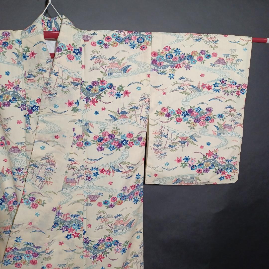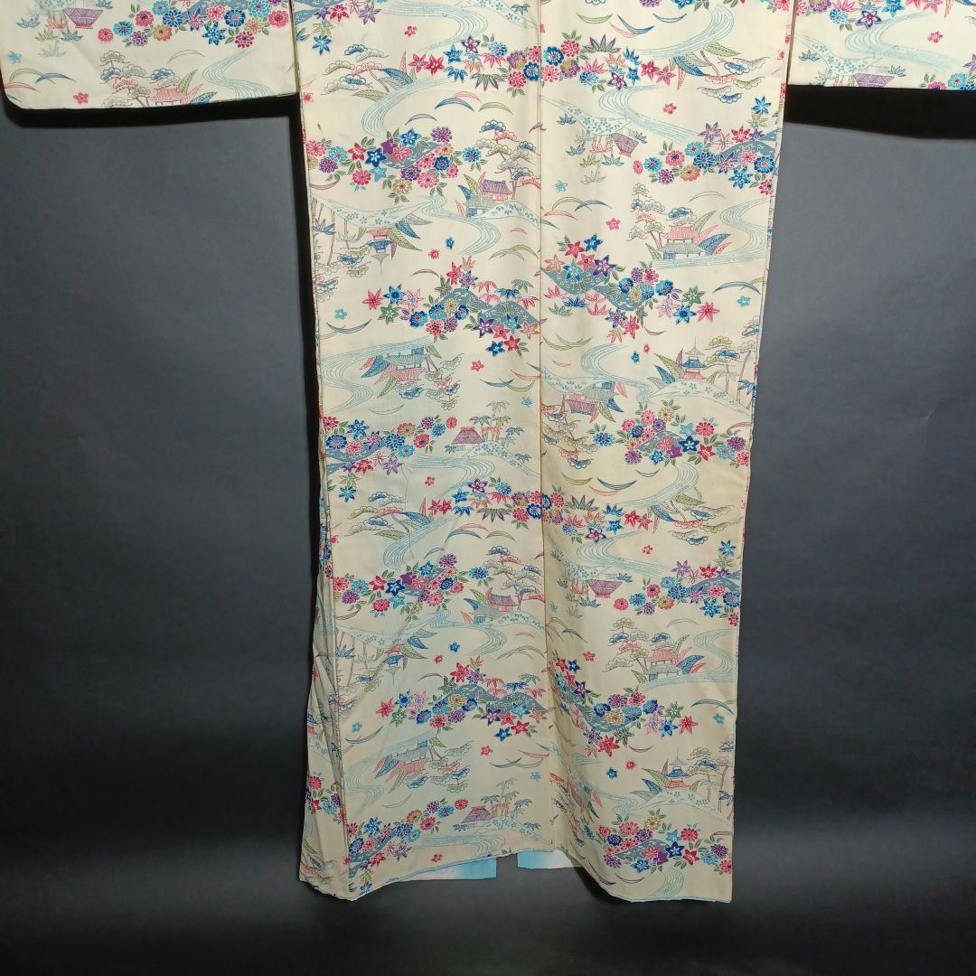 Used Japanese Vintage Kimono Cream White with Elegant Pine & Floral Pattern Traditional Silk Feel Women's Robe Yukata Height 151cm