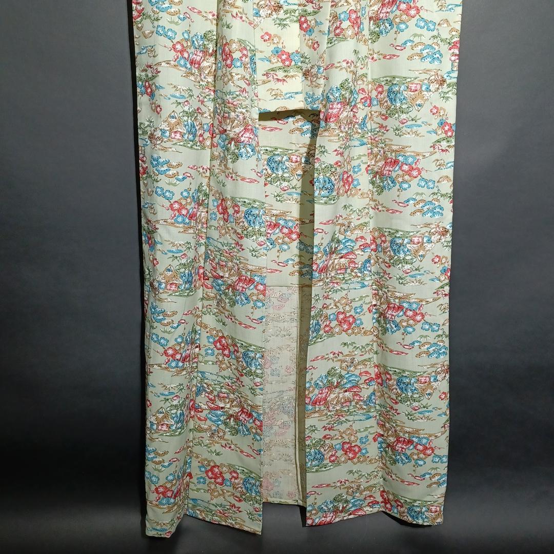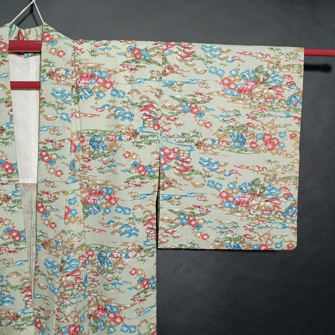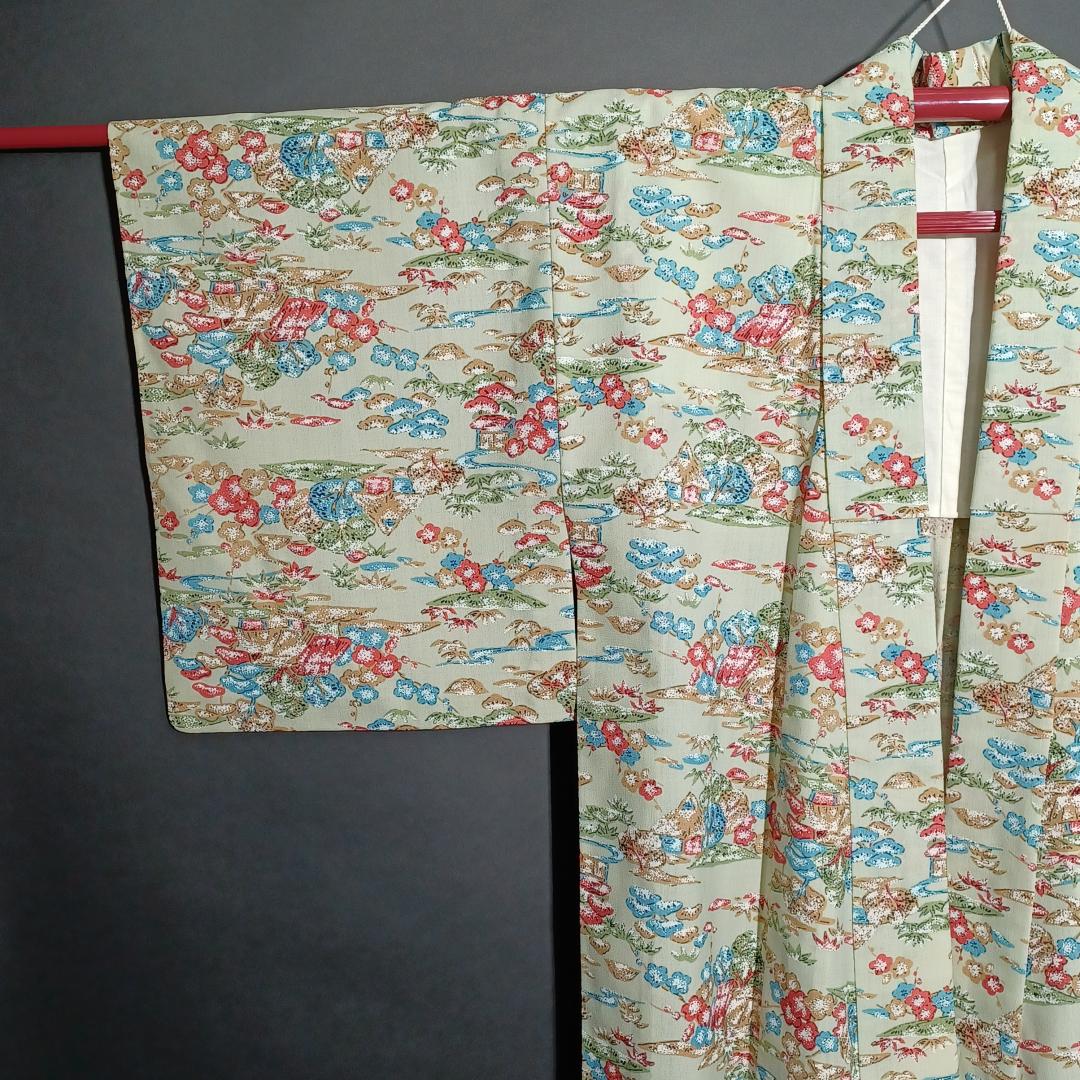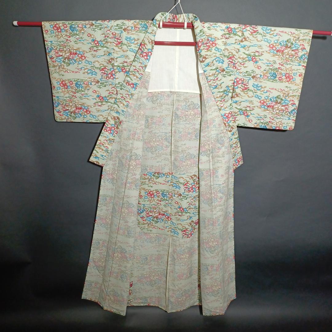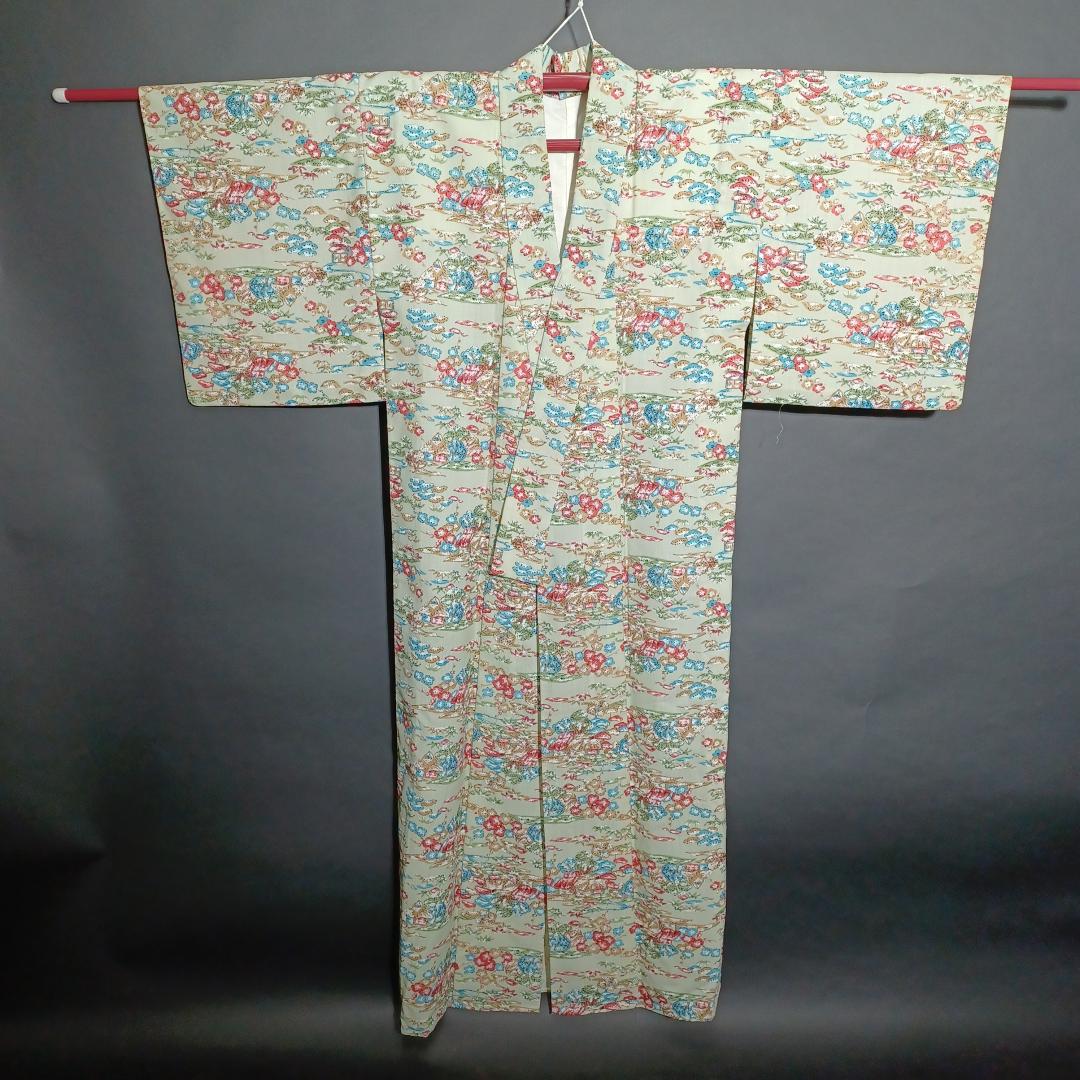 Used Japanese Vintage Kimono Pale Green with Elegant Floral Pattern Traditional Silk Women's Robe Kimono Dress Long Gown Height 150cm 59in