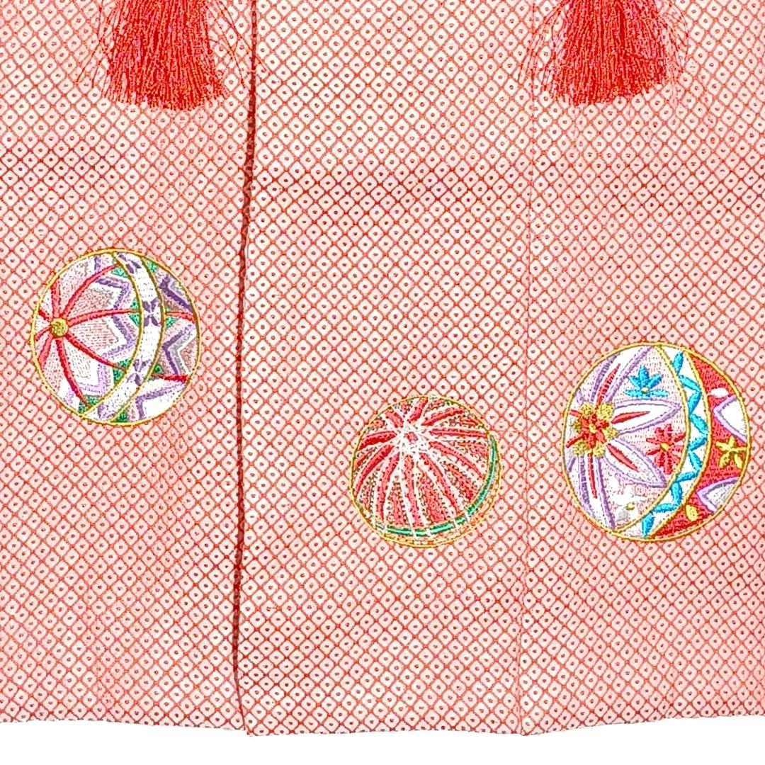 Complete a traditional look with this charming vintage Hifu vest, specifically designed for a girl's Shichi-Go-San (3-year-old celebration). This piece features a classic color combination of white and red, adorned with beautiful "Temari" (traditional embroidered handball) patterns, which symbolize harmony and a happy future. Made from comfortable cotton, it is soft and easy for young children to wear.